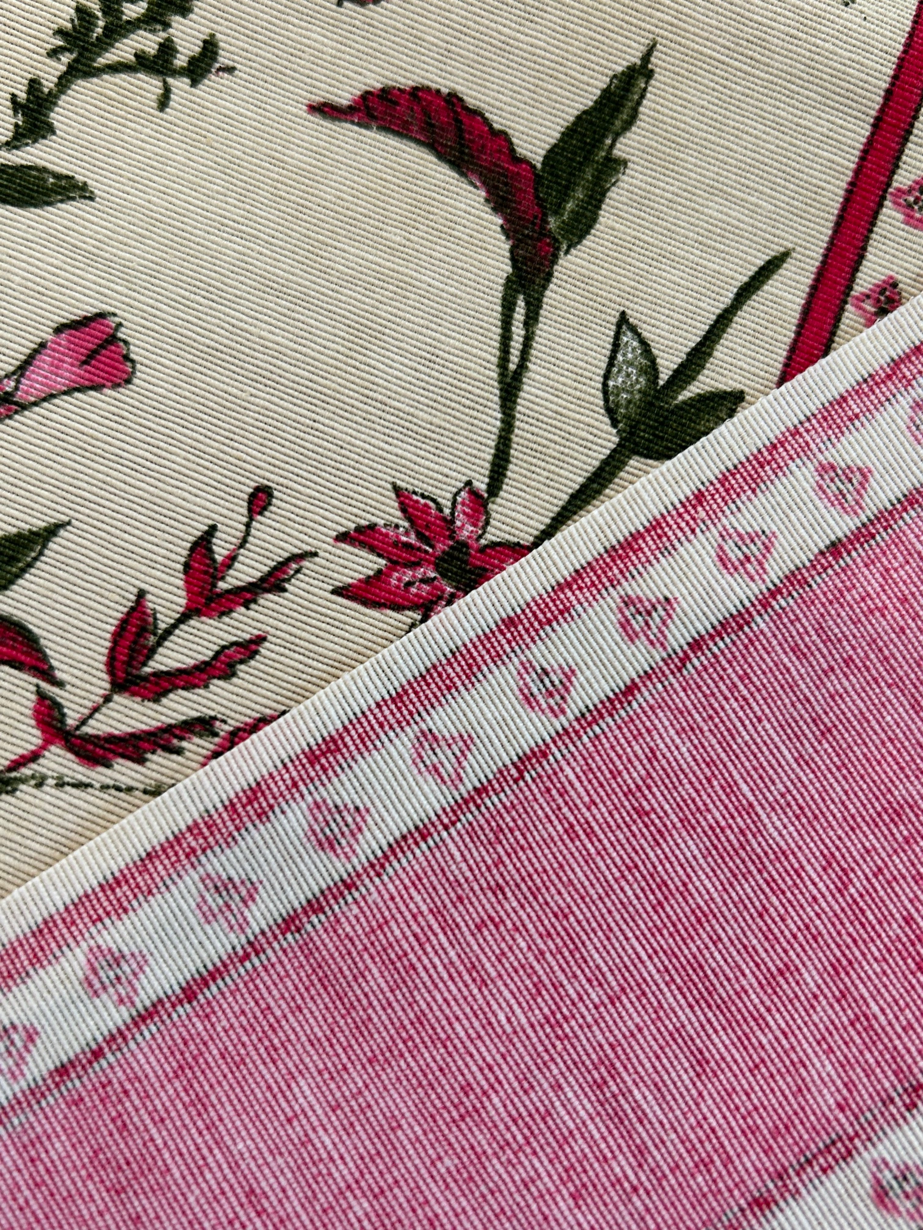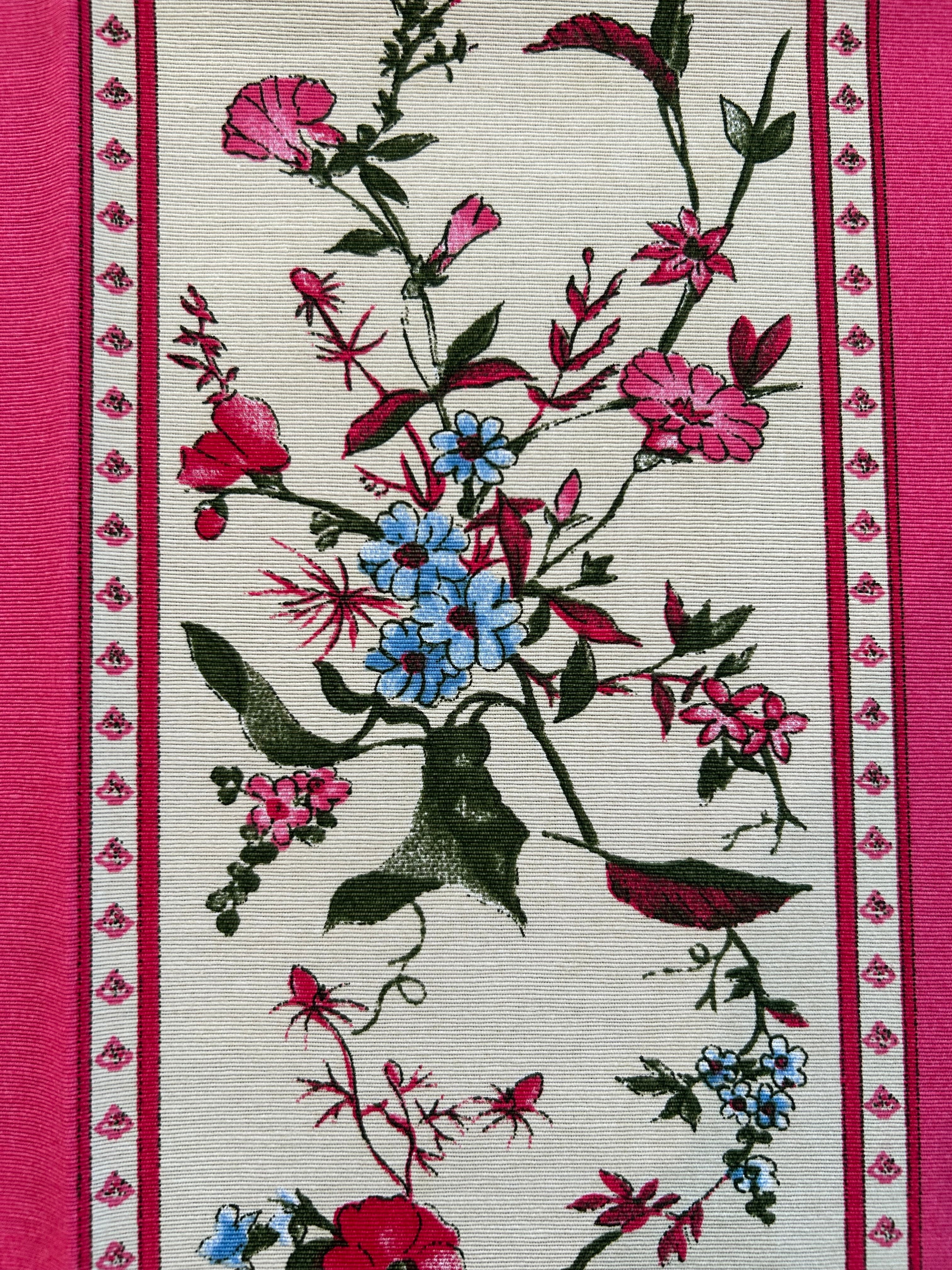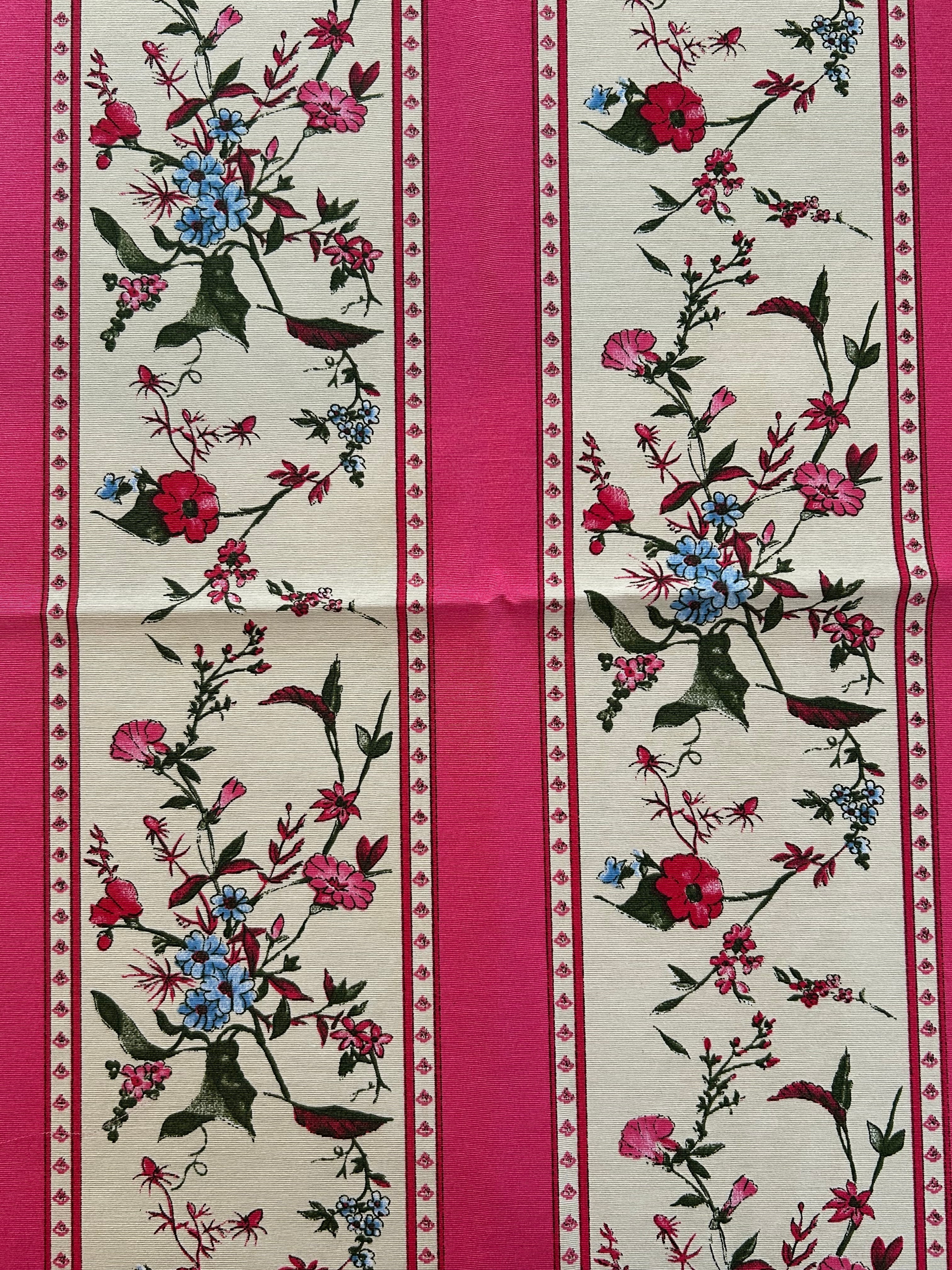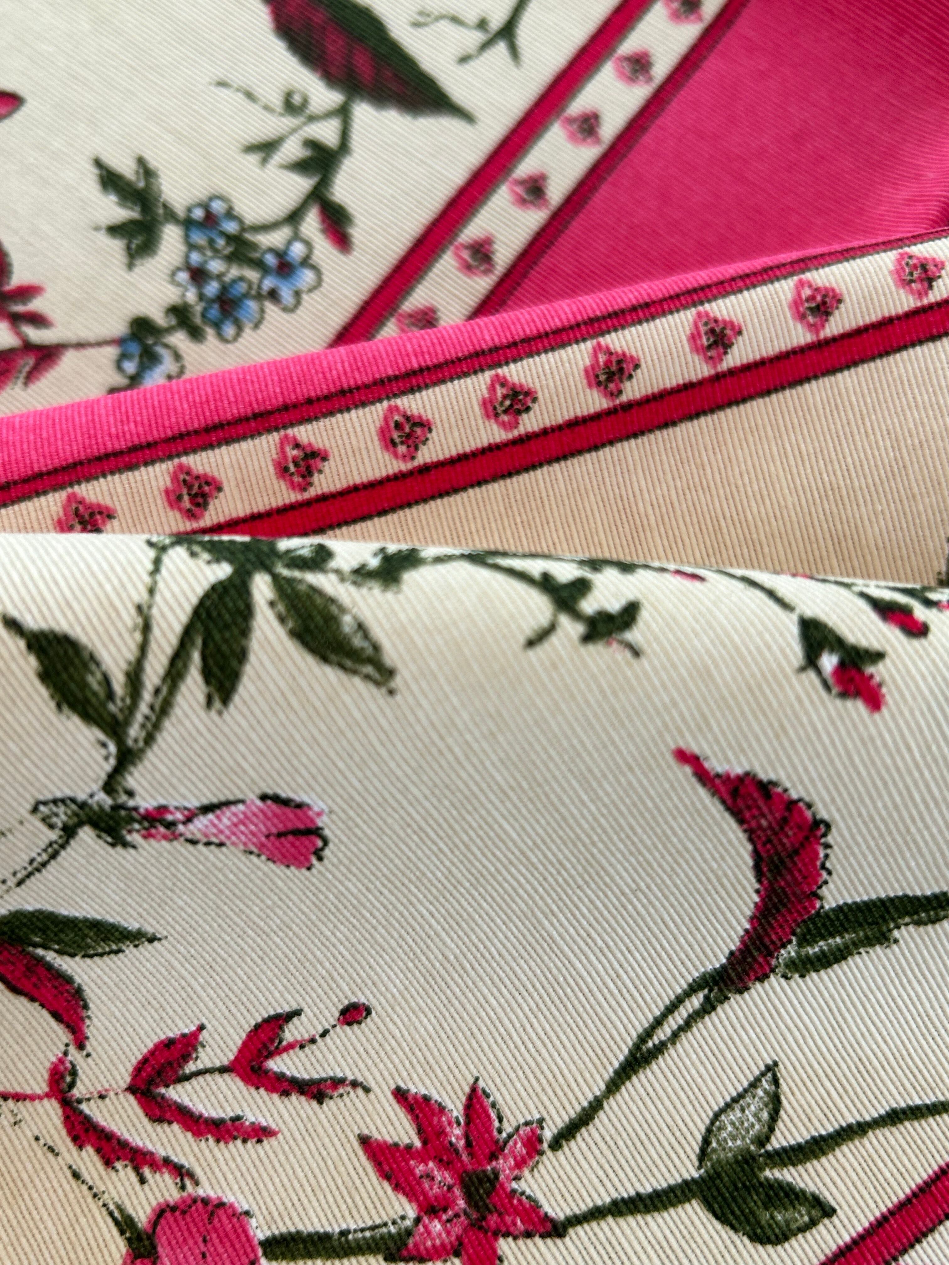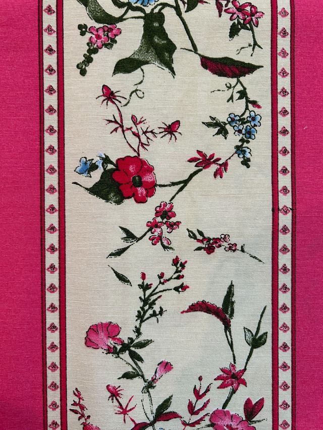 発色の良いピンクカラーのストライプ、美しい花柄が大変オシャレでフランスらしいデザインのファブリックです。
