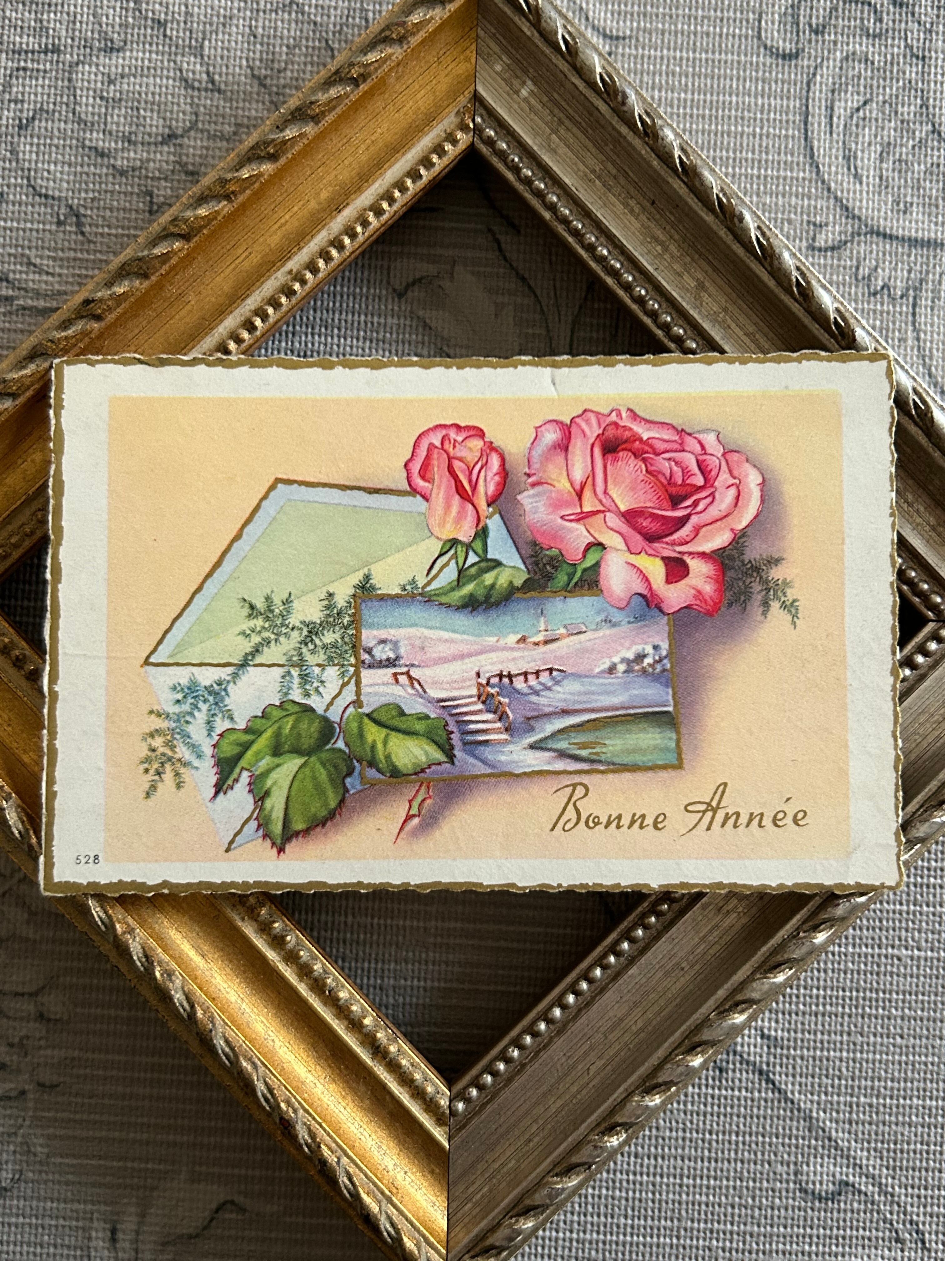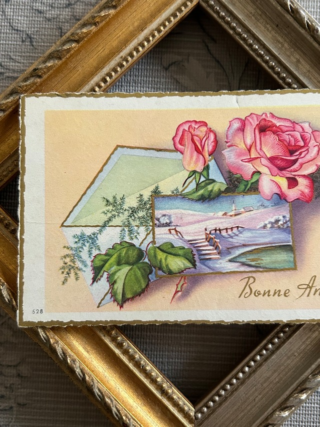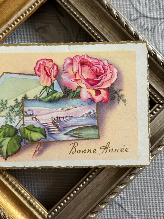 アンティークメッセージカード Bonne Anee Rose 薔薇 フランス 農村の風景 額装 インテリア小物