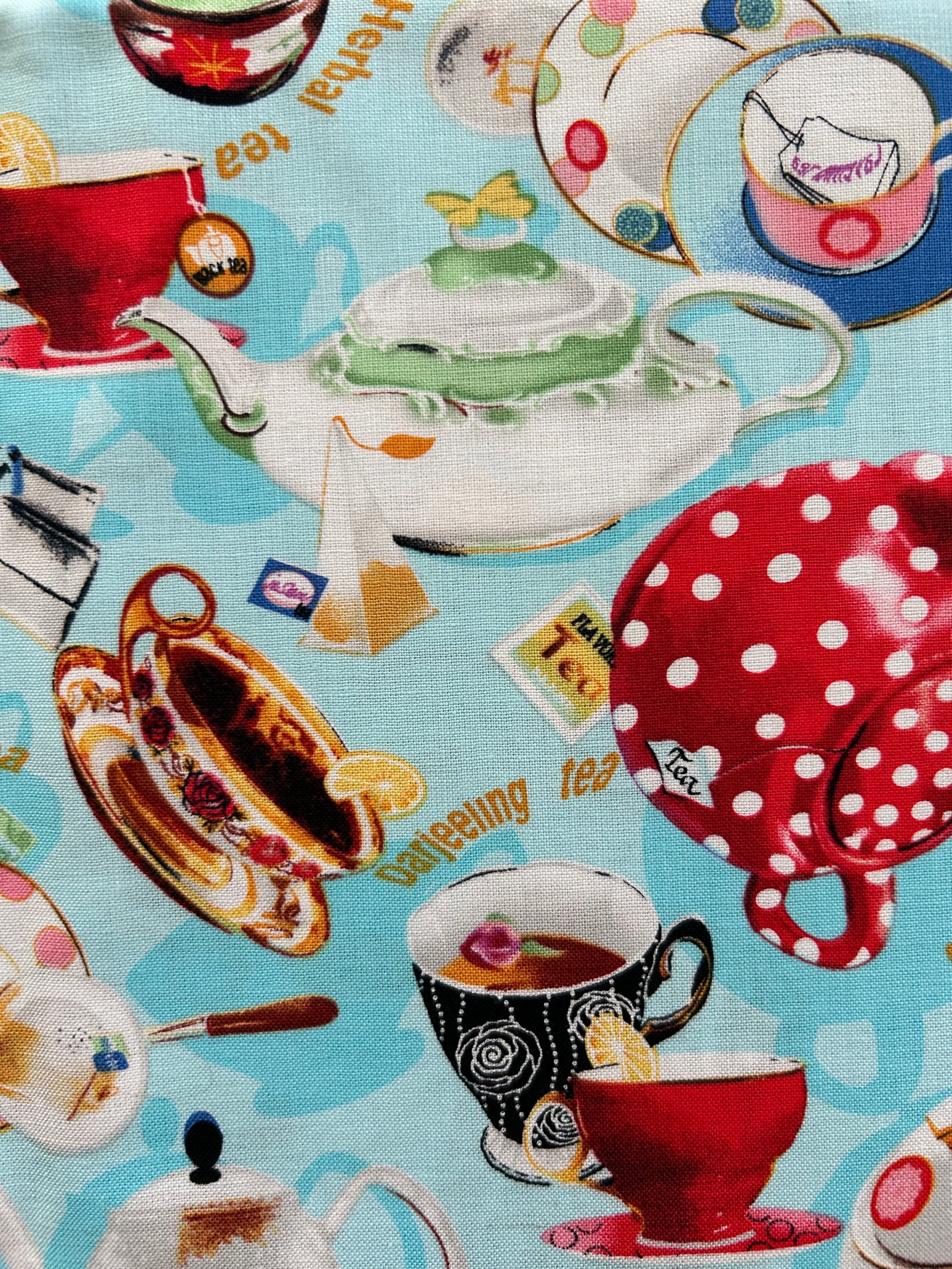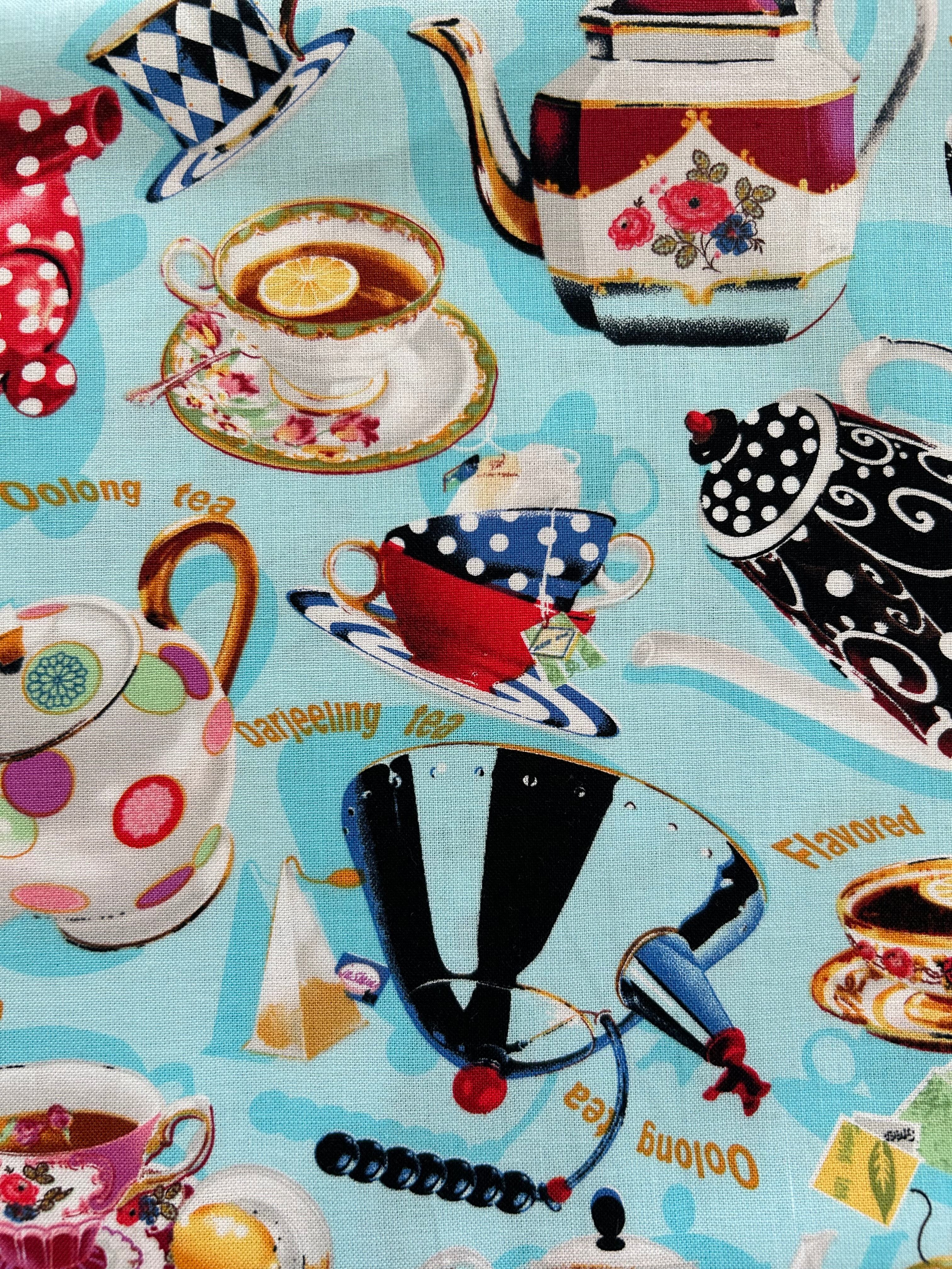 輸入コットンファブリック Tea For Two ライトブルー カップ&ソーサー ポット柄 カルトナージュ