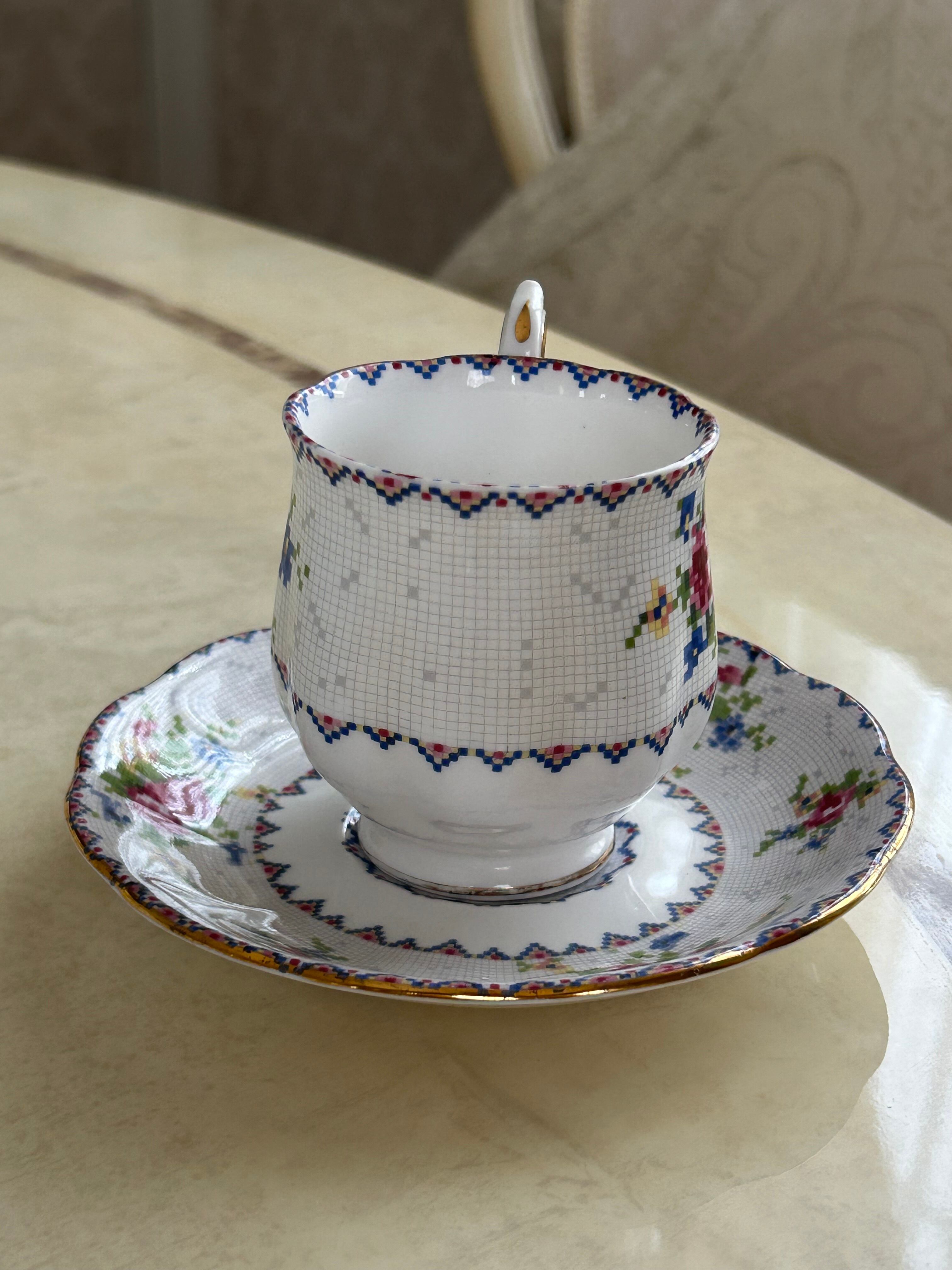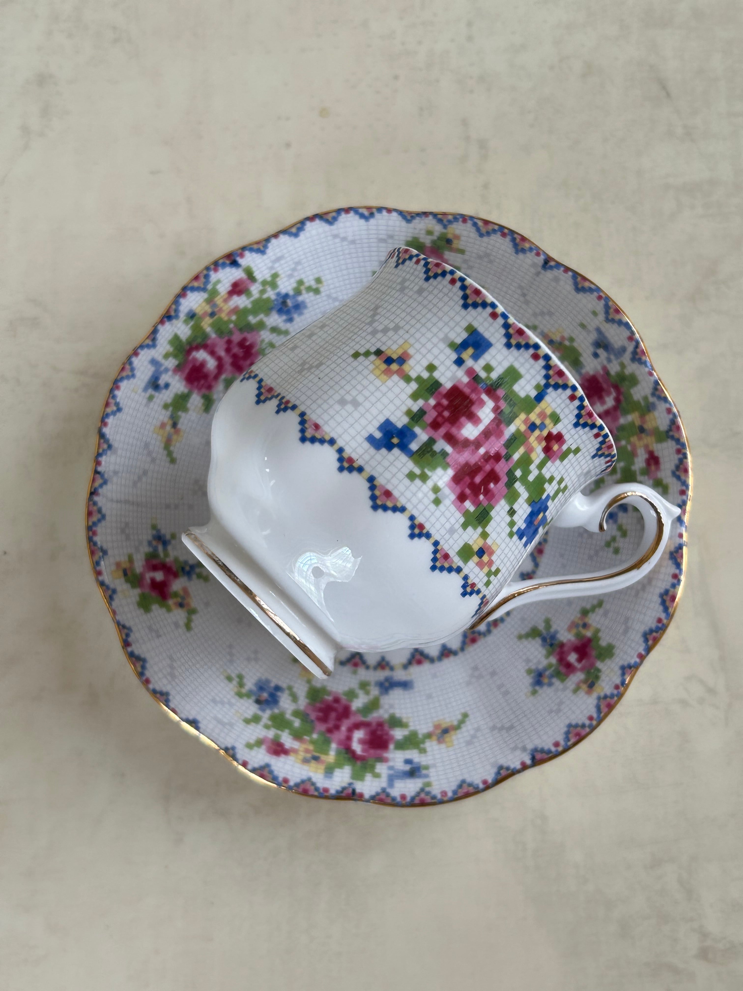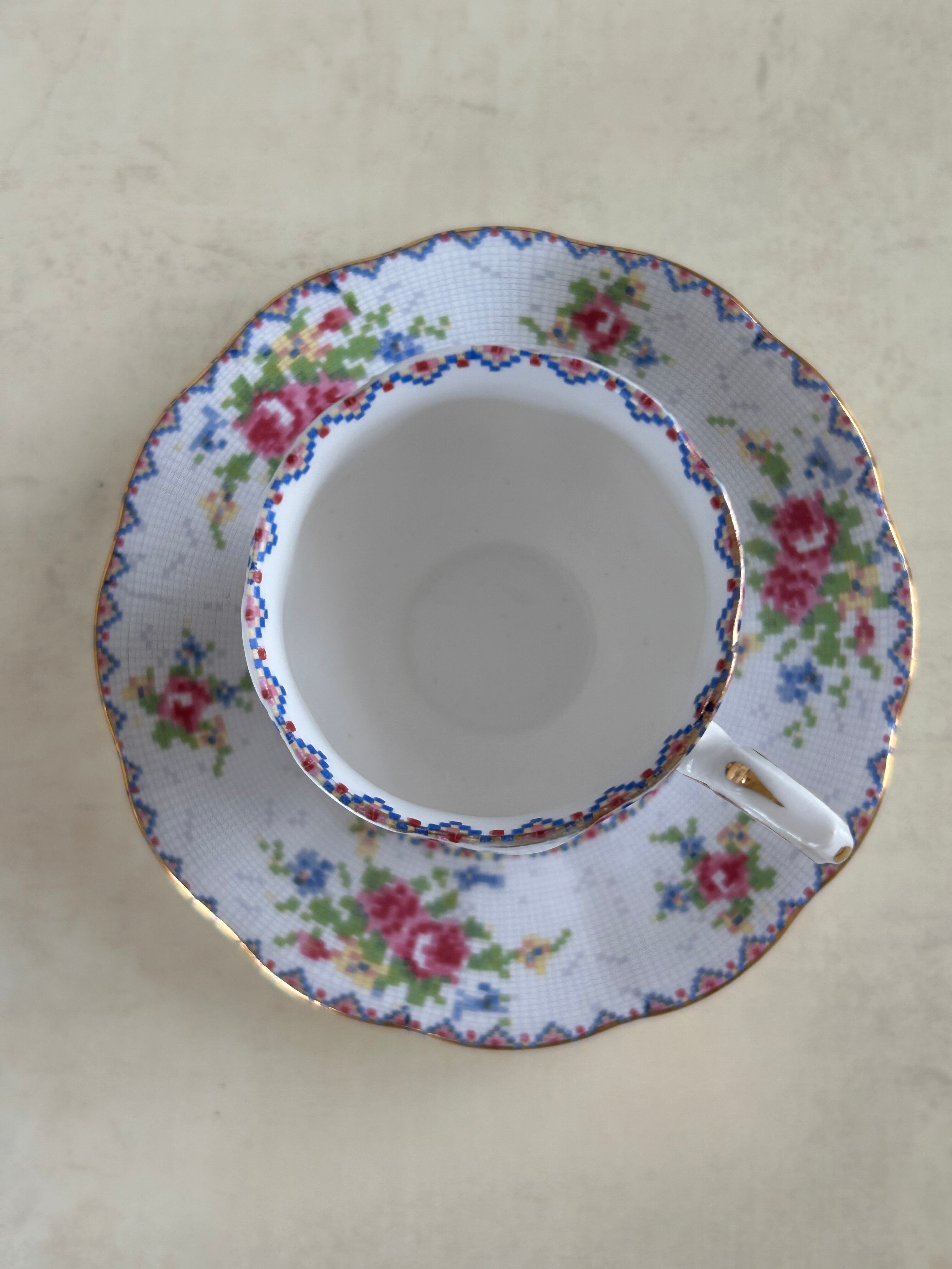 英国Vintage ROYAL ALBERT ロイヤルアルバート プチポワン デミタスサイズ カップ&ソーサー 刺繍柄 テーブルウェア