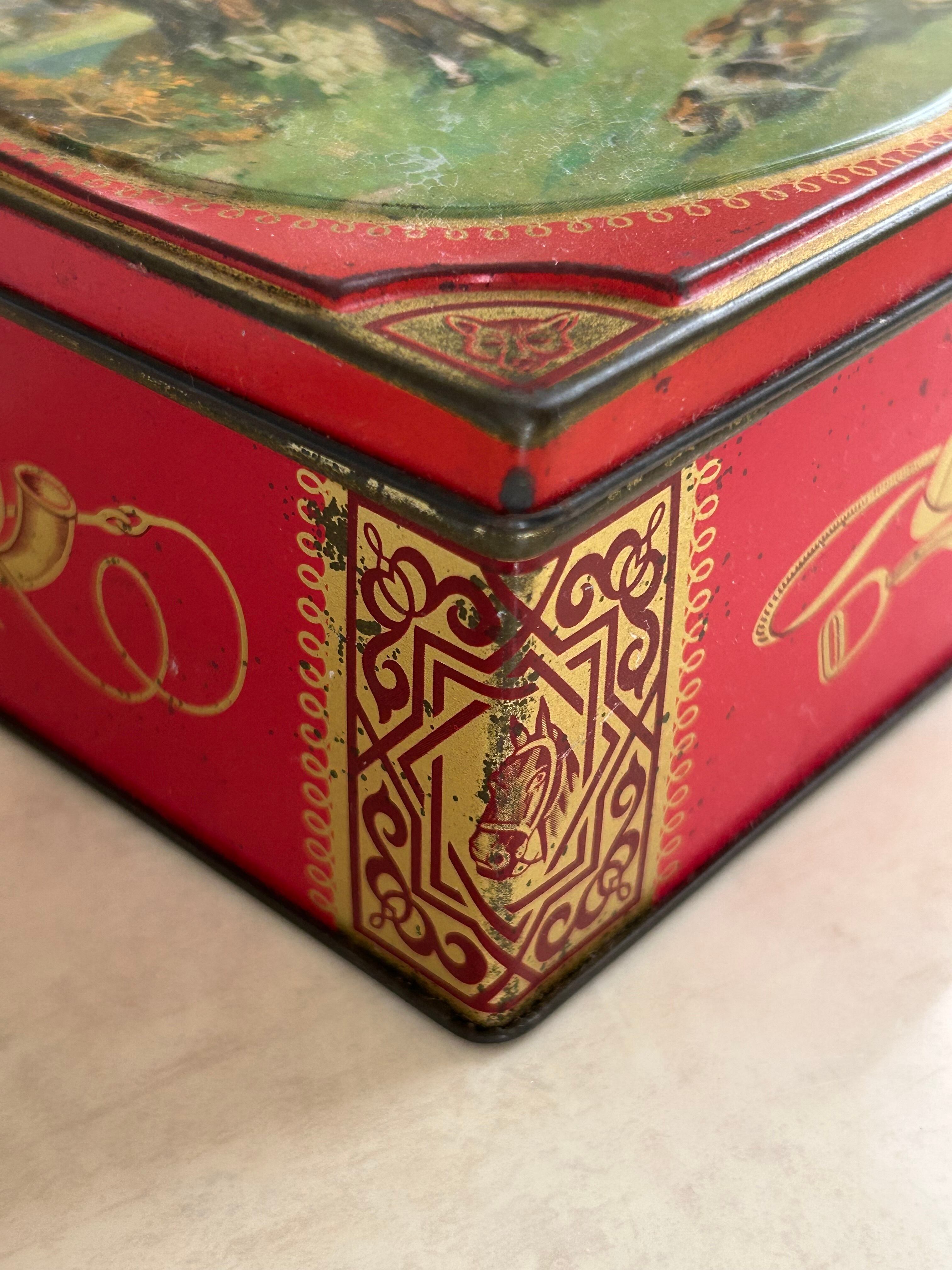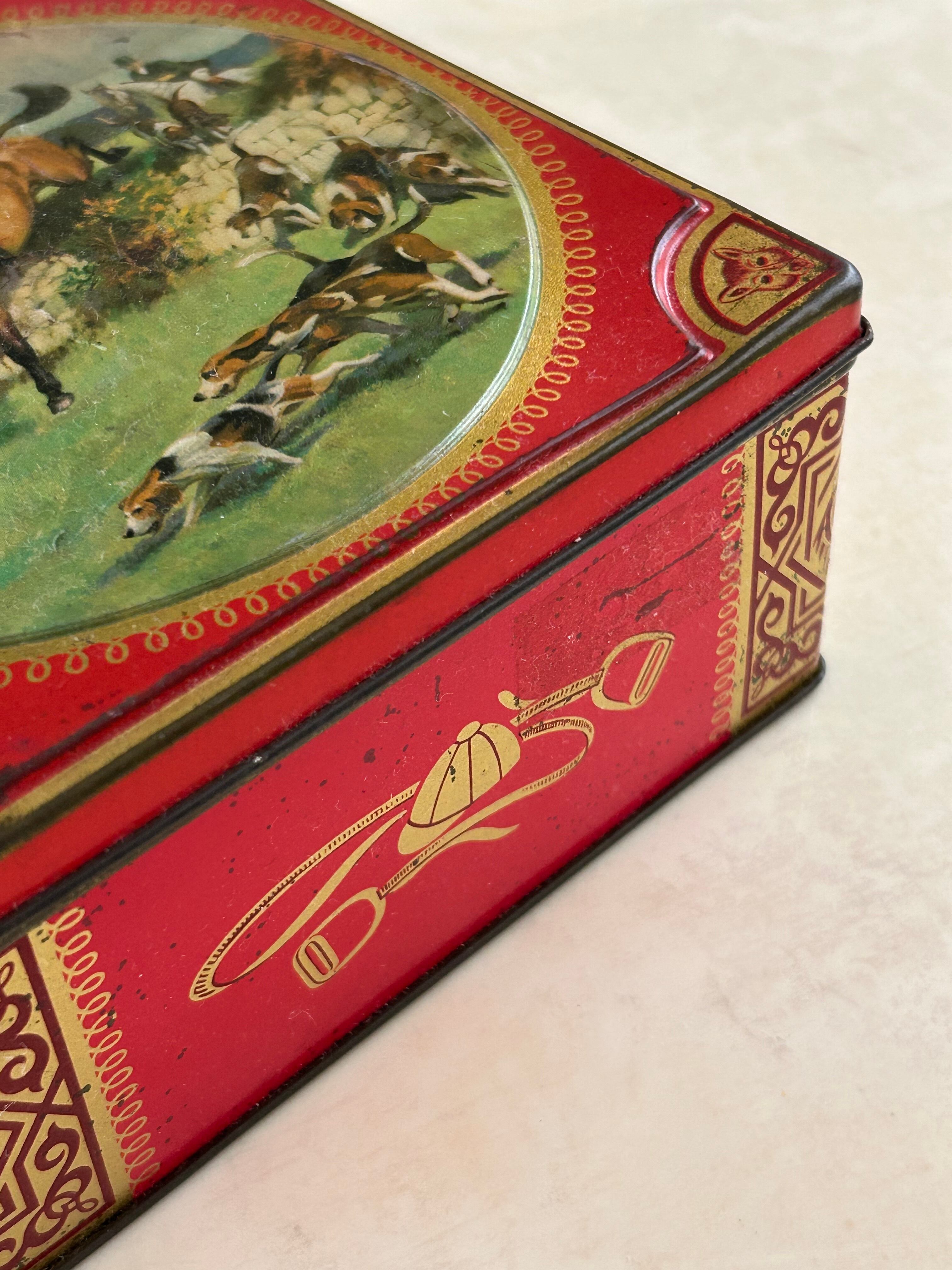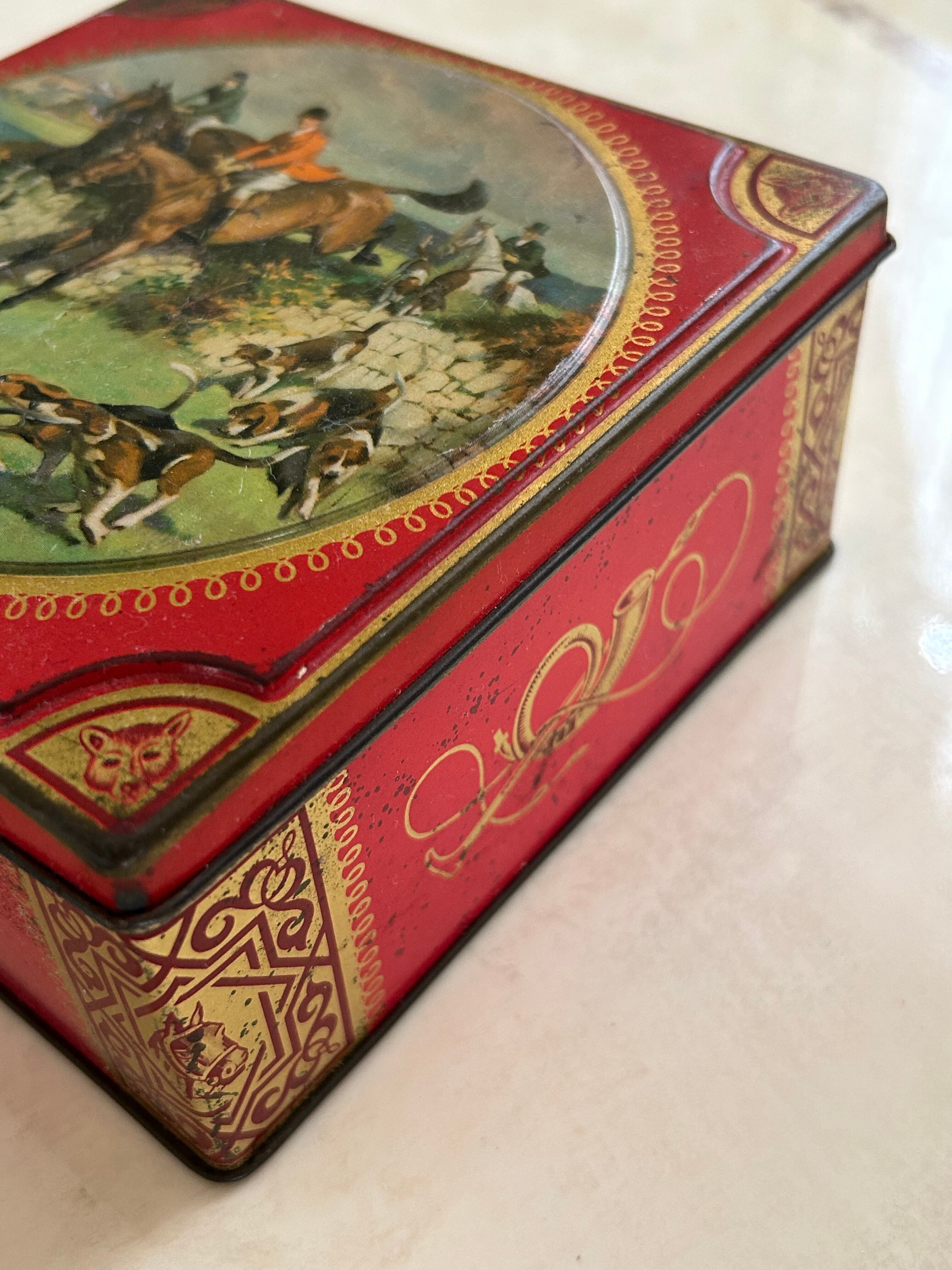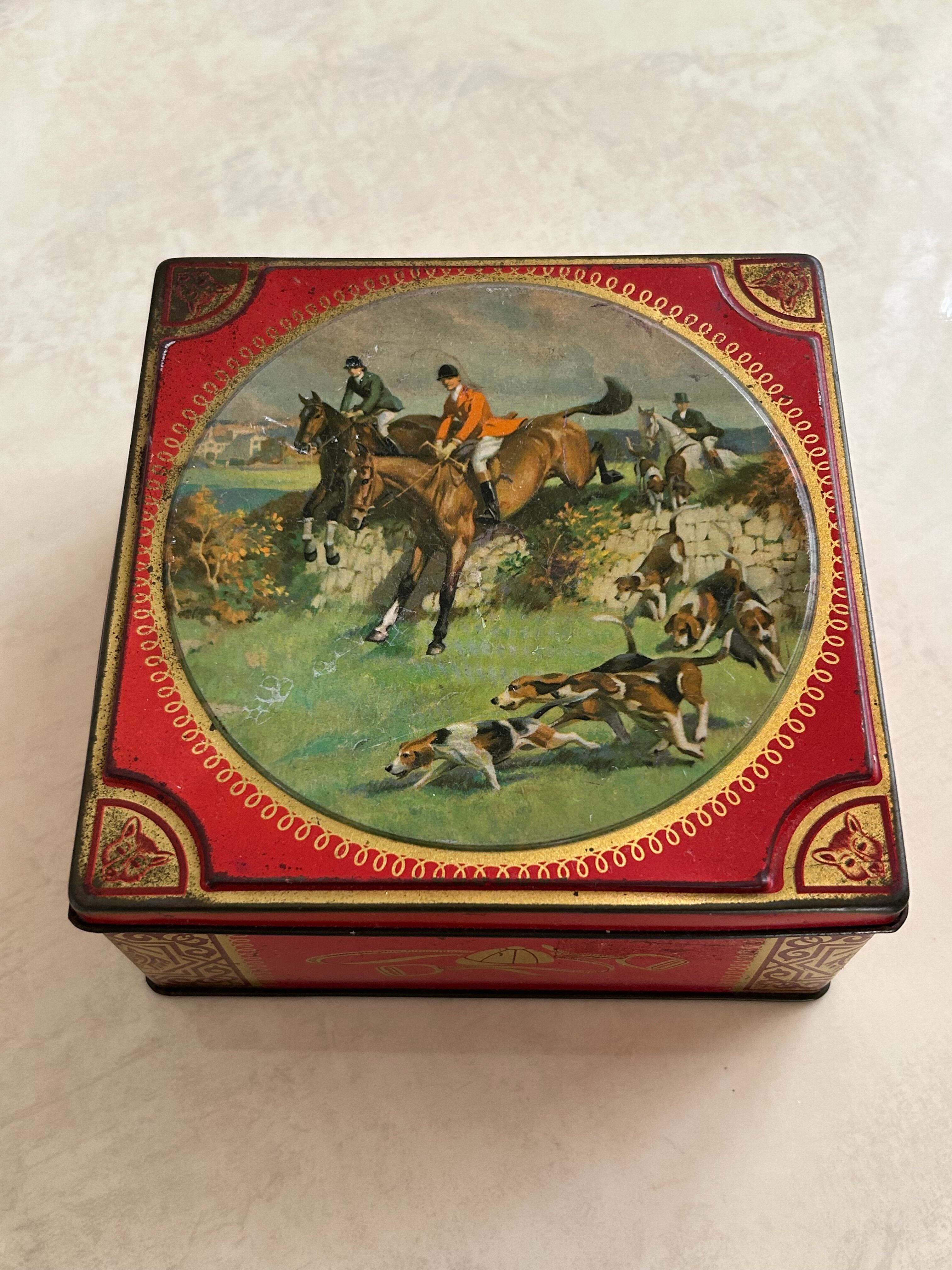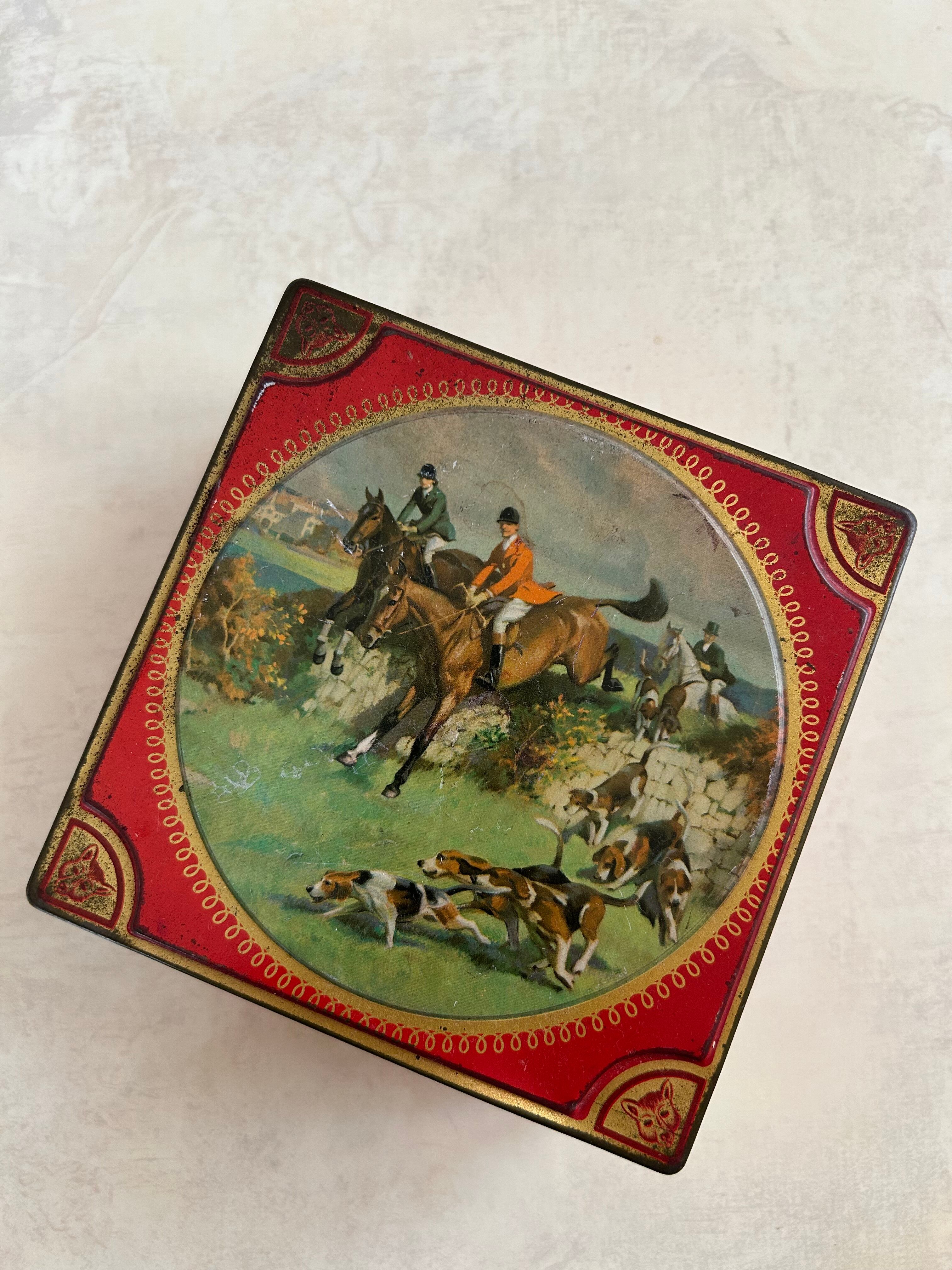 英国Vintage Tin ティン缶 Thornes社 ハンティング柄 トフィー缶 スクウェア型 小物入れ インテリア 撮影小物