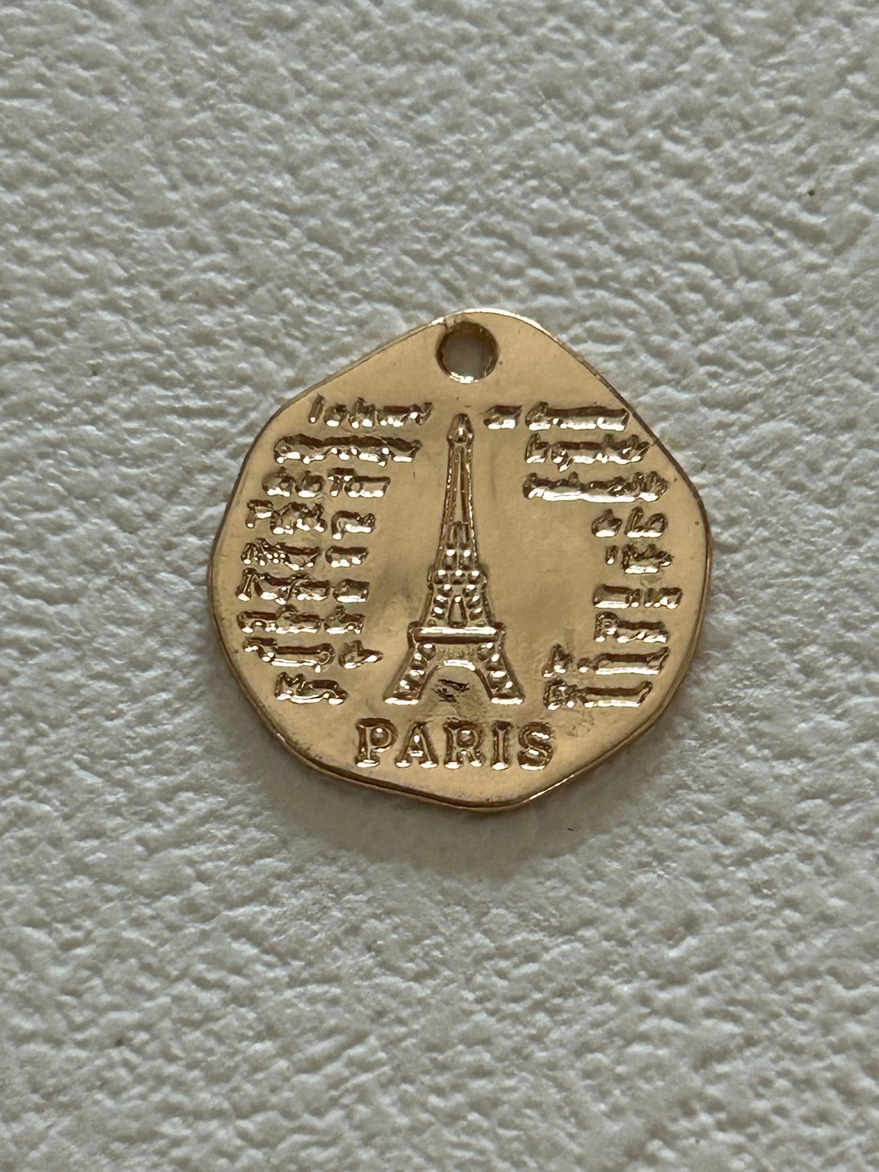 ゴールドカラーのプレートにエッフェル塔やParisなどの文字が刻印されたラベル型パーツです。