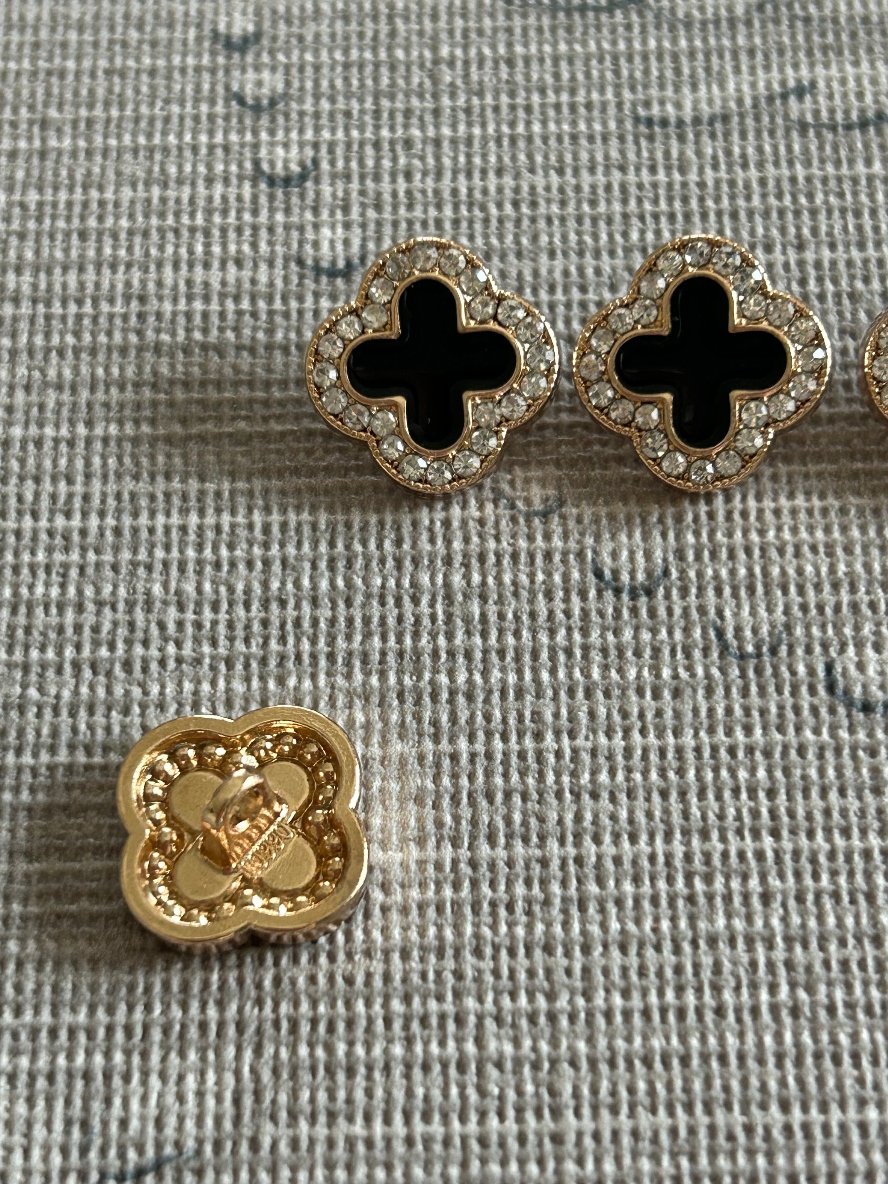 キラキラ、ストーンの輝きが美しくゴールドの輝き×ブラックの配色がゴージャスエレガントなクローバーモチーフのボタンです。