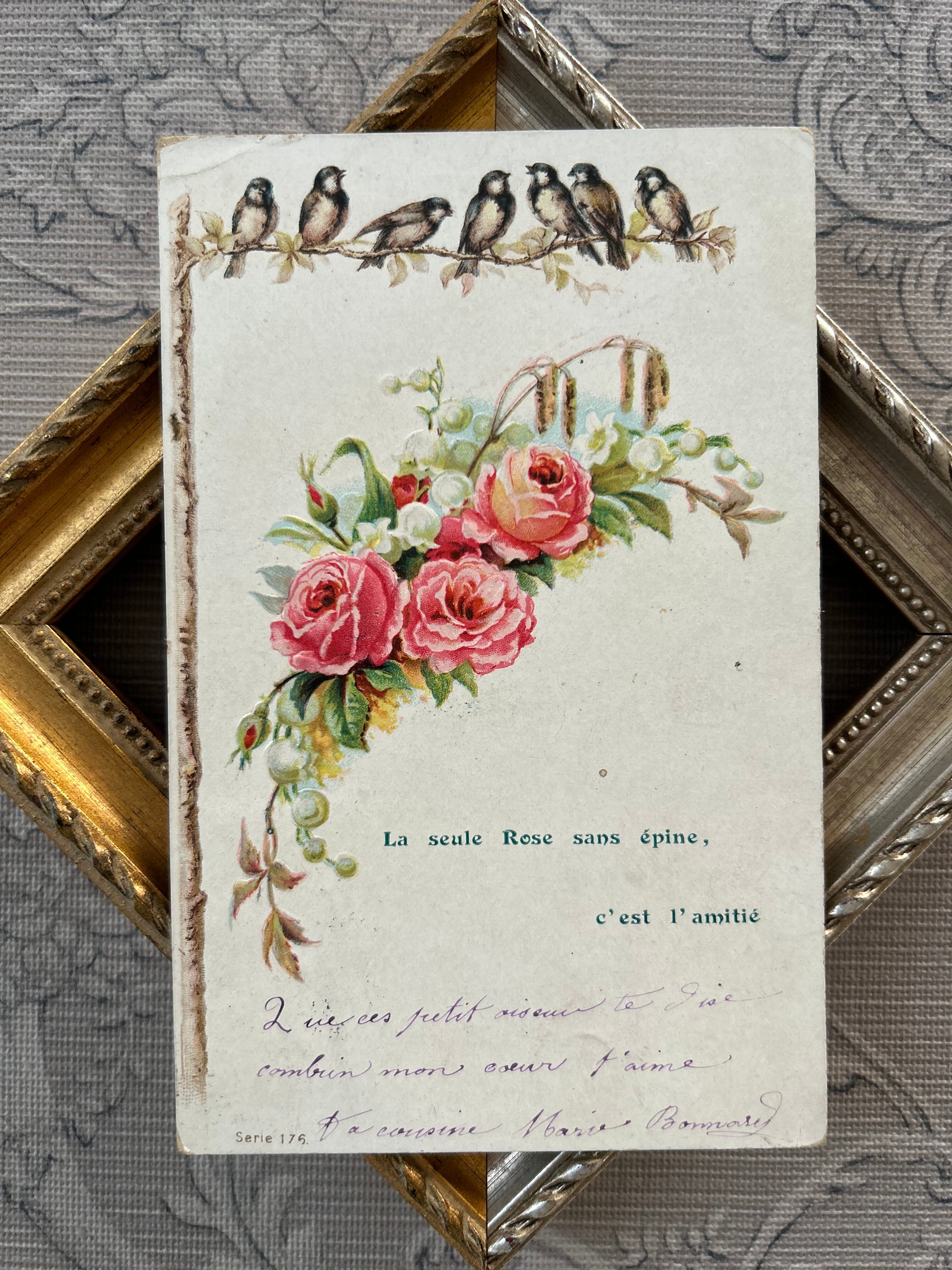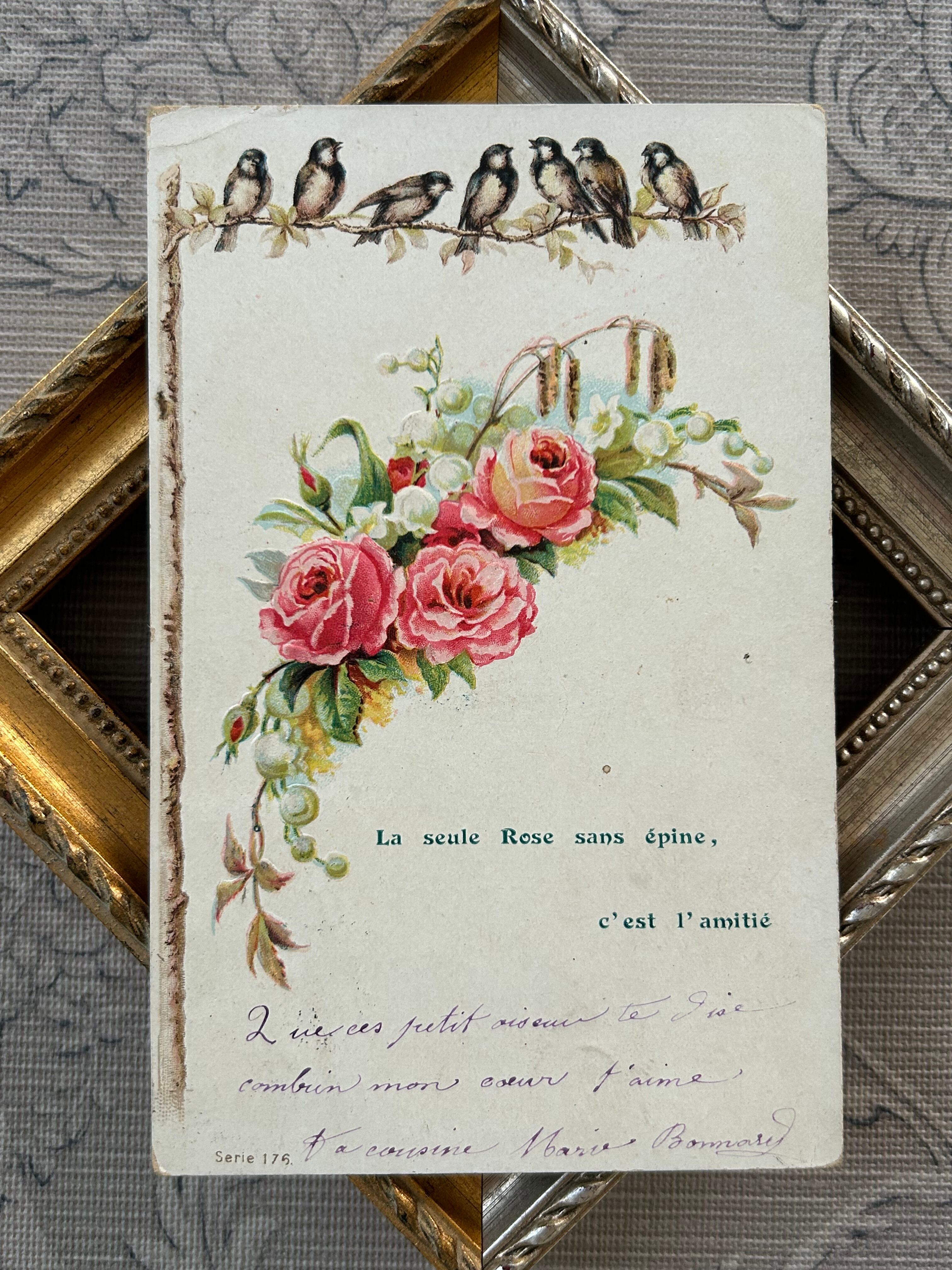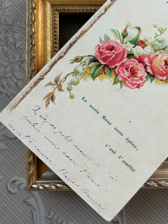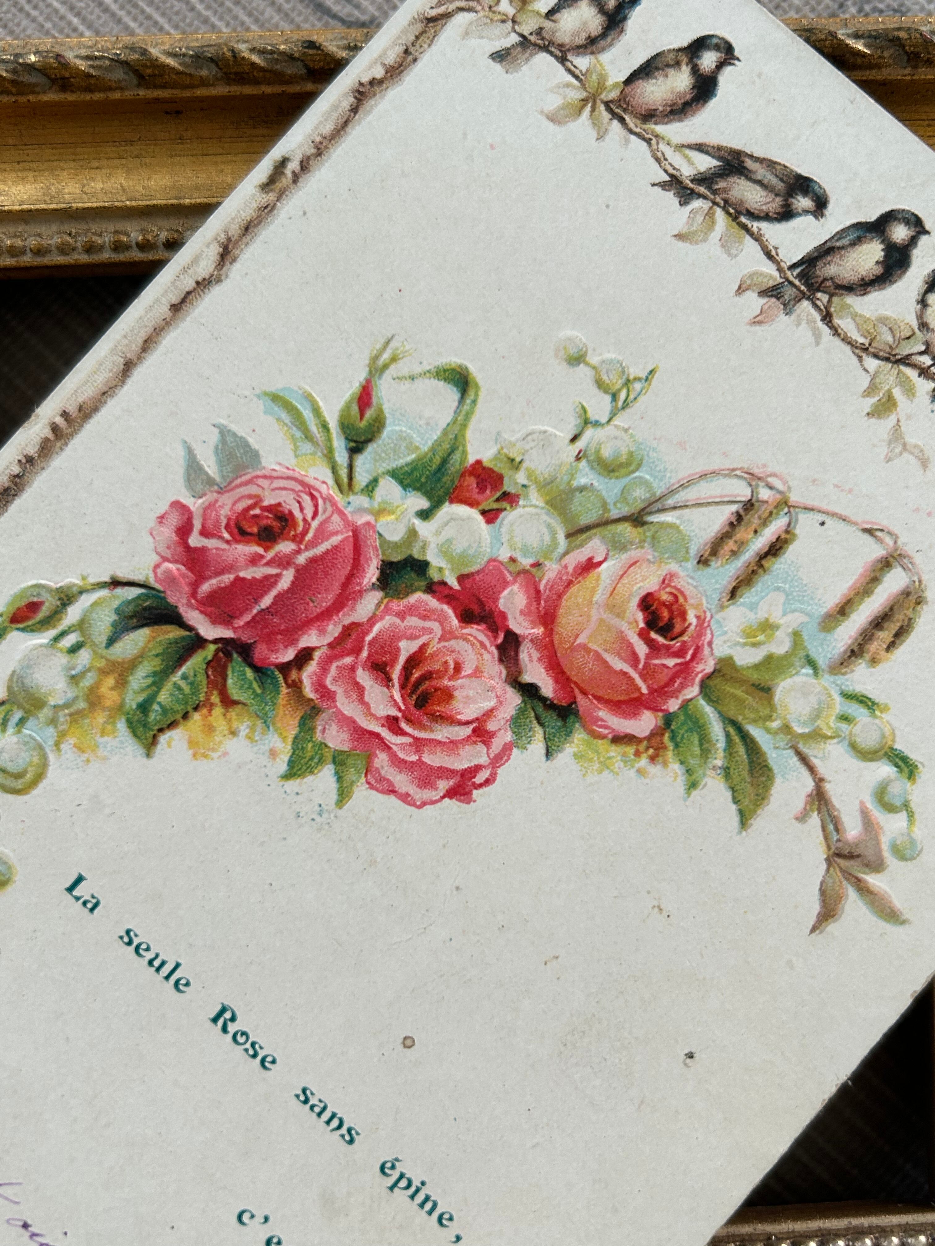 フランス アンティークポストカード MuguetとRose ツバメ すずらん エンボス加工 額装 インテリア
