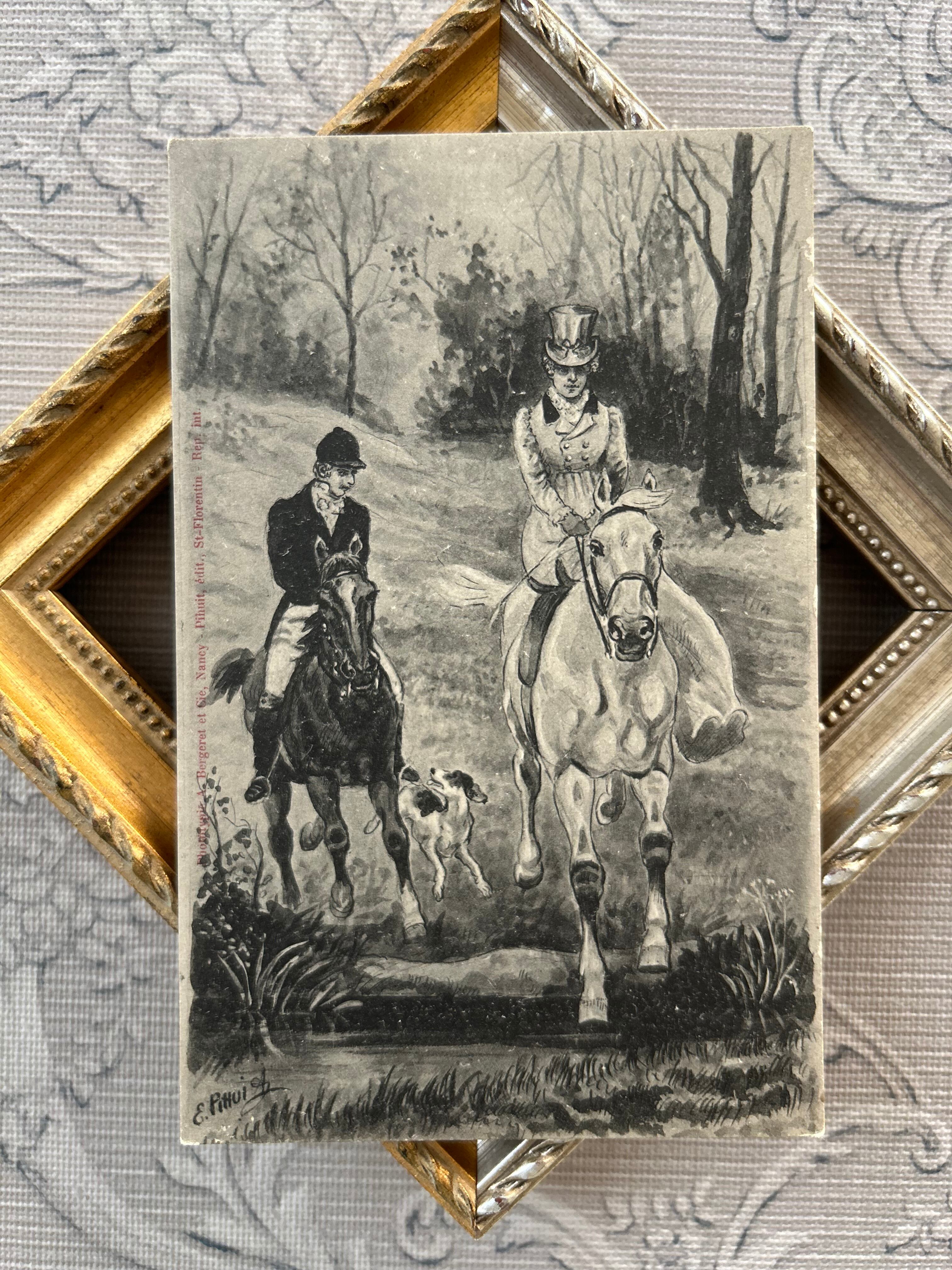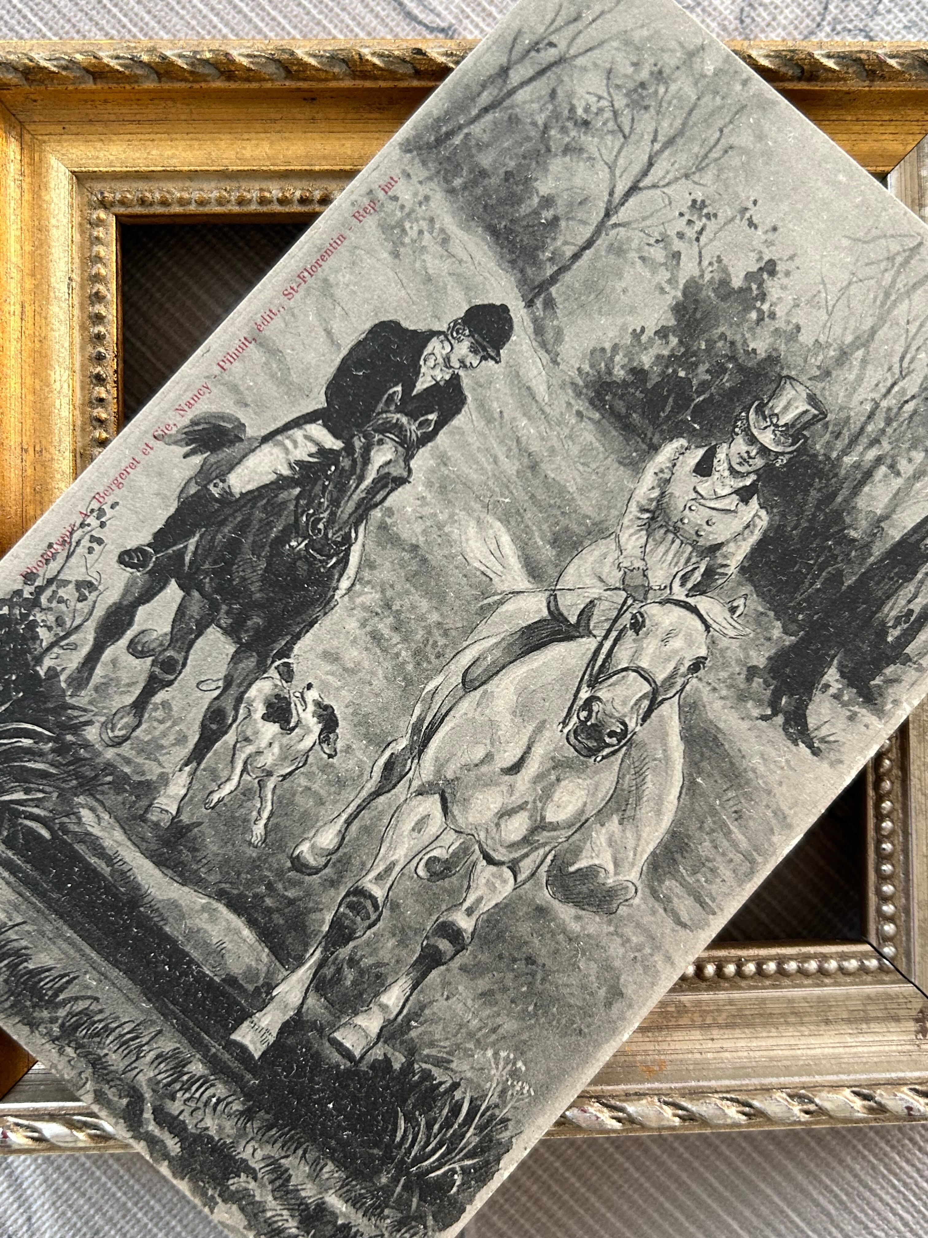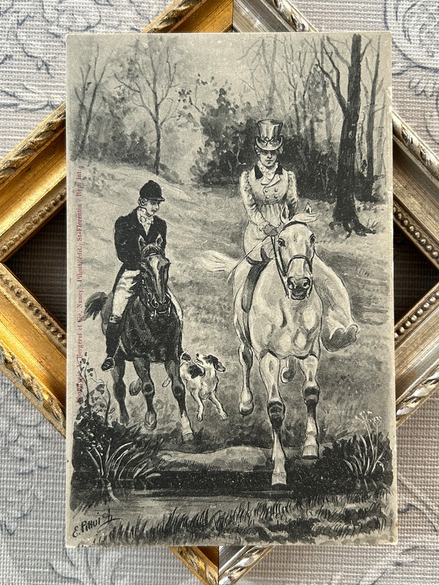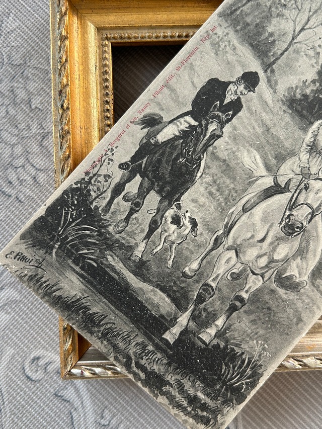 フランスアンティークカード 乗馬柄 未使用 額装 インテリア小物 撮影小物 セピアカラー インテリア小物 撮影小物 馬 ホース