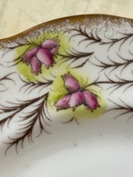 ボーンチャイナの白磁に絵付けされた紫がかったヘザーベルの花の絵柄。