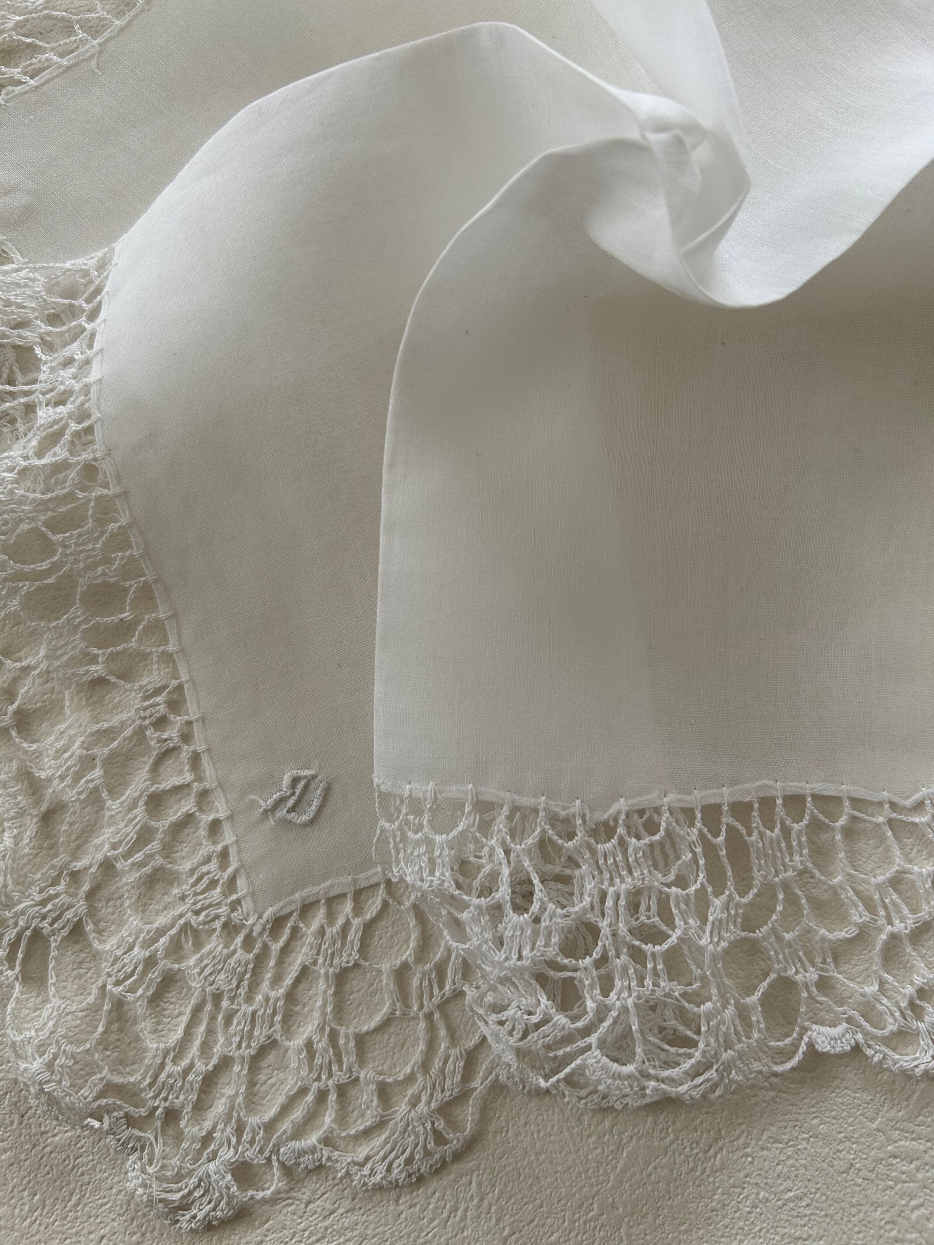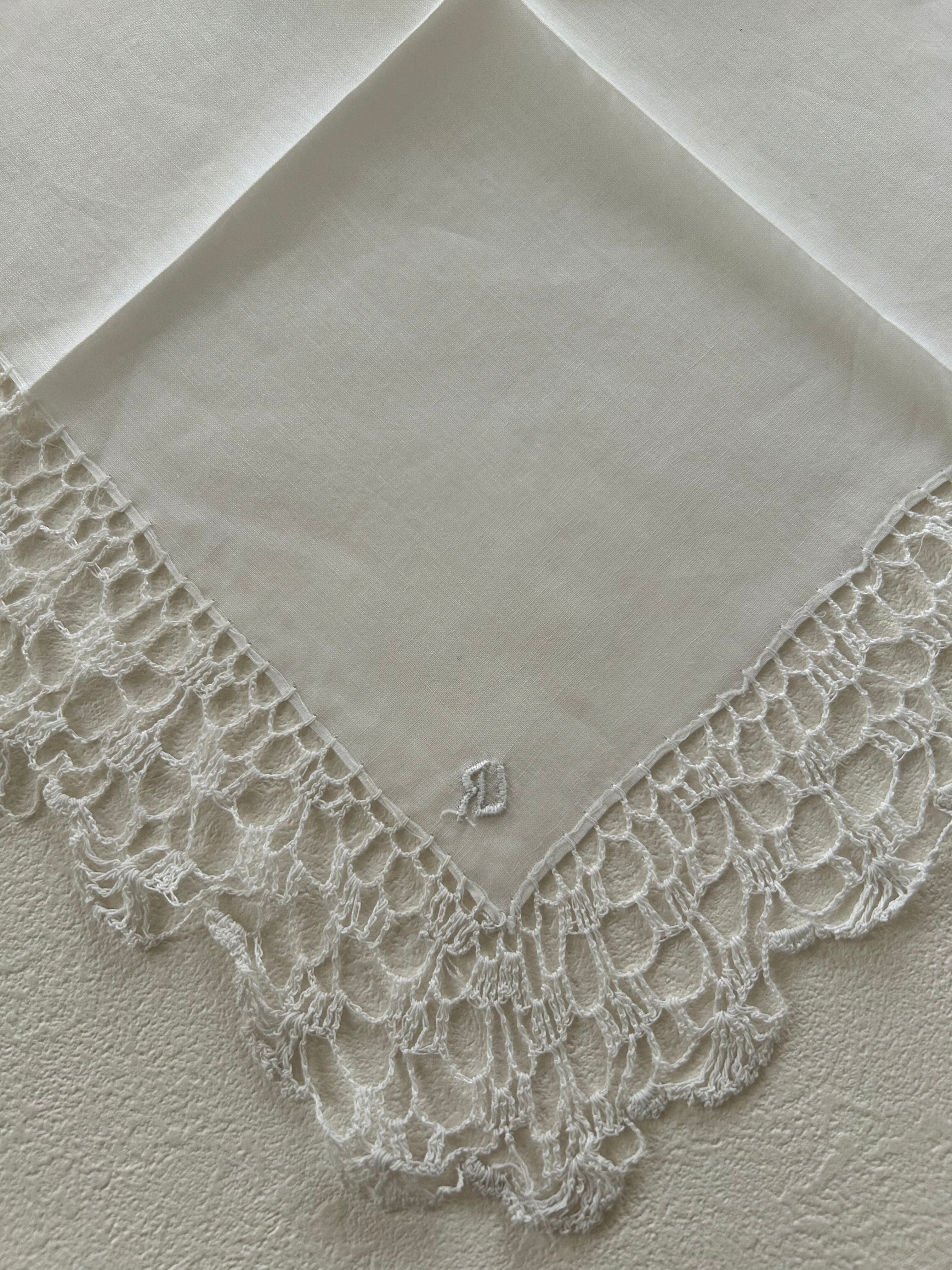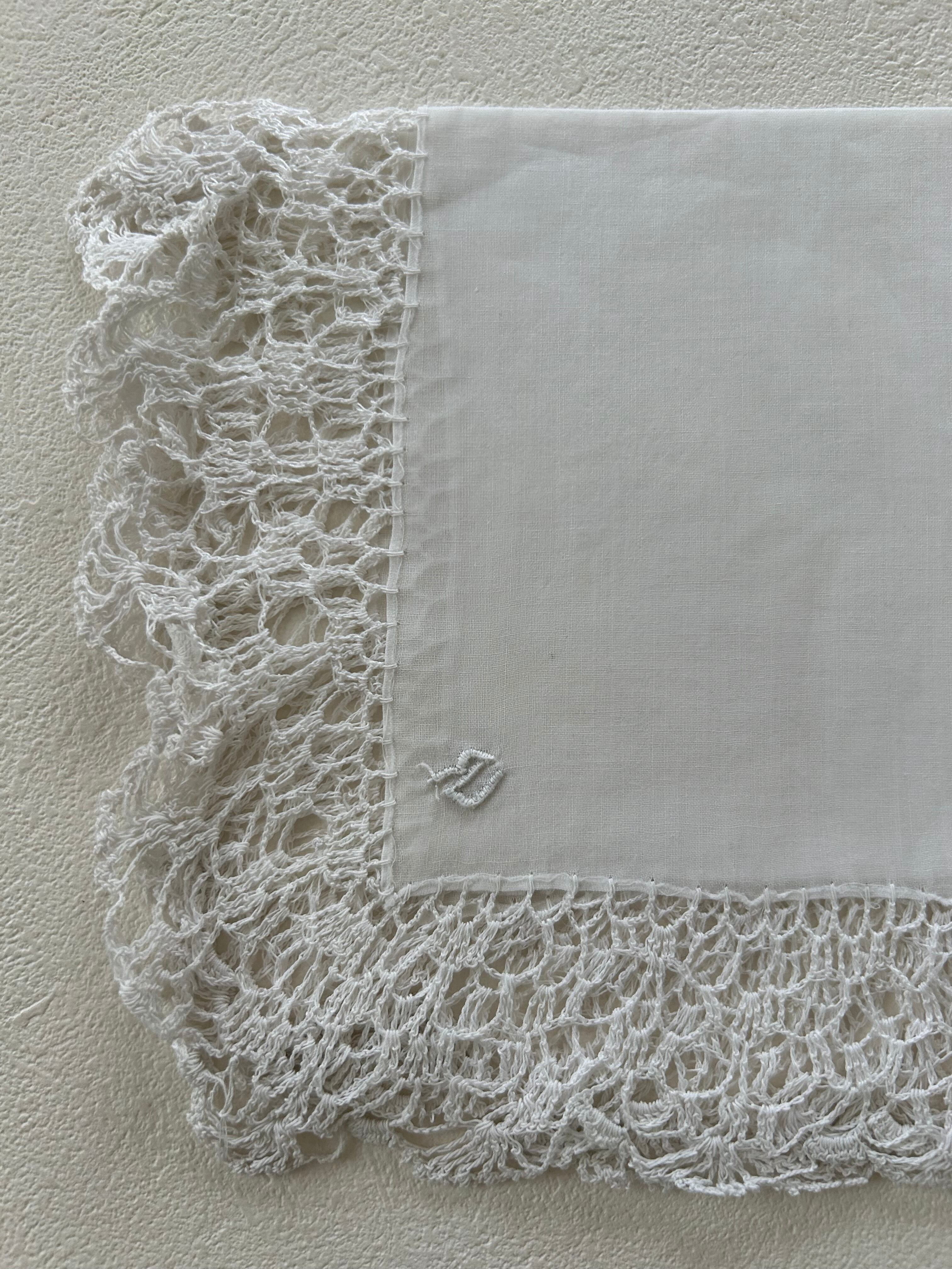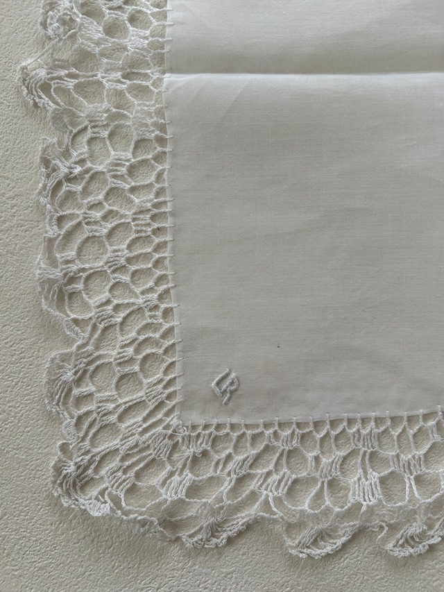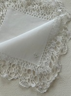 イニシャル刺繍、縁周りのレースが大変美しくロマンチックなハンカチーフです。。