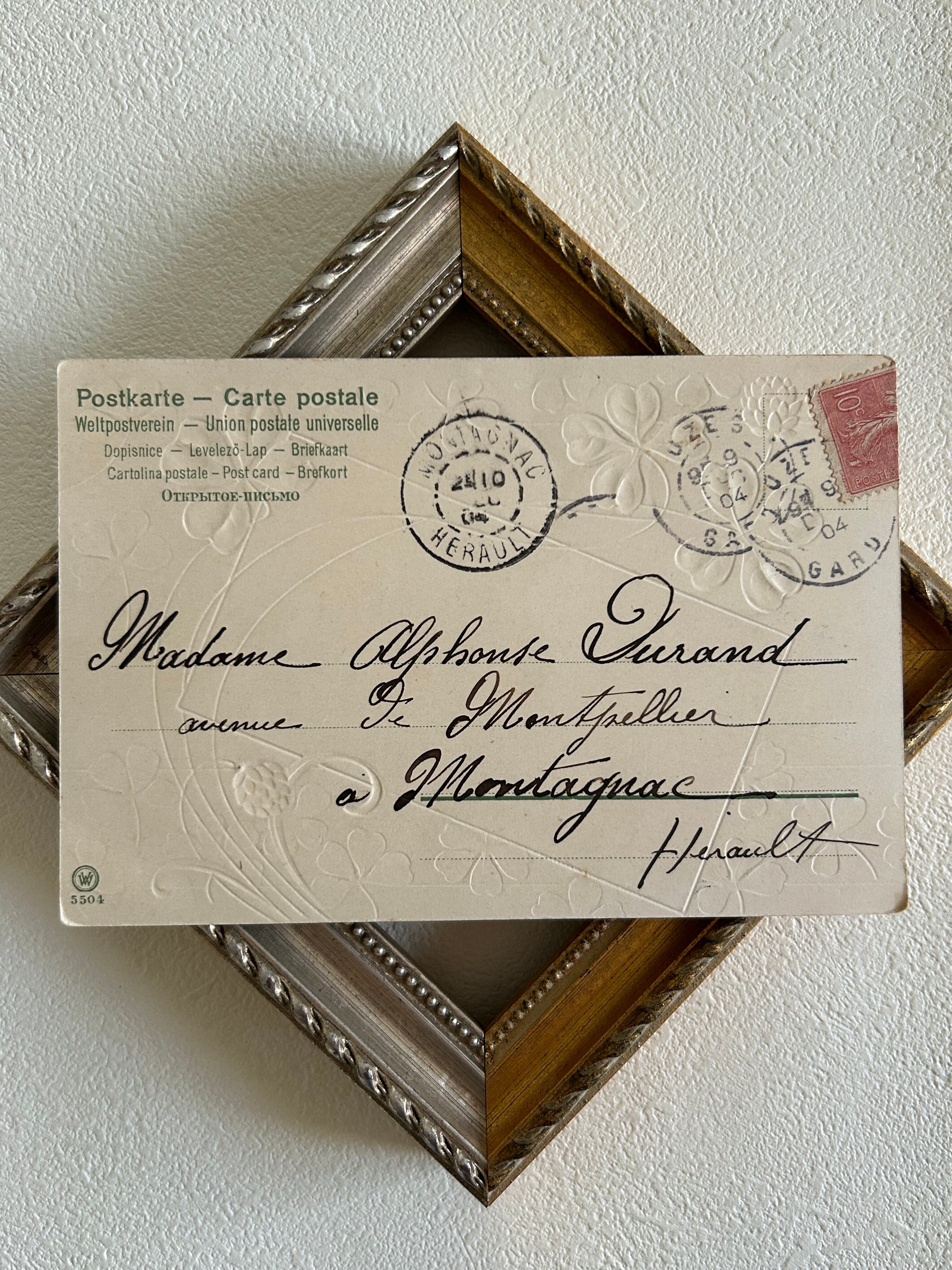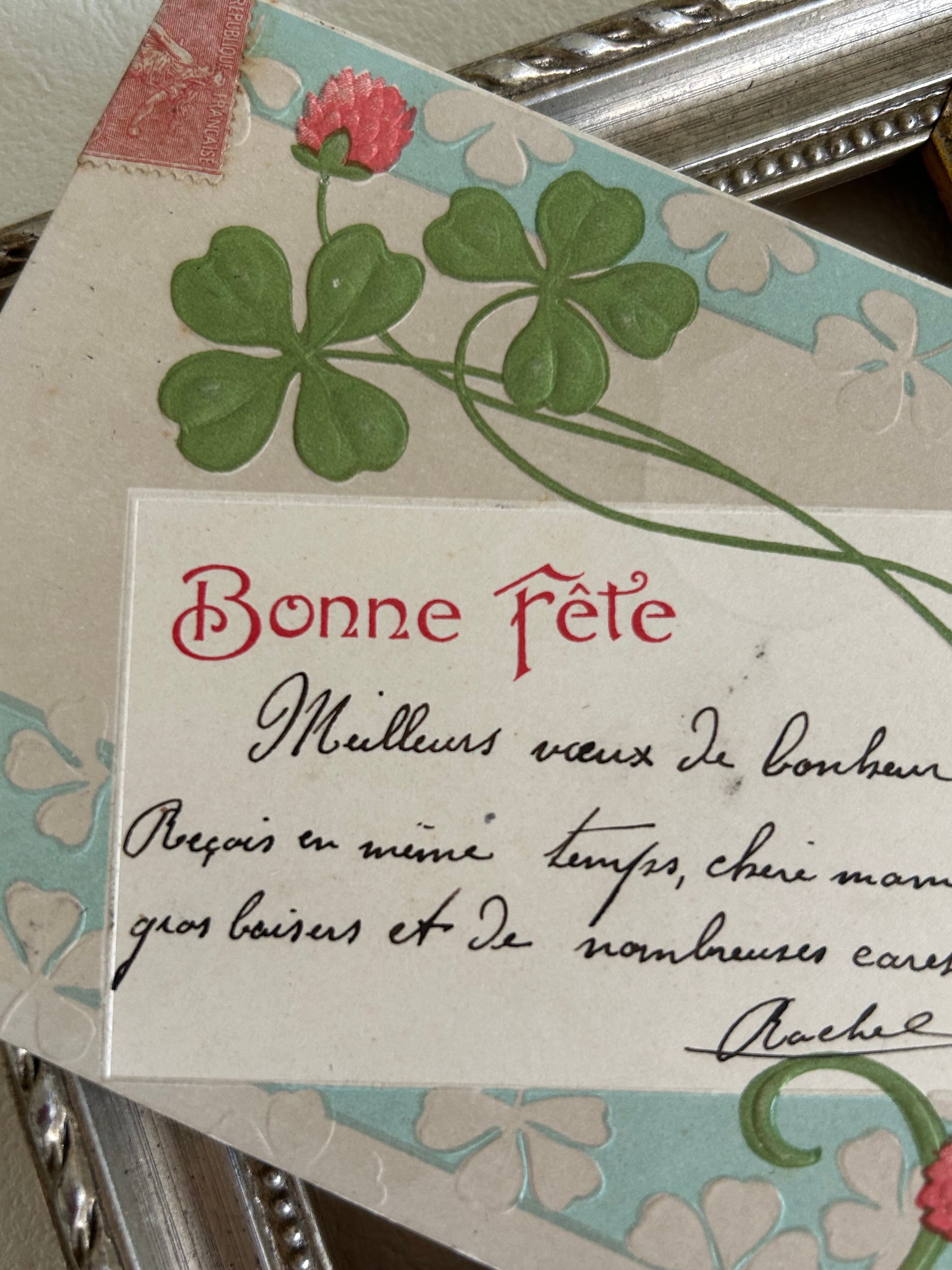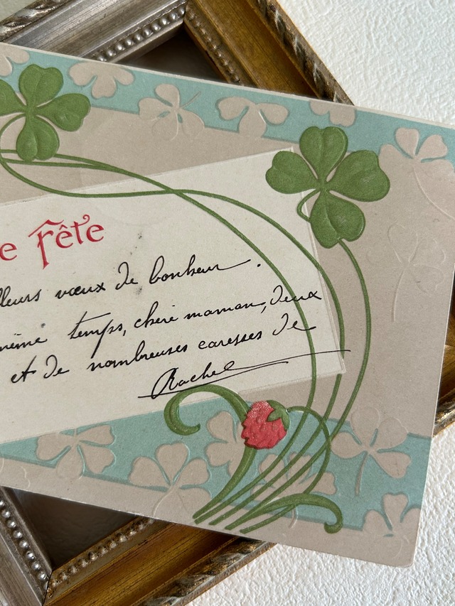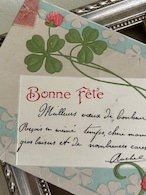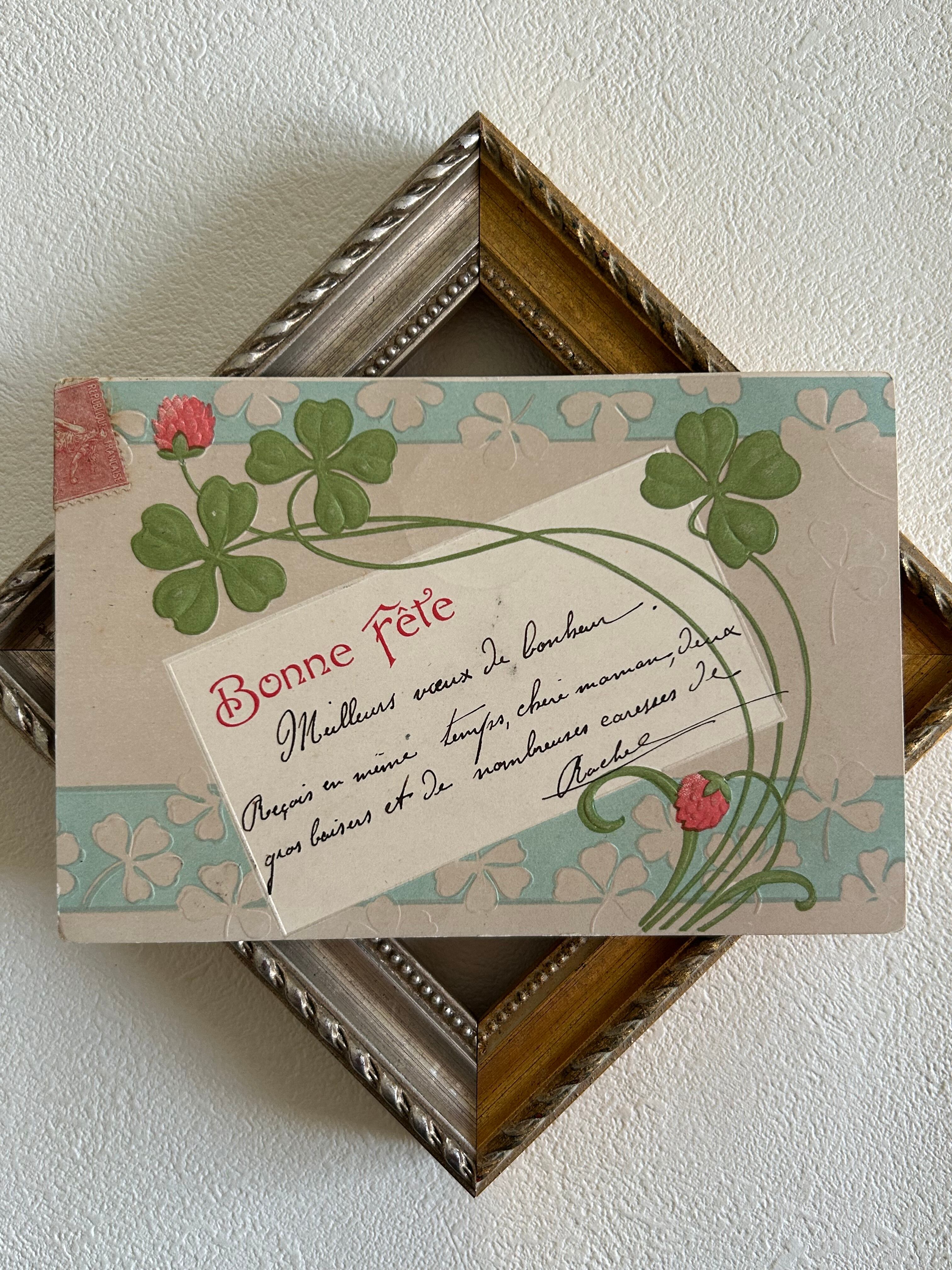 アンティークポストカード Bonne fete 四葉 クローバー フランス エンボス 額装 インテリア 撮影小物 BE