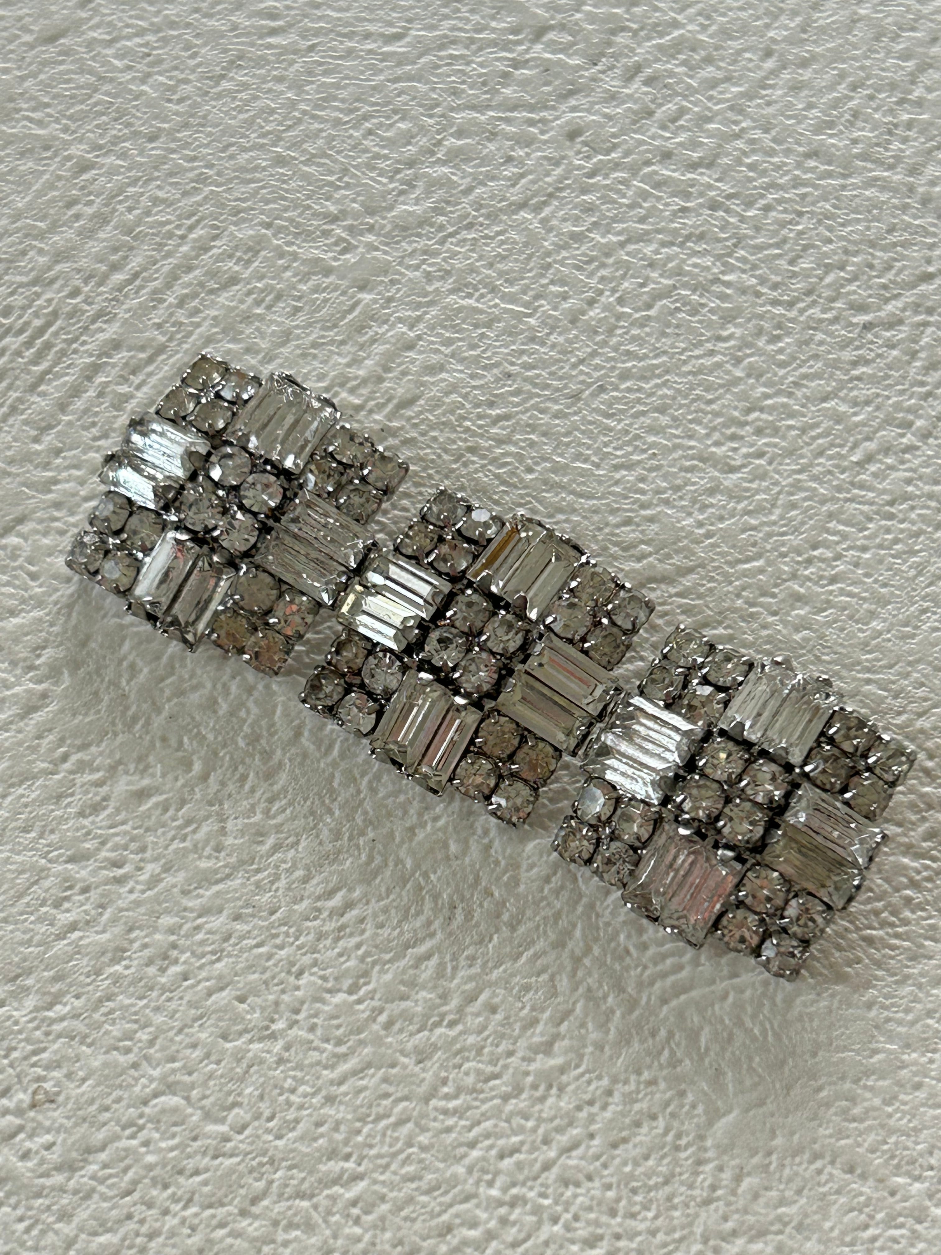 シルバーのメタルの台座にストーンが一面敷き詰められた上品で華やかなデザインボタンです。