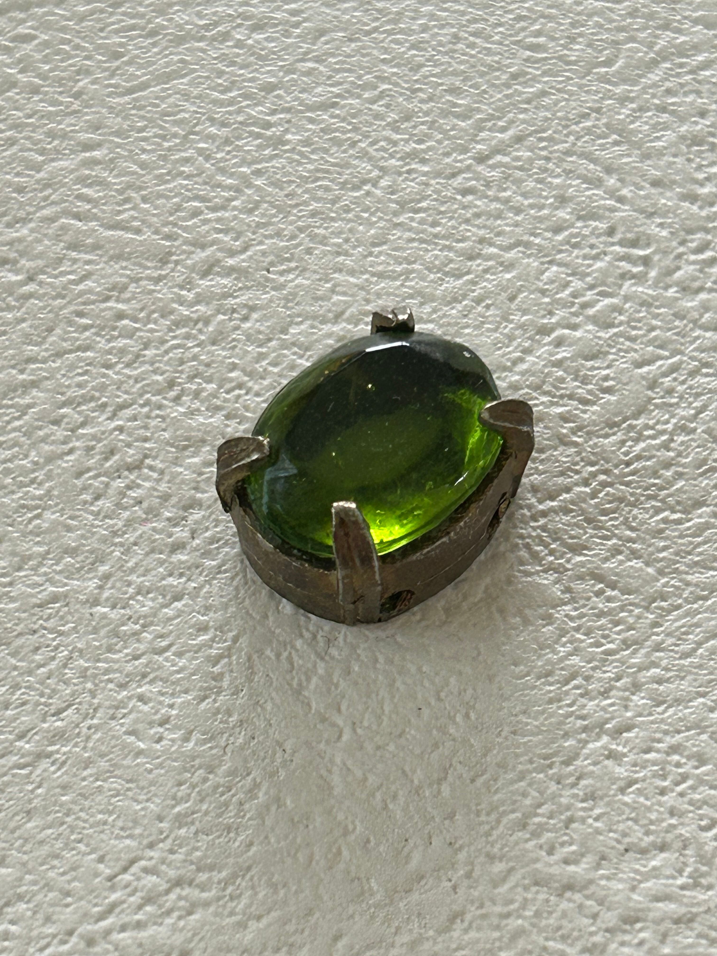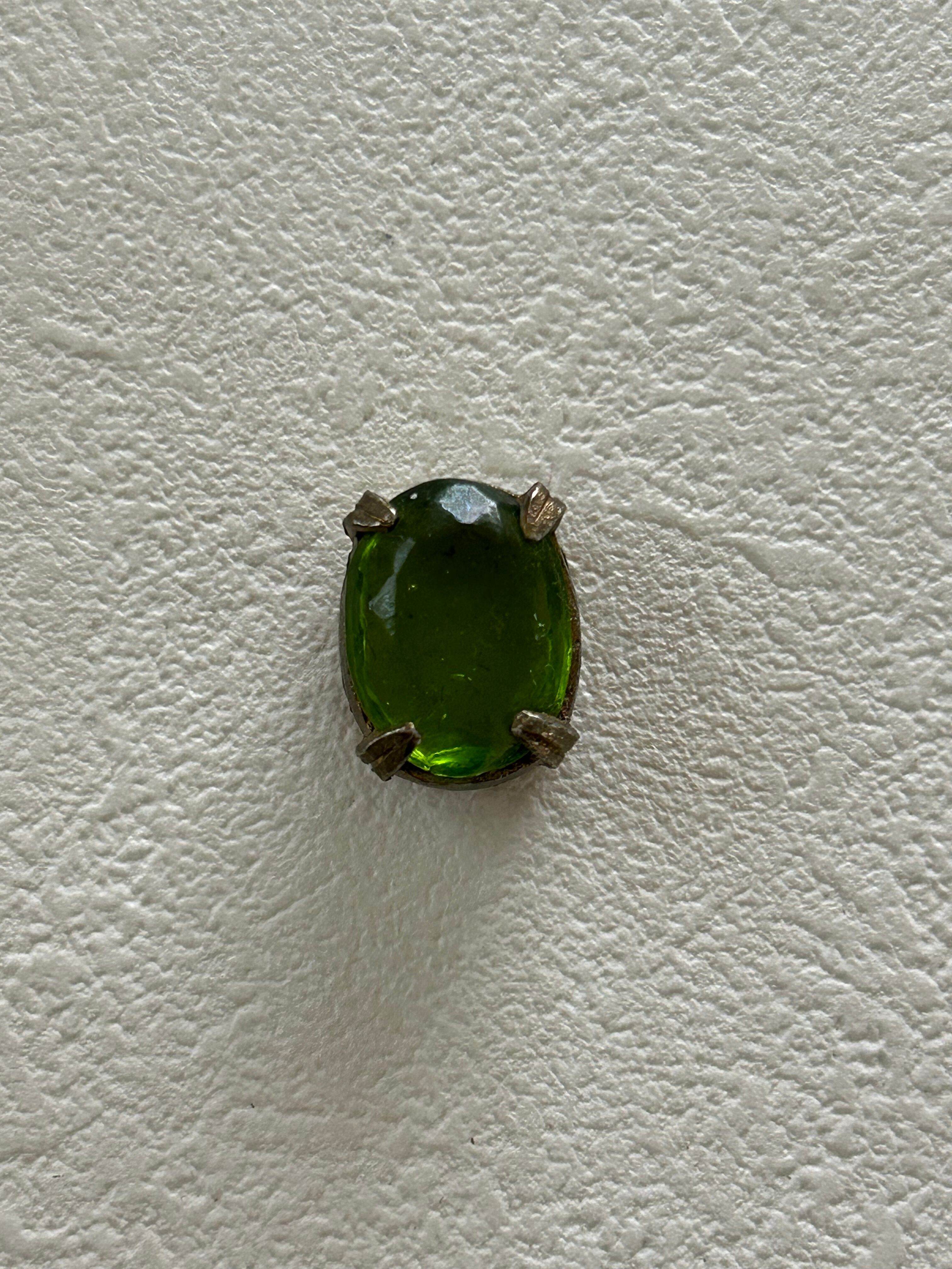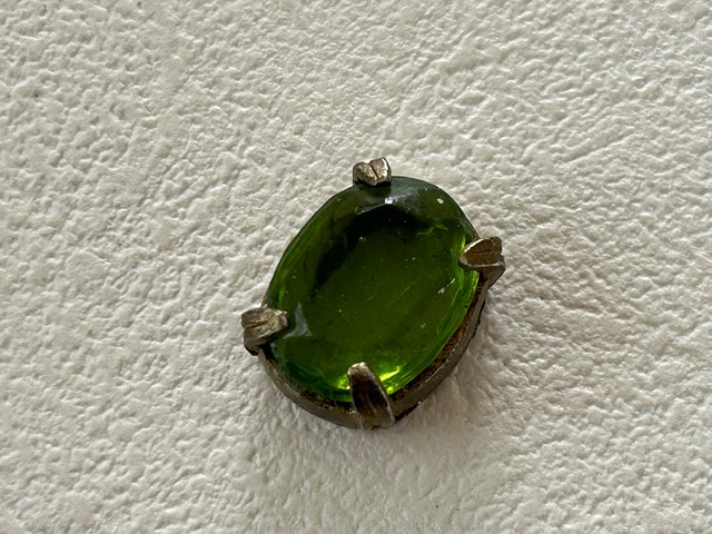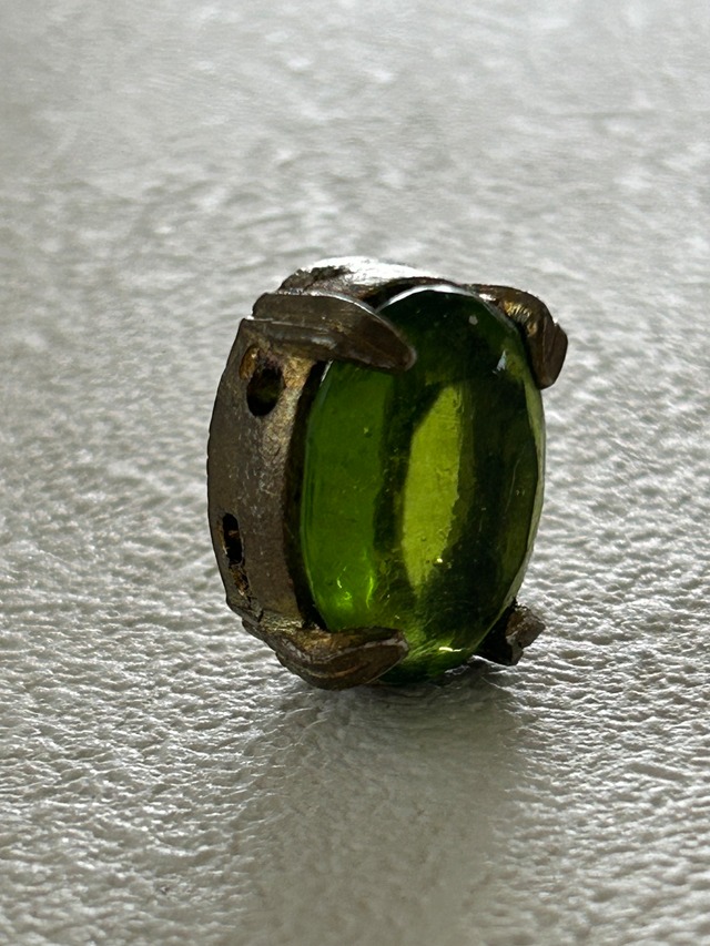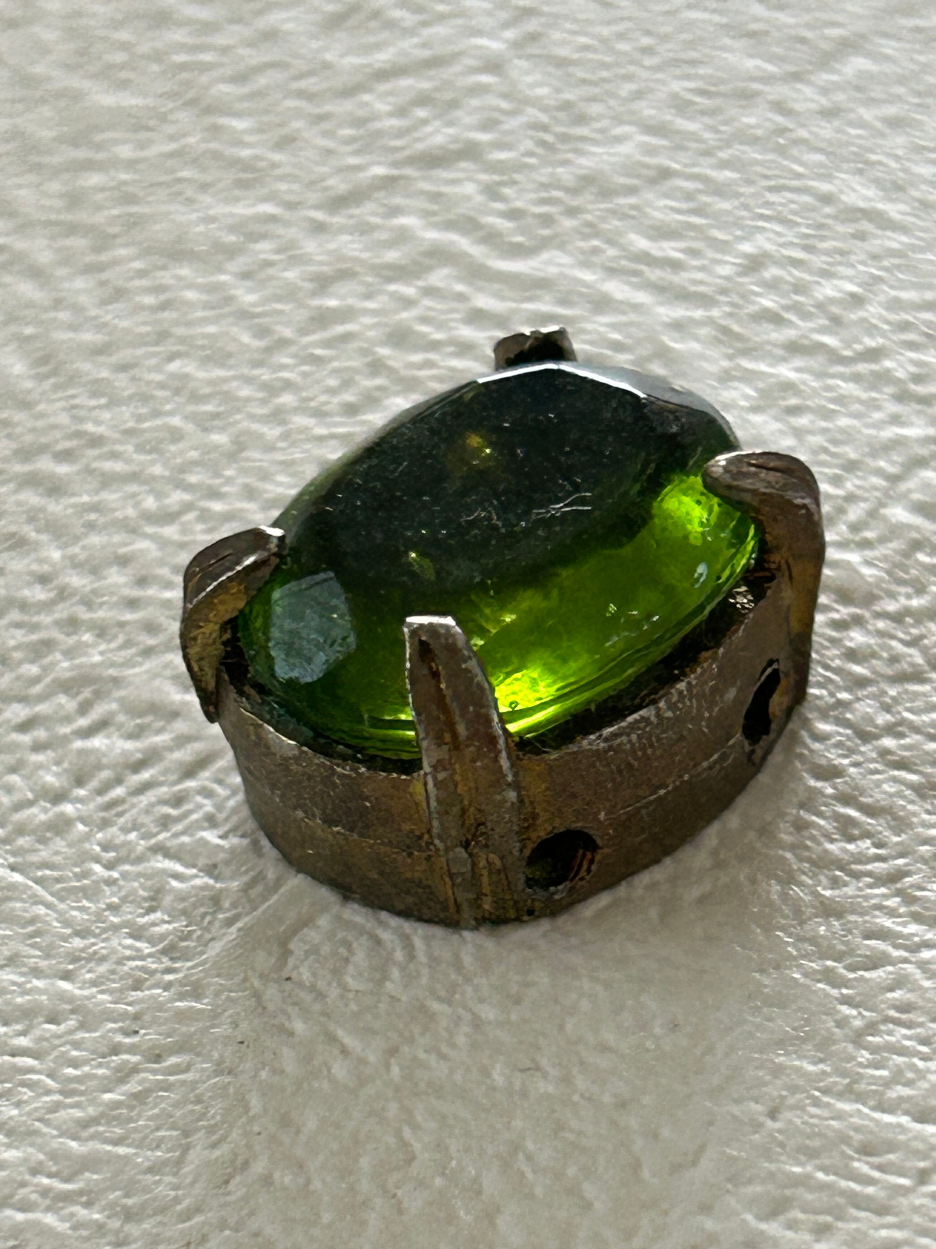 フランスアンティーク 台座付きガラスのカボション イエローグリン 1900年代 メタル×ガラス オーバル型 17mm×14mm アクセアリーパーツ コレクション デコレーション材