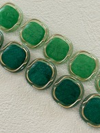 クリアなグリーンのプラスチックの台座に緑、深緑のカボション。