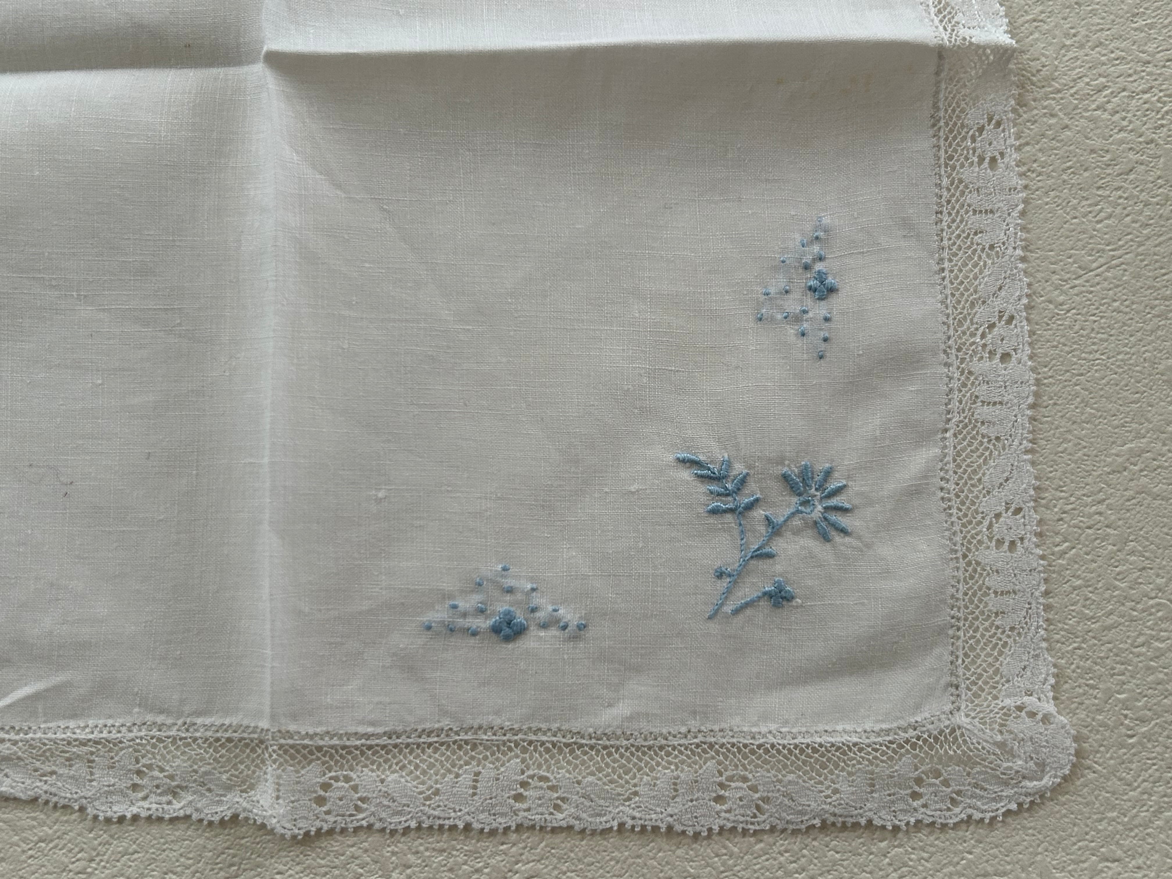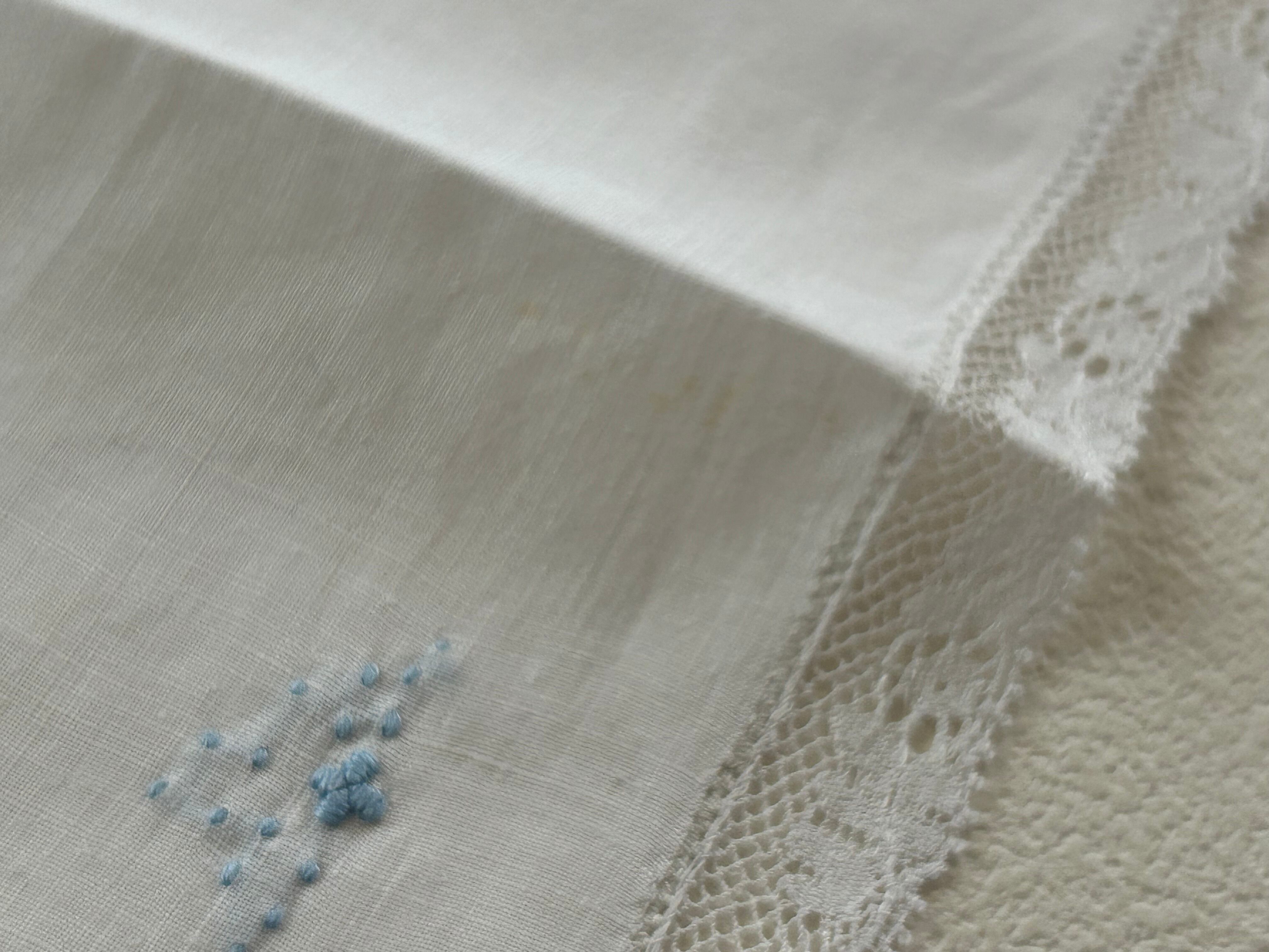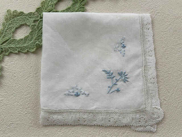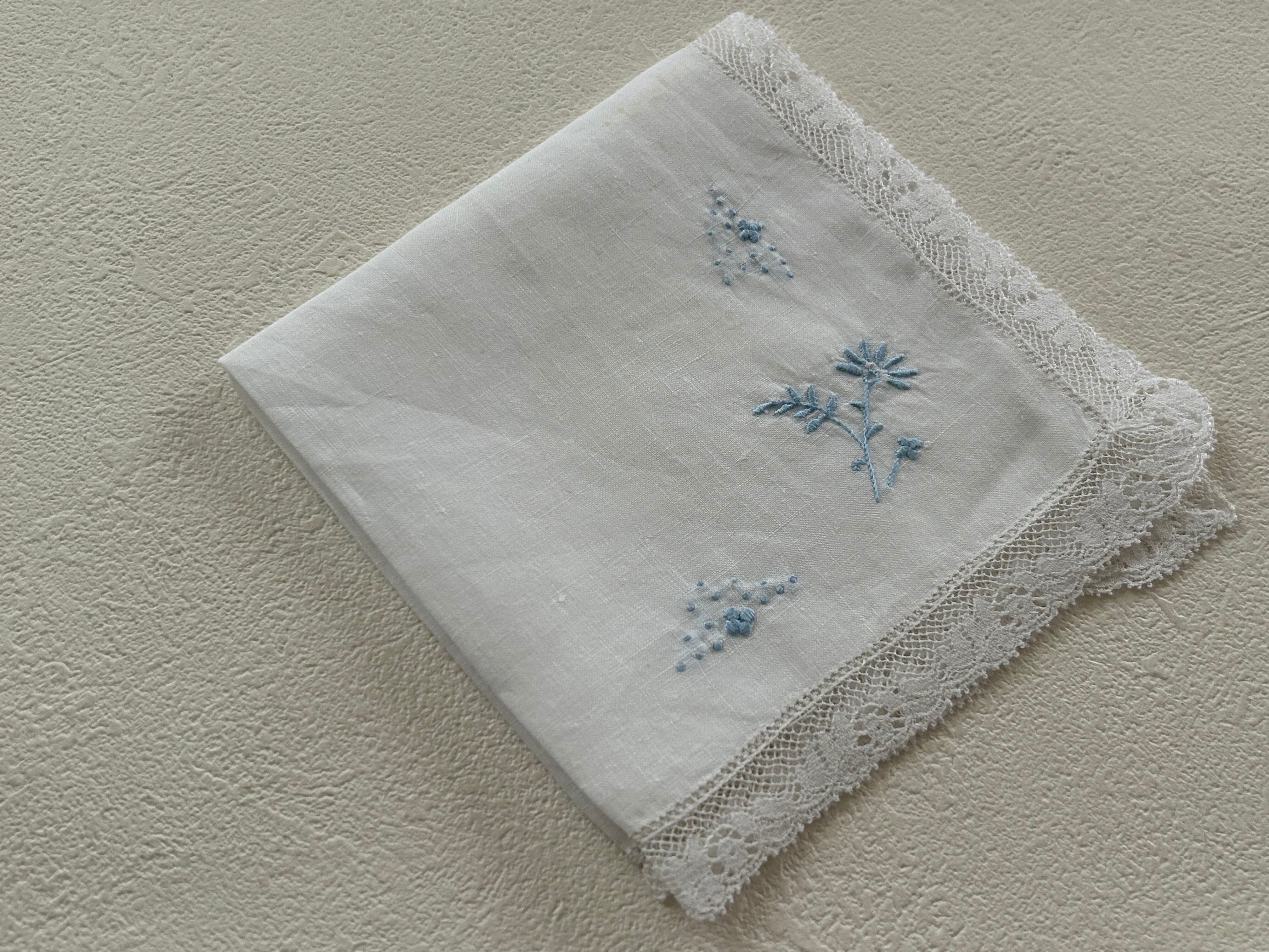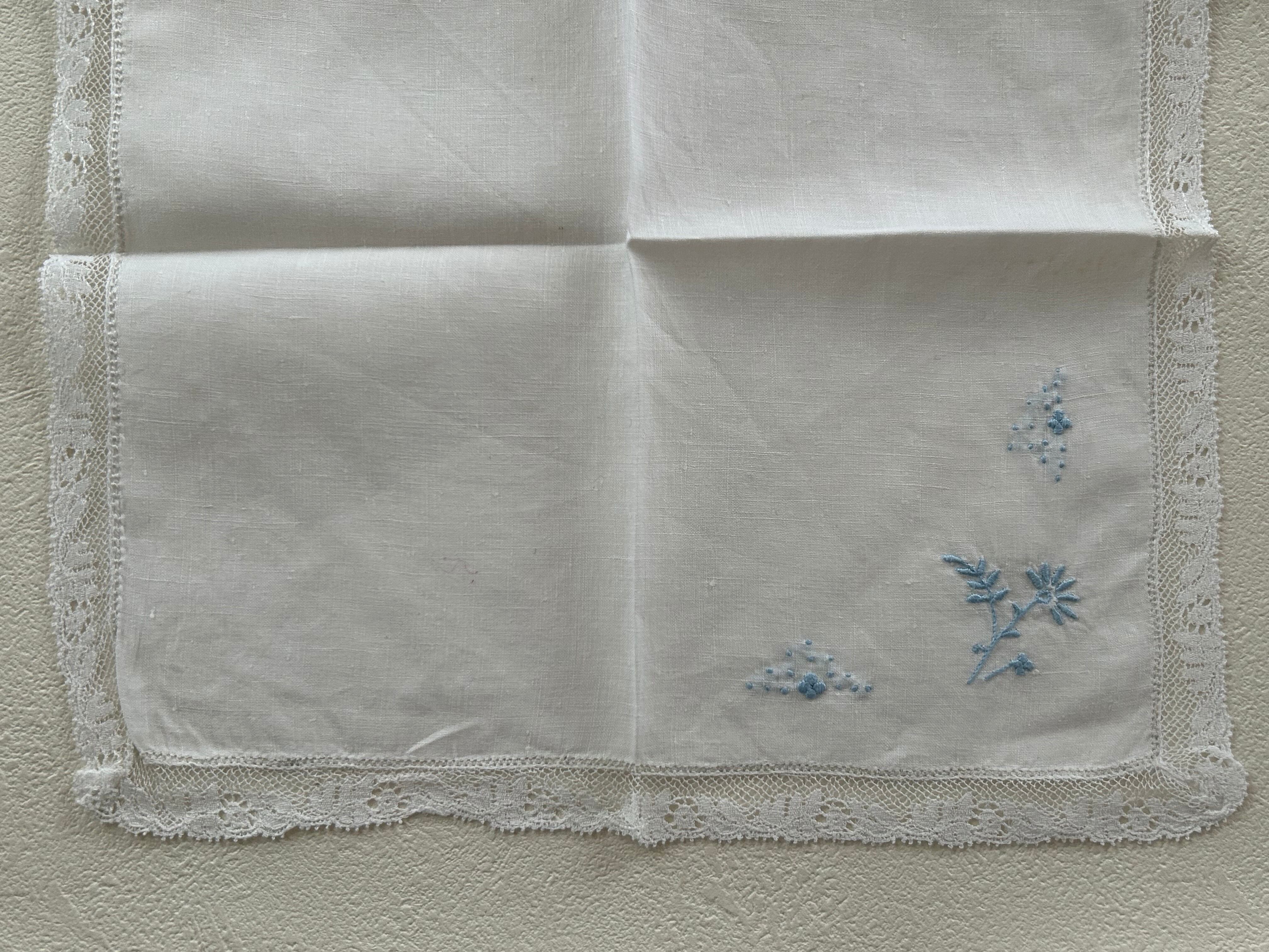 フランスVintage 手刺繍の小花 ハンカチーフ 花柄 薄水色 ライトブルー ハンドメイド素材 インテリア小物 撮影小物