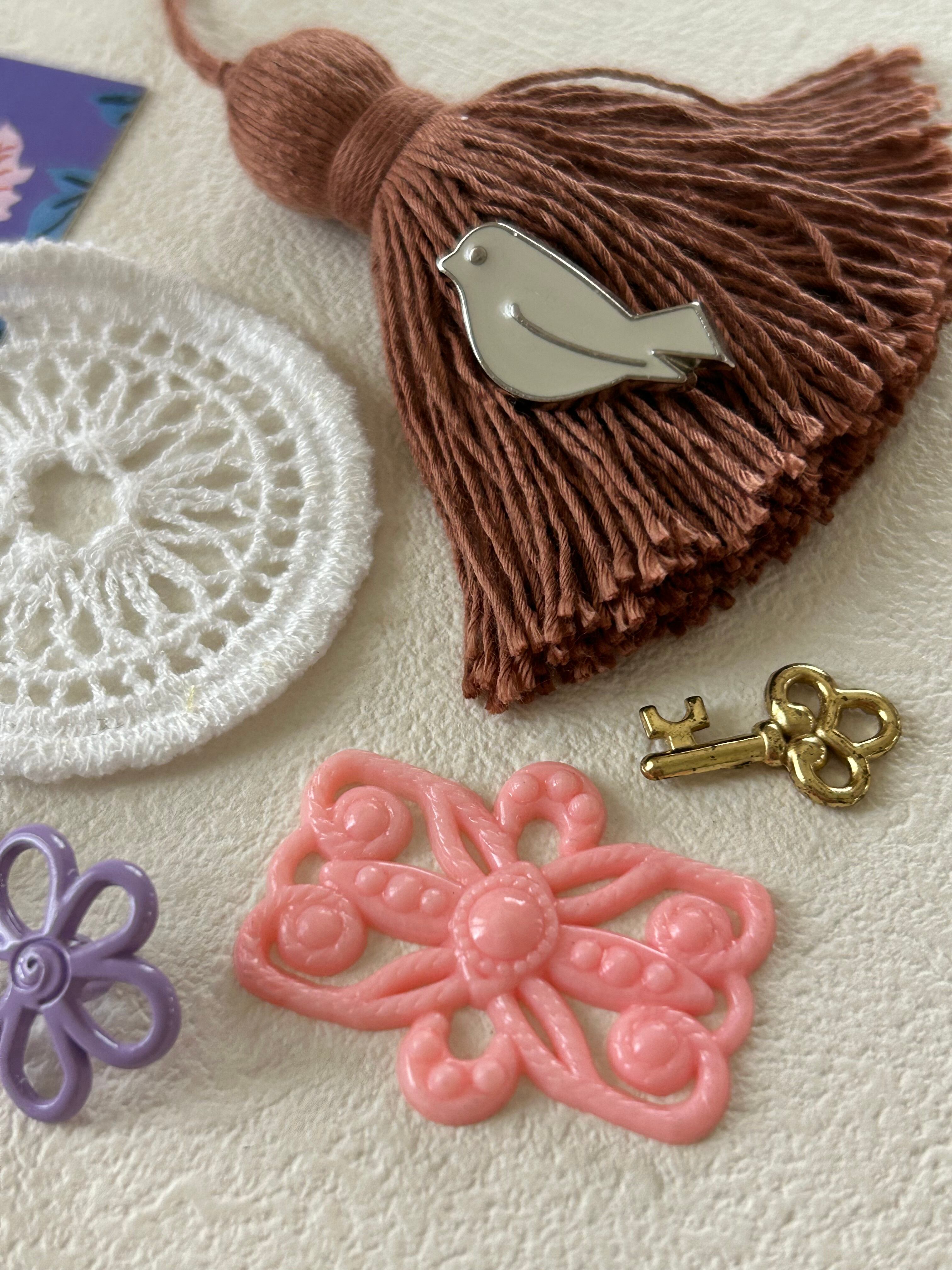 ・内 容 ナタリーレテのミニカード/タッセル/ドログリーの小鳥パーツ/ドログリーのお花型メタルボタン×2/小さなkeyパーツ/ヴィンテージのモチーフ/ピンクのアンティークパーツ