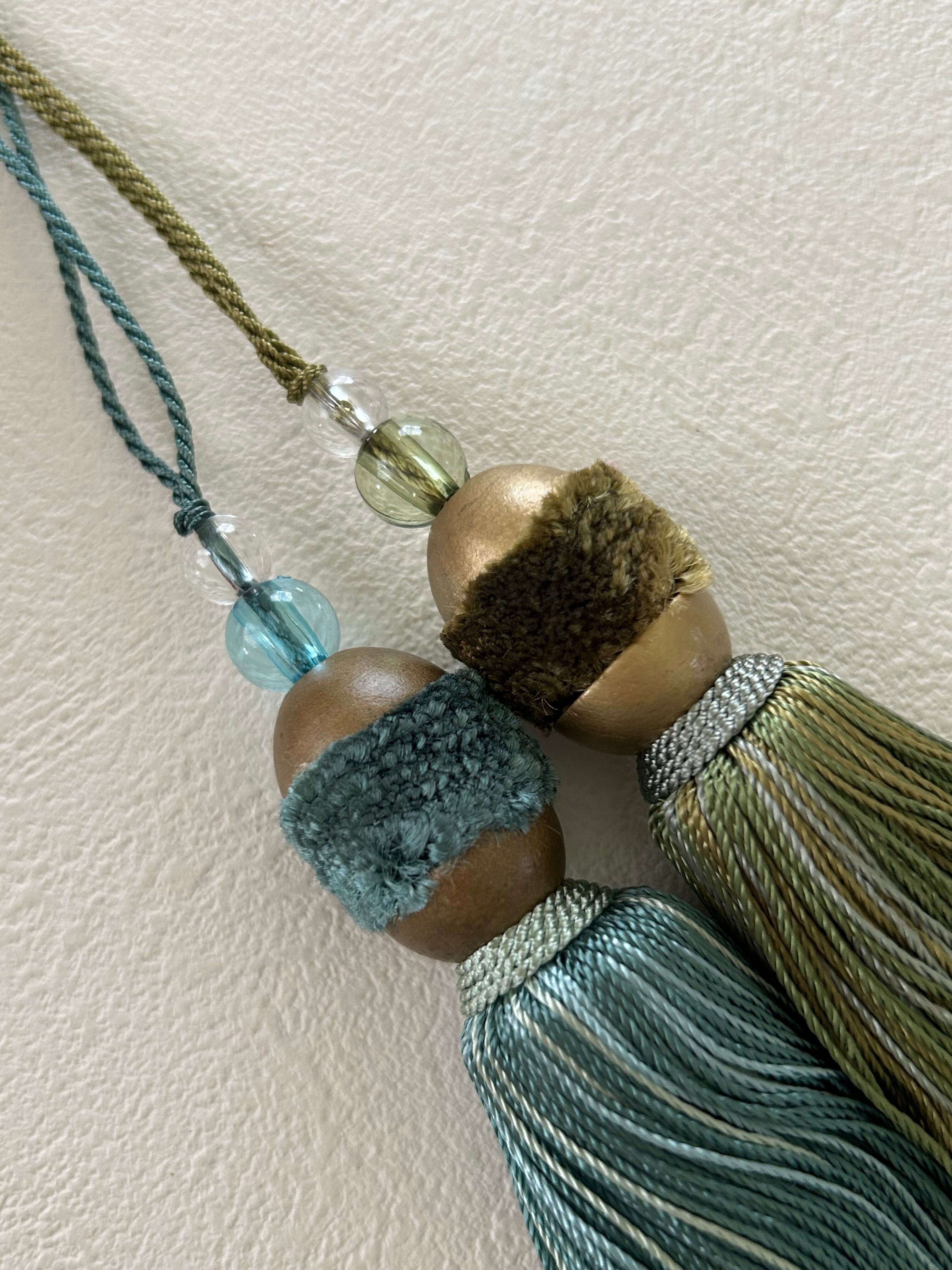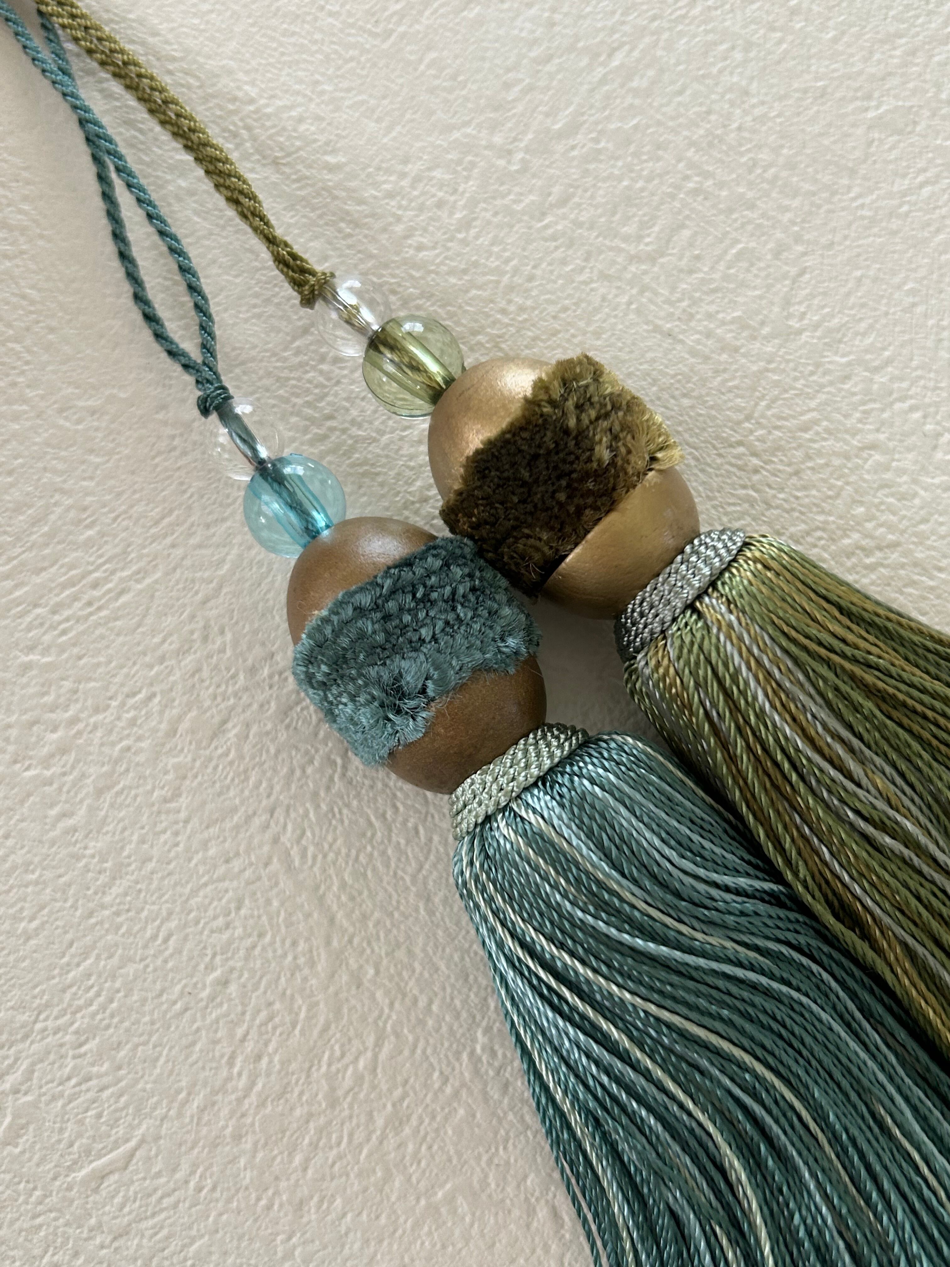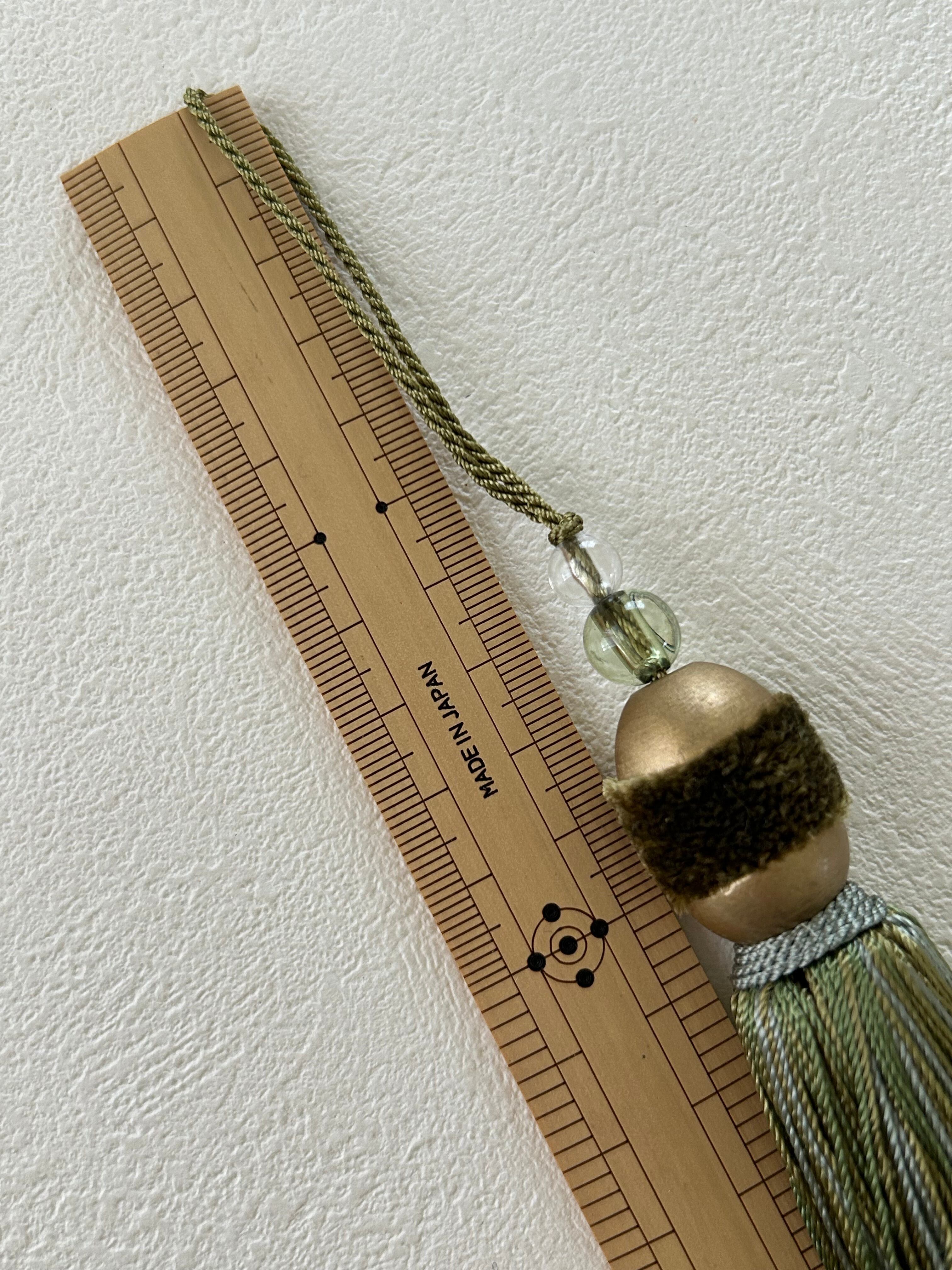 程よいサイズ感とトップのビーズ、木製の装飾、艶やかで上質なタッセルです。