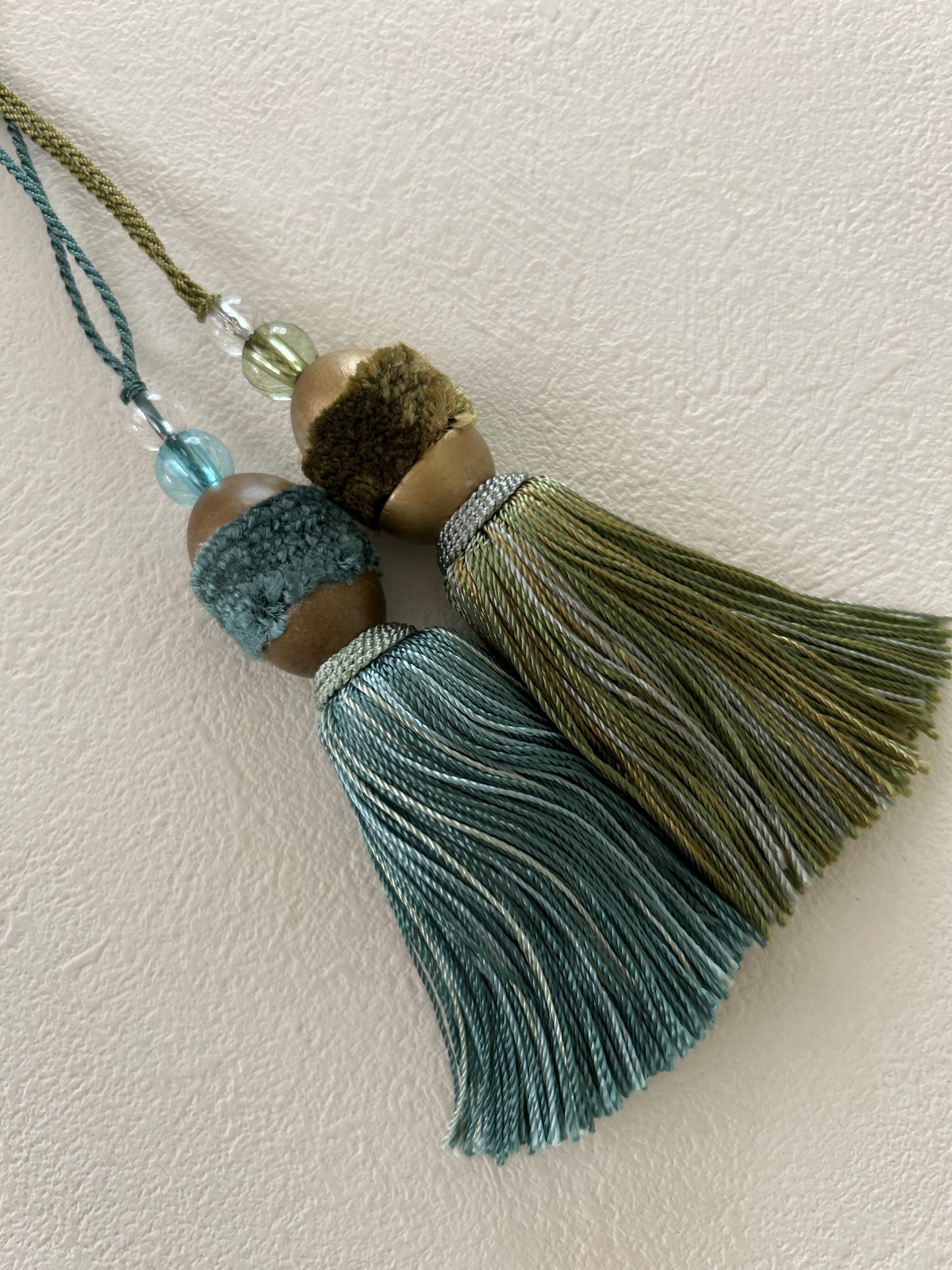 輸入デザインタッセル 10.5cm ライトブルー/カーキ カルトナージュ バッグチャーム お茶箱 インテリア 巻玉タッセル