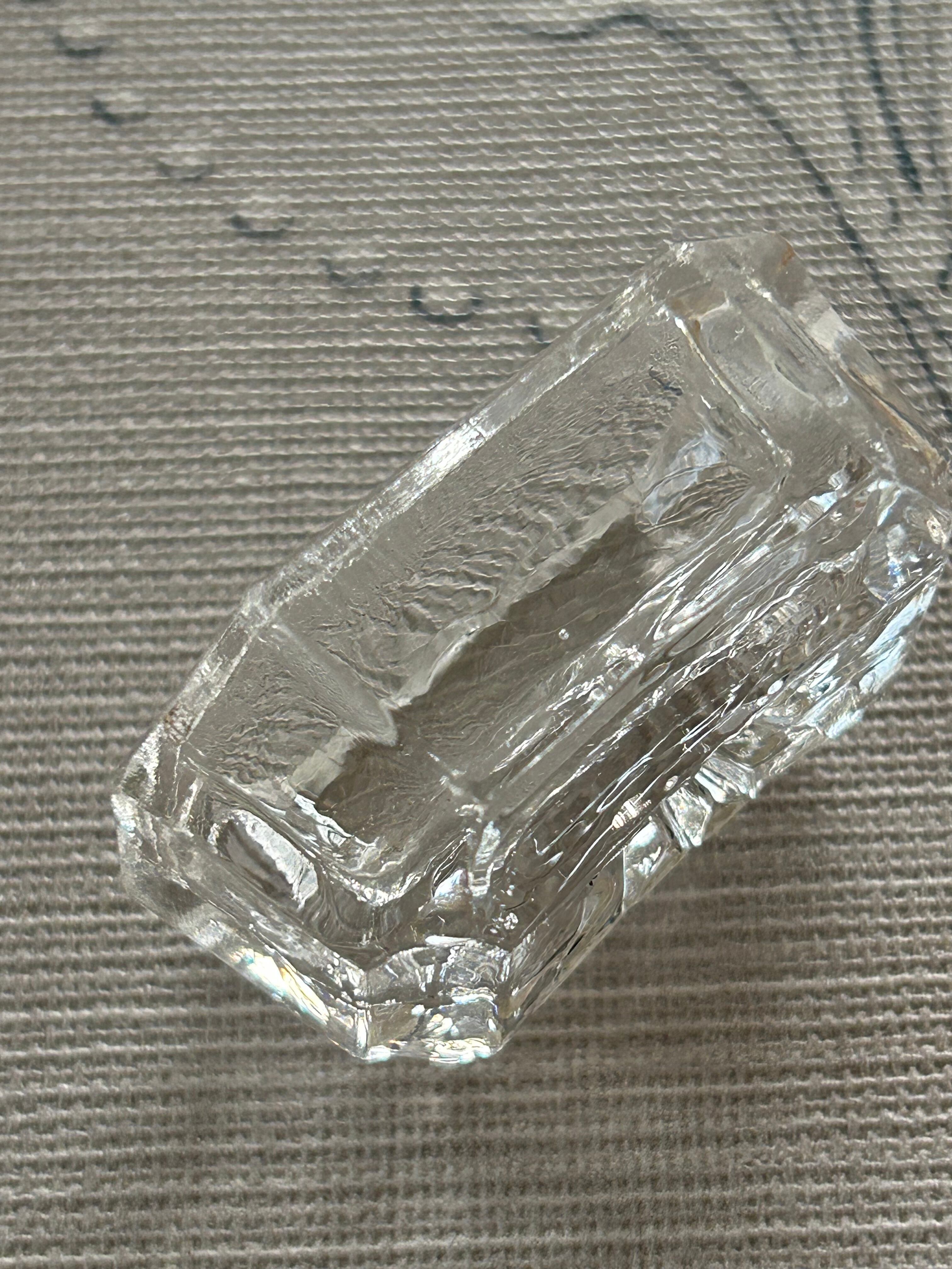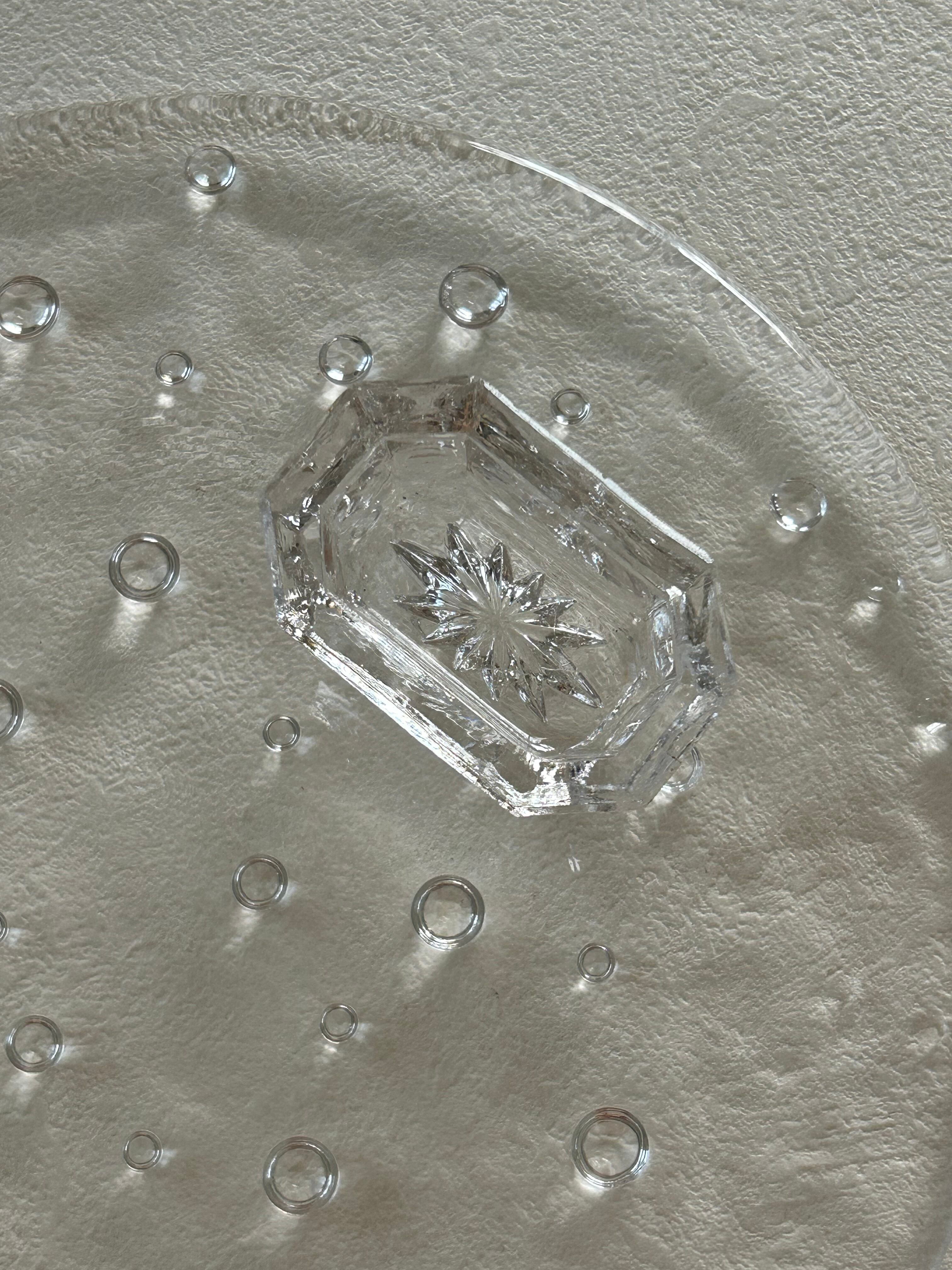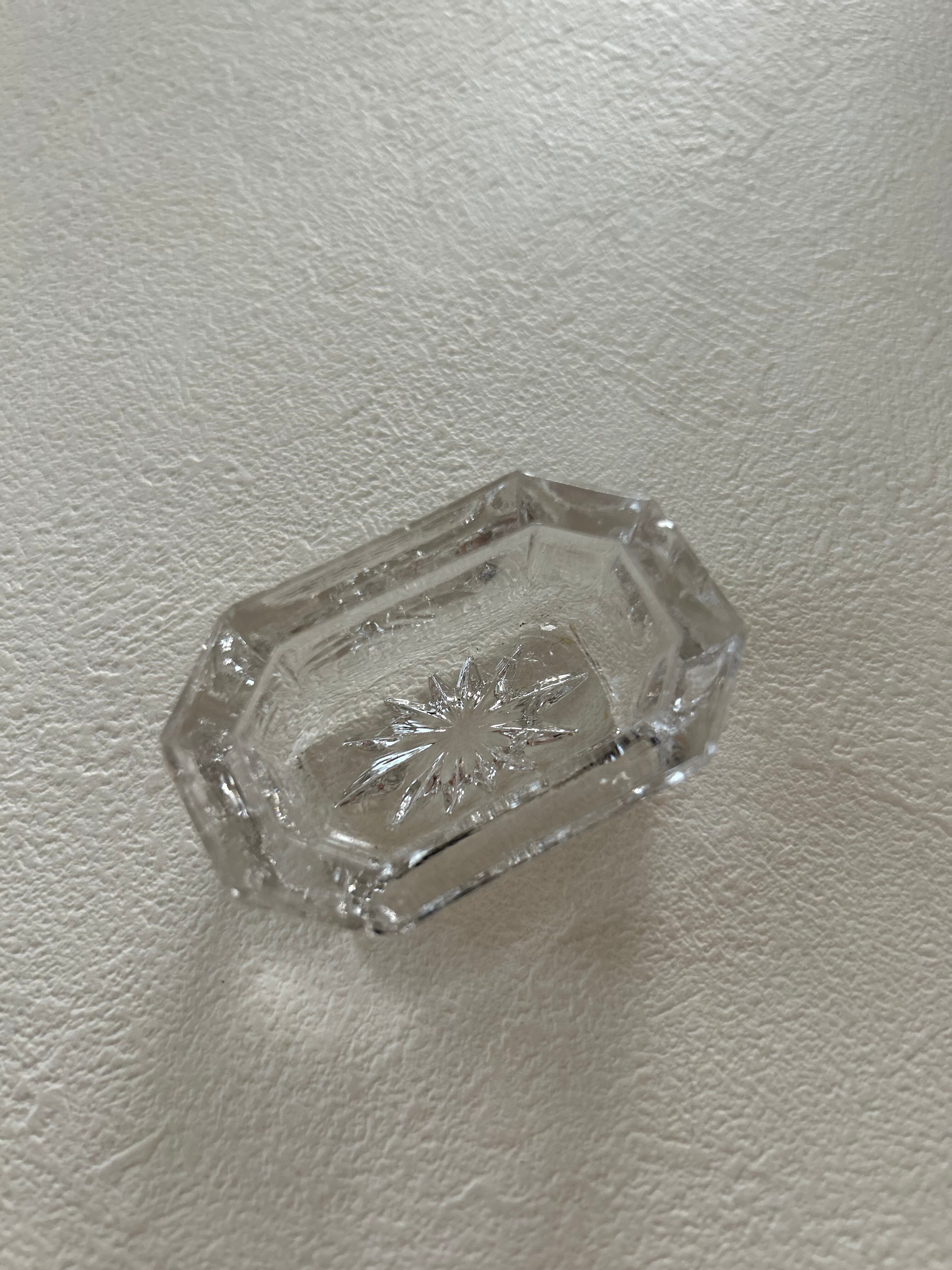 小さなサイズ、底面のカット模様、ぽってりとした気泡の入ったガラスが可愛いく目をひくディッシュです。