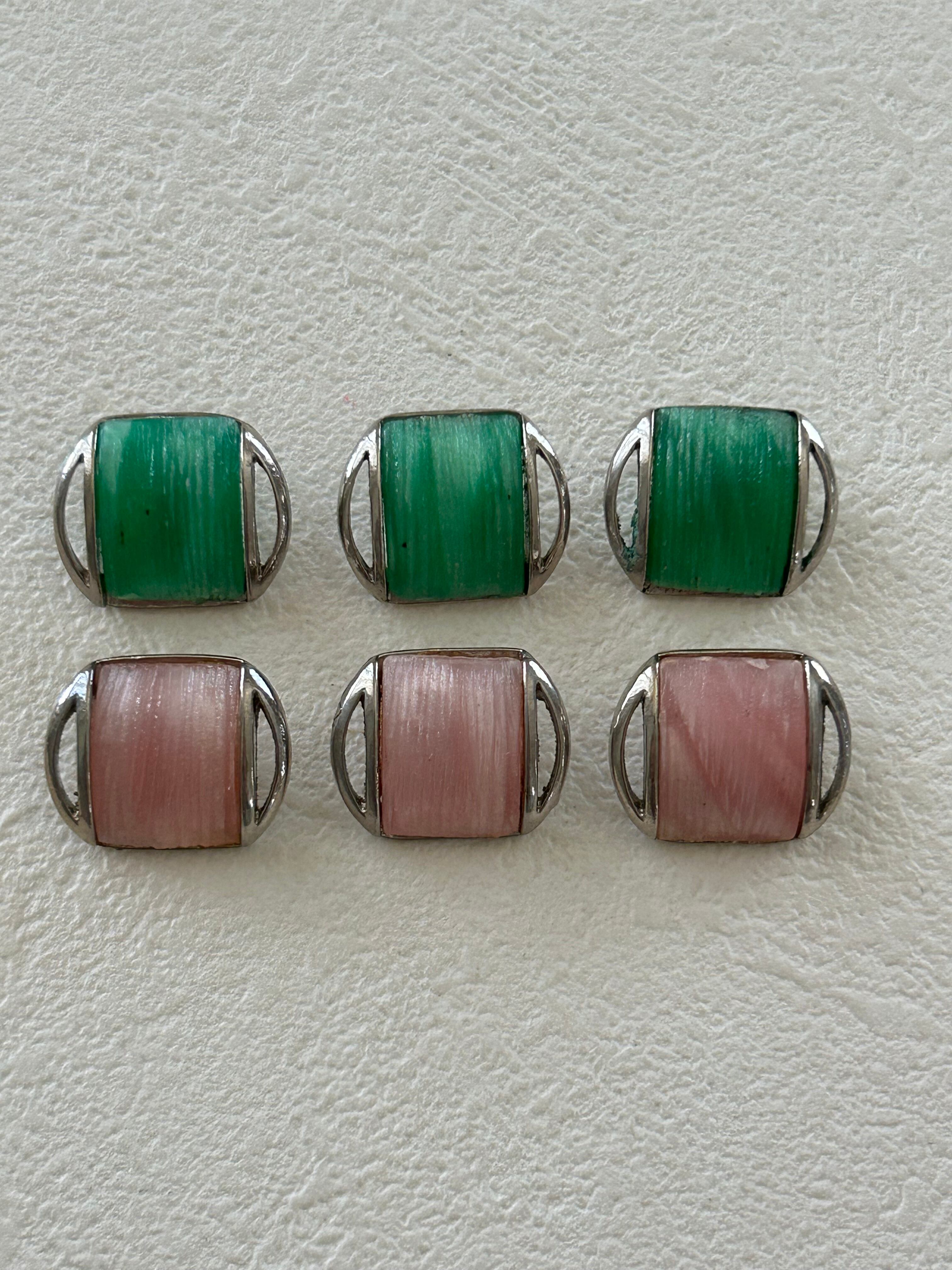 メタル製の台座に画像のようなグリーン、ピンクのカボションが設置されています。