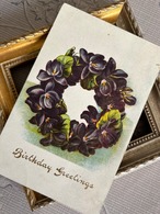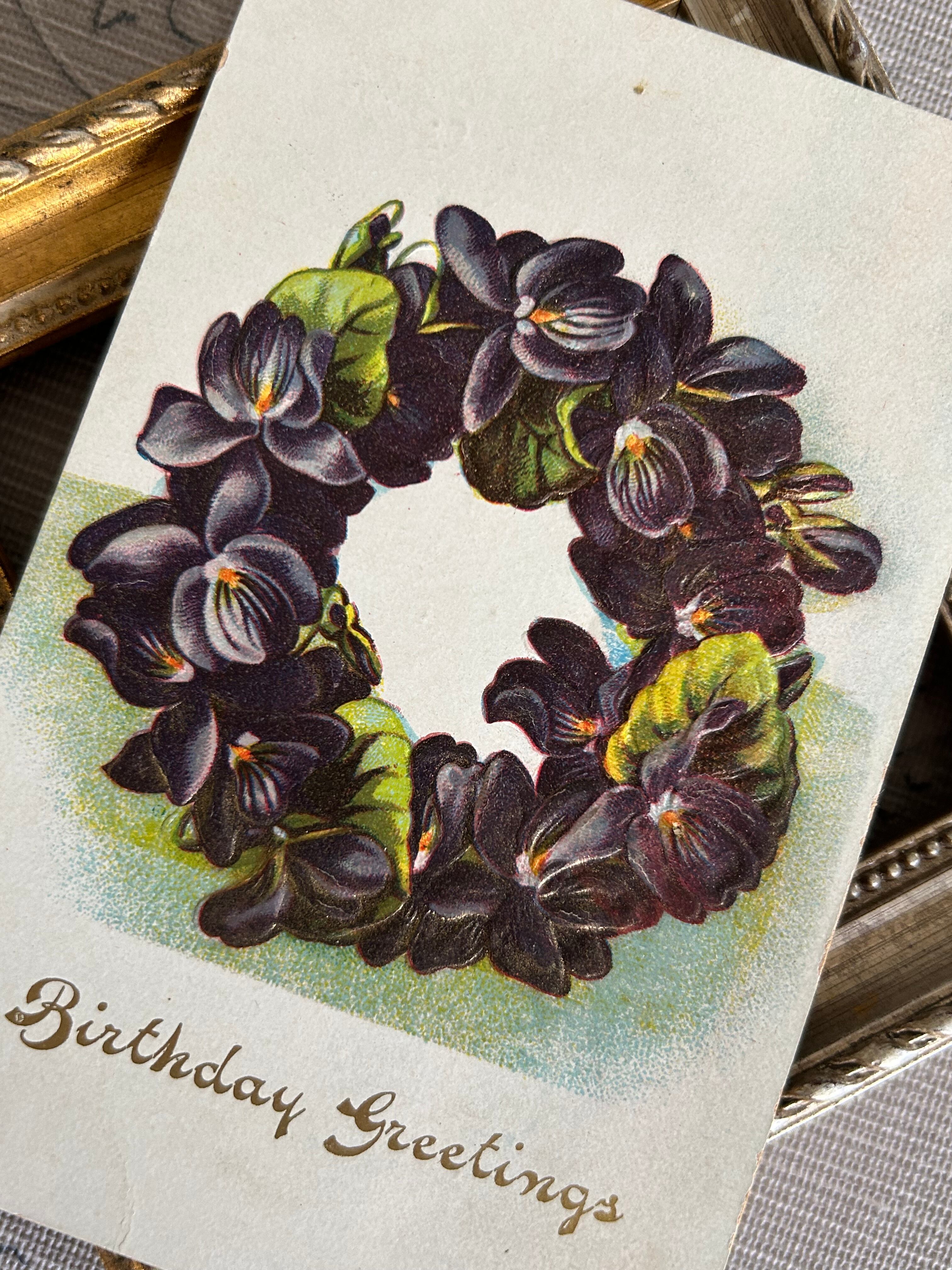 フランス アンティークポストカード すみれのリース Birthday Greetings ドイツ製 エンボス加工 額装 インテリア
