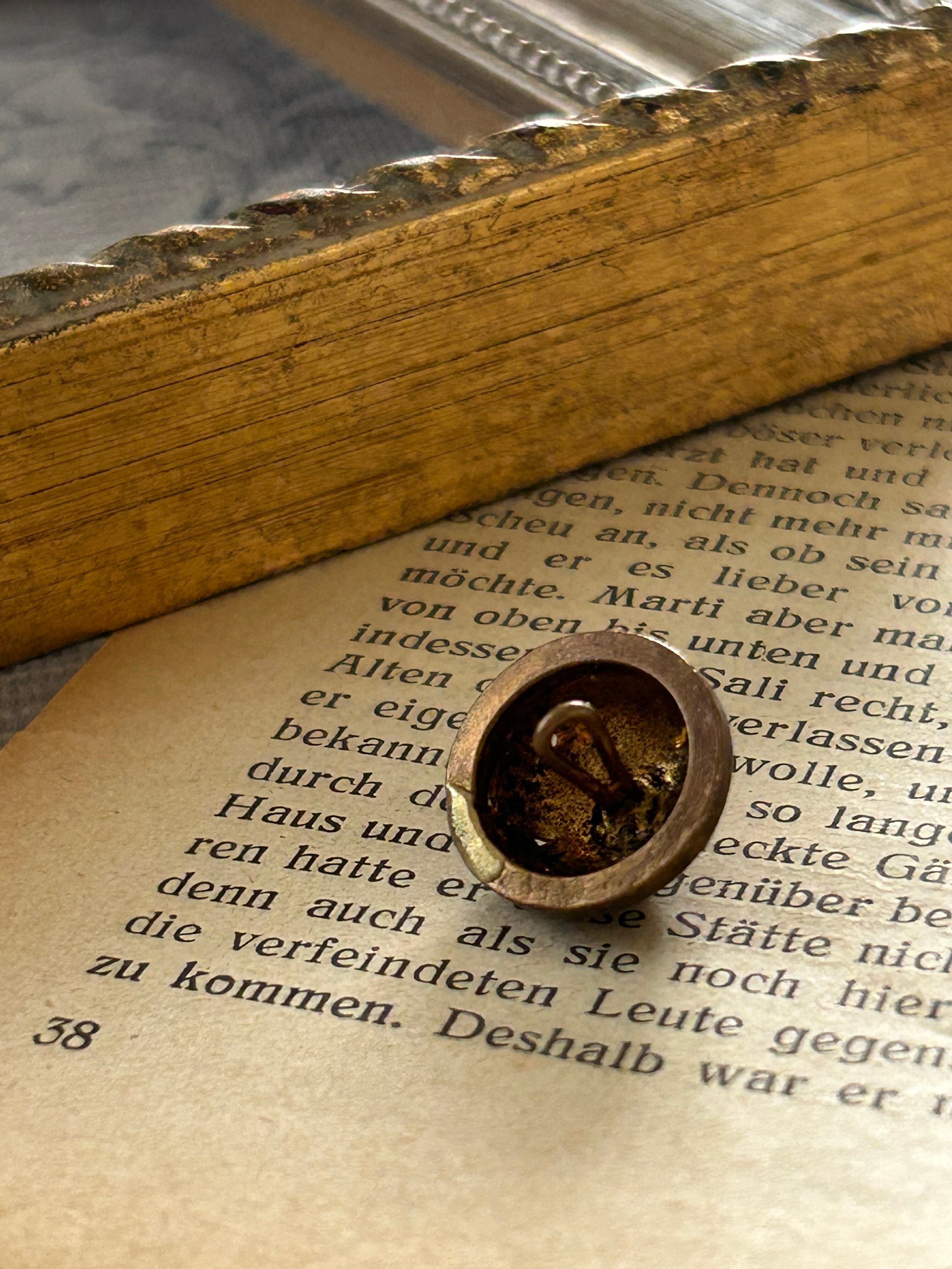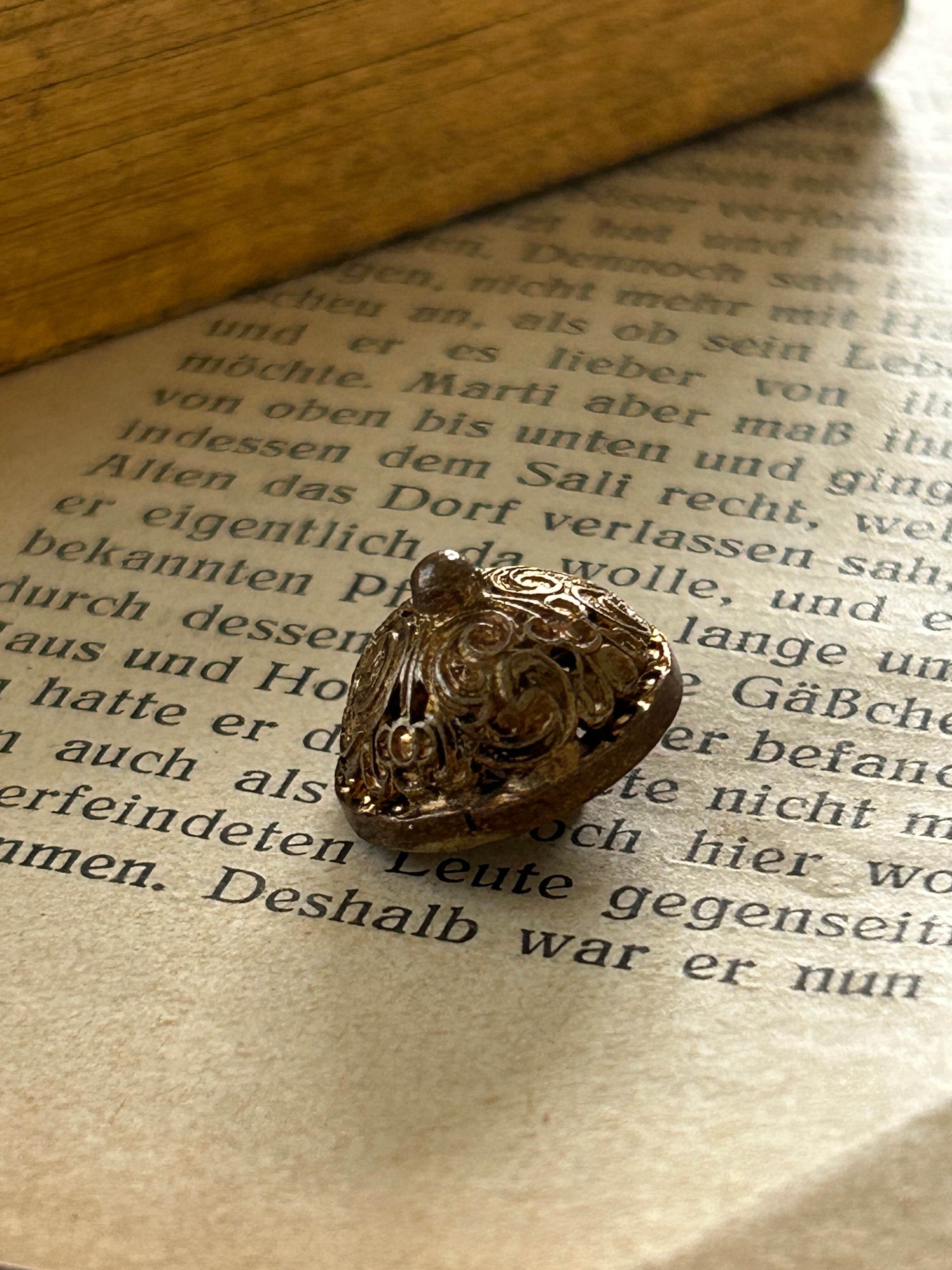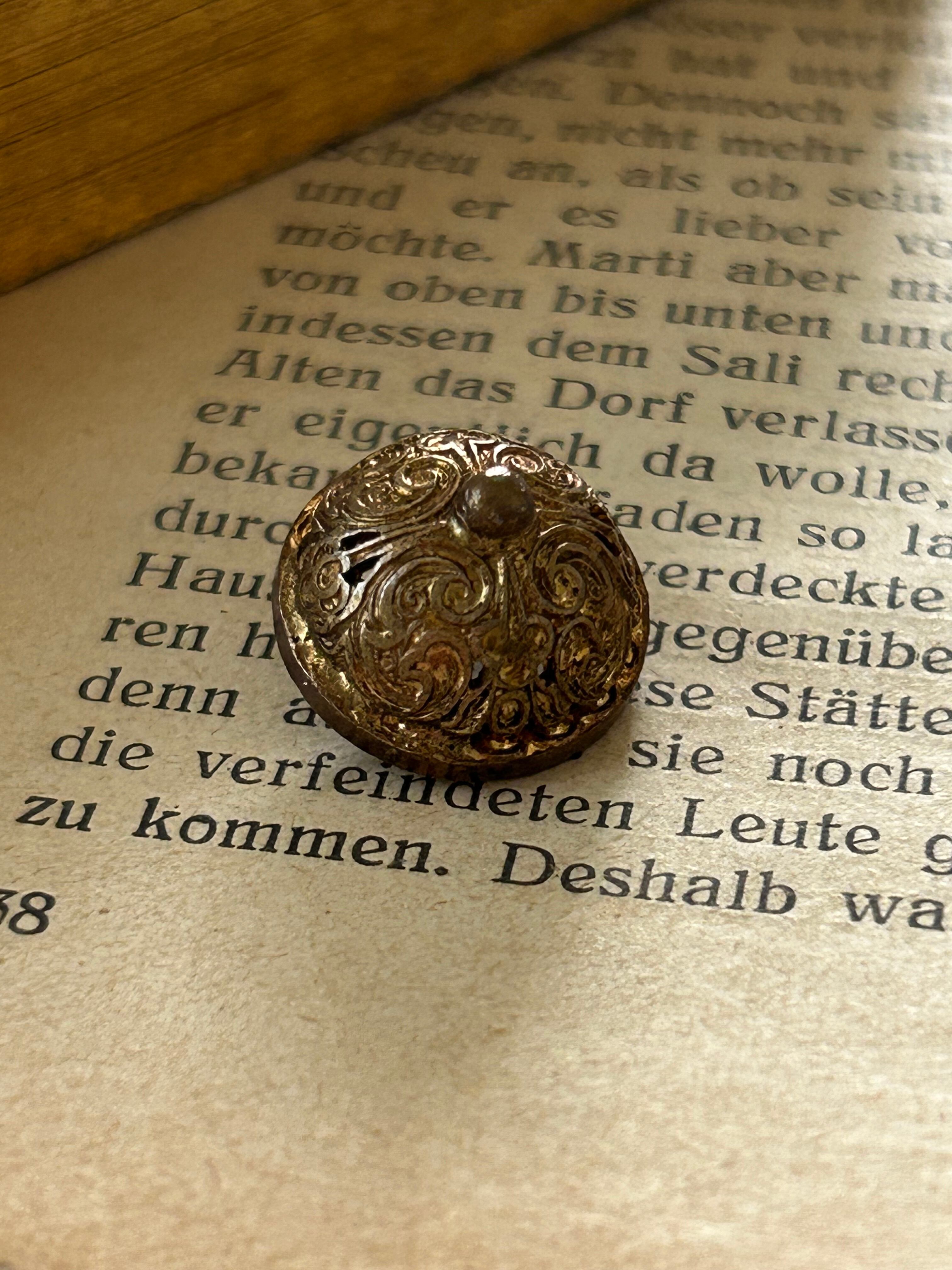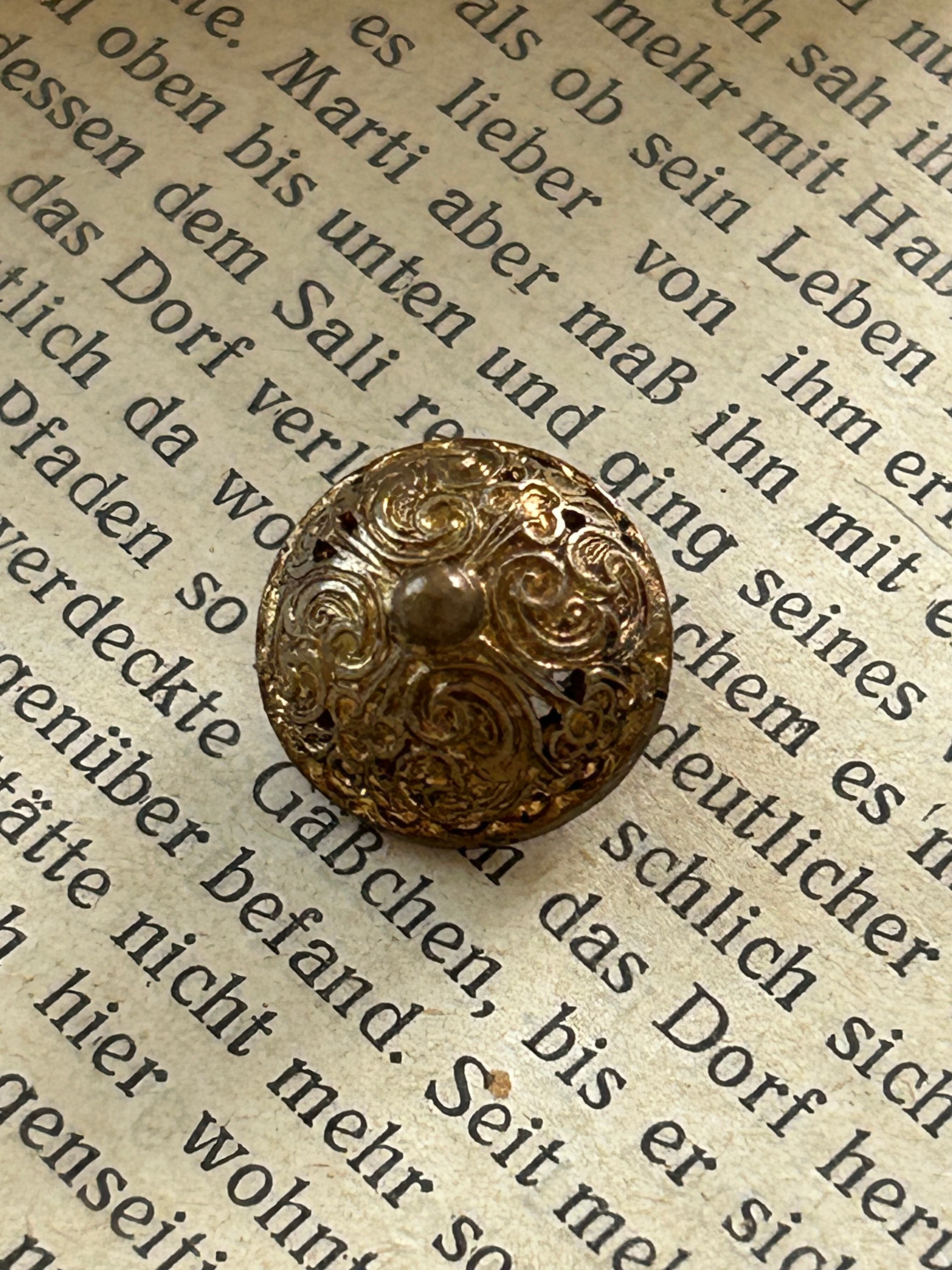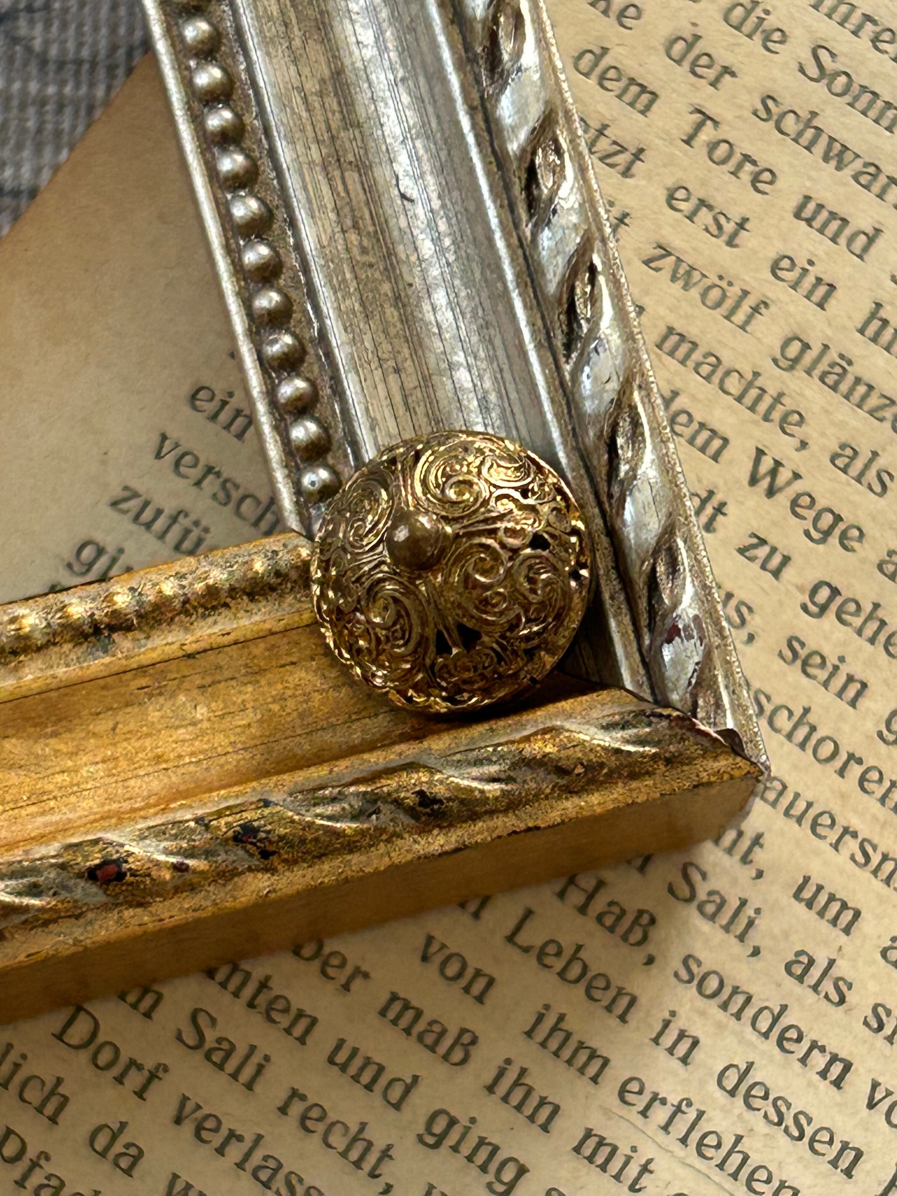 レースのような繊細な模様が美しく、クラシカルなドーム型のアンティークボタンです。