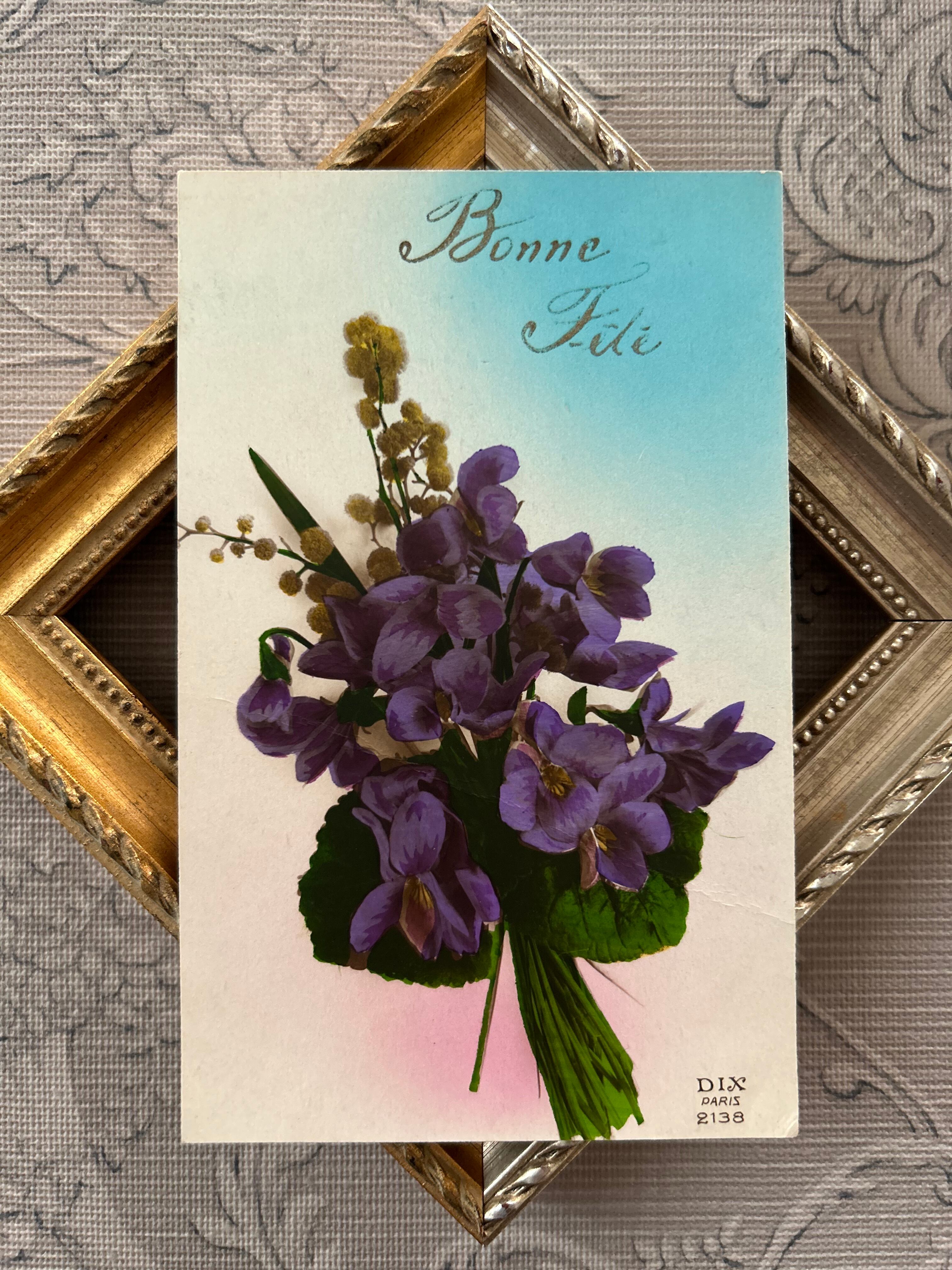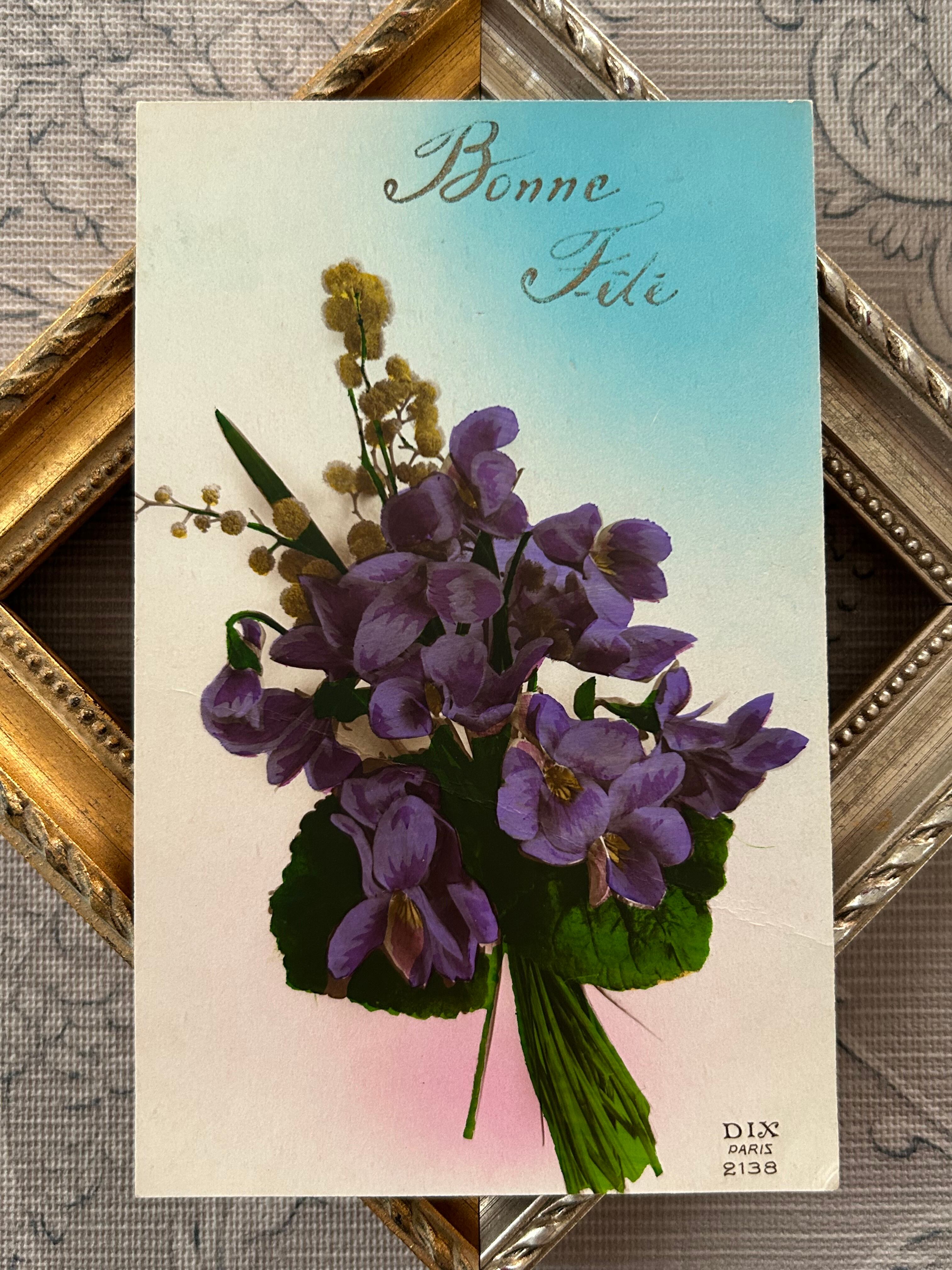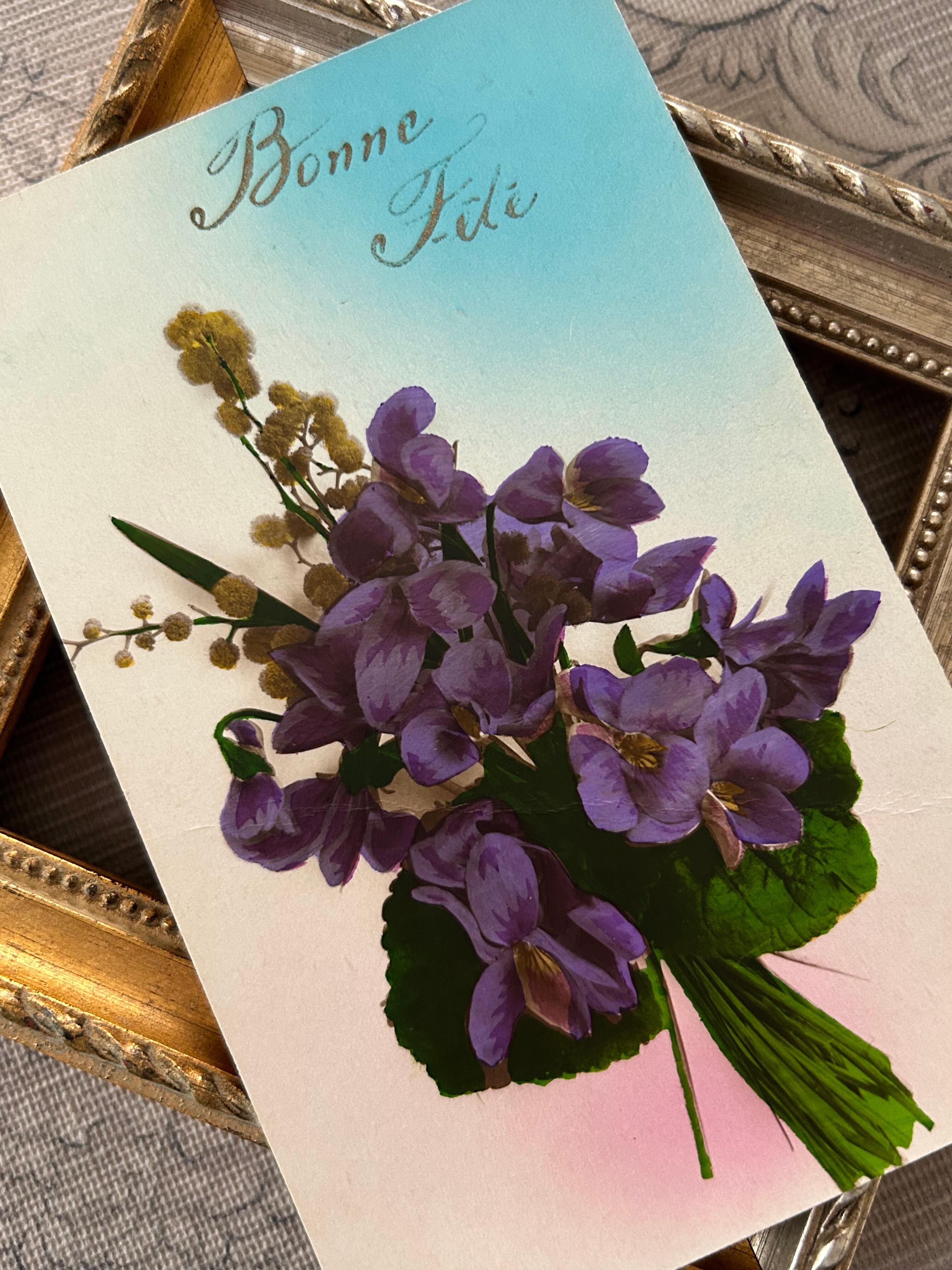 アンティークポストカード Bonne fete すみれとミモザのブーケ フランス 額装 インテリア 撮影小物 BE