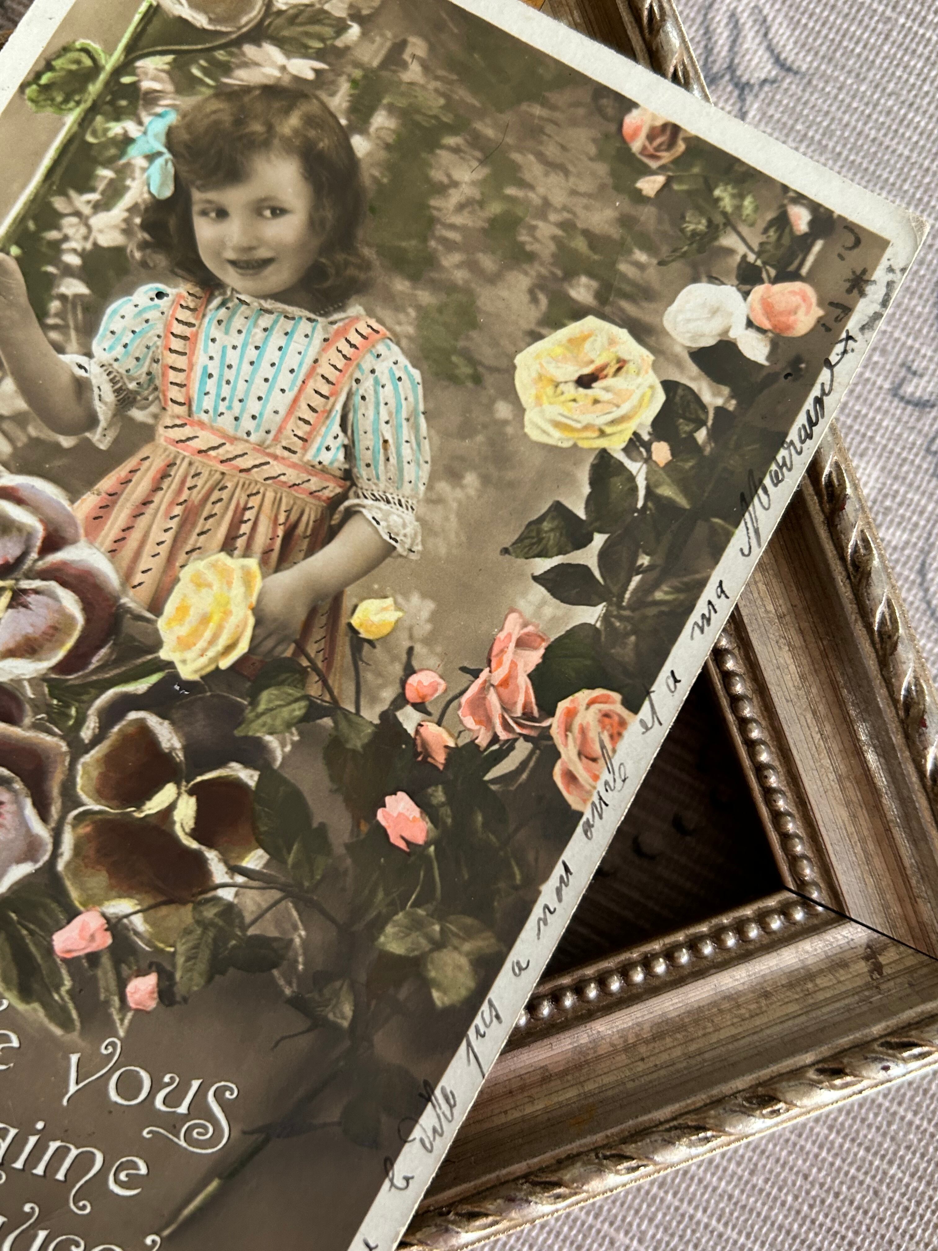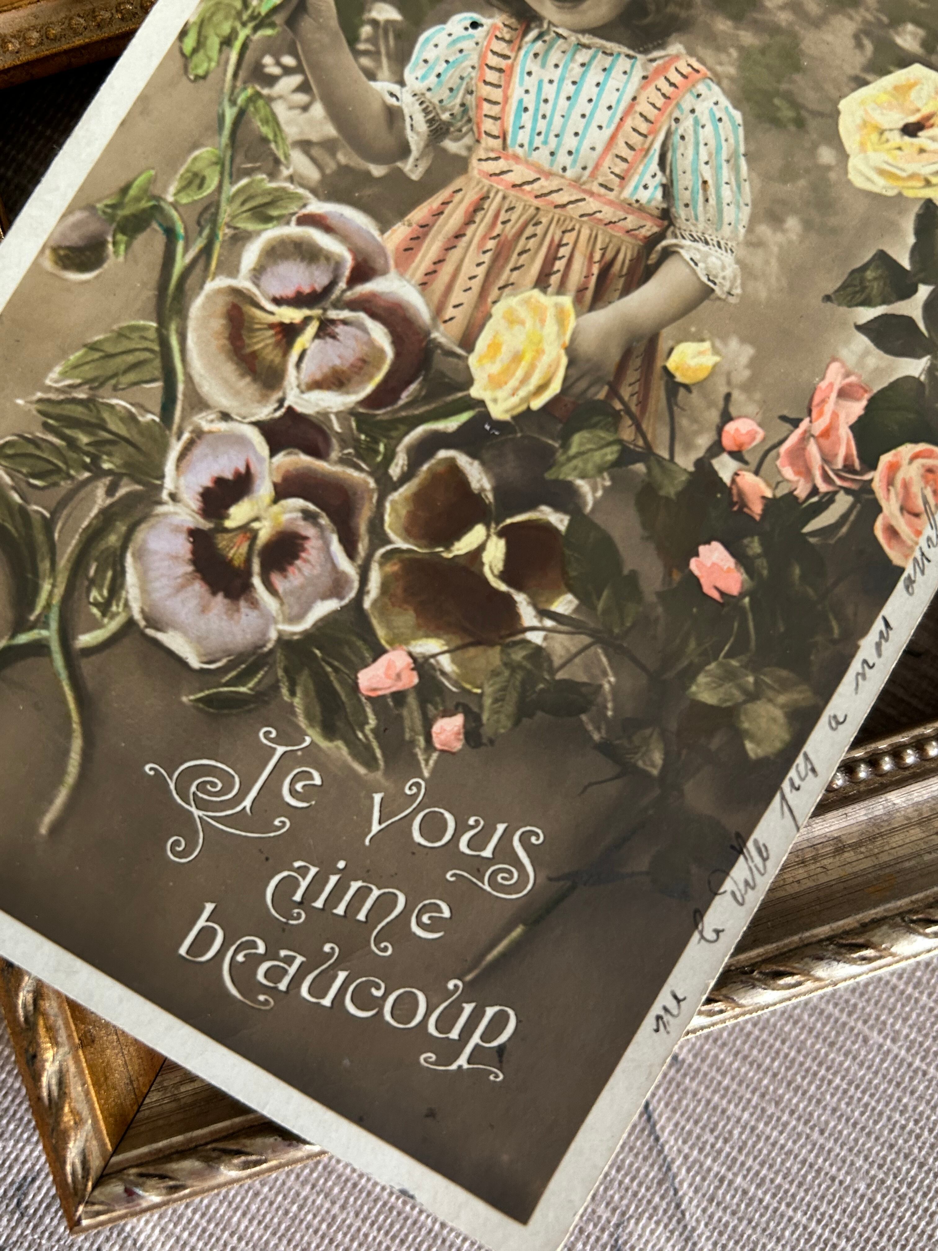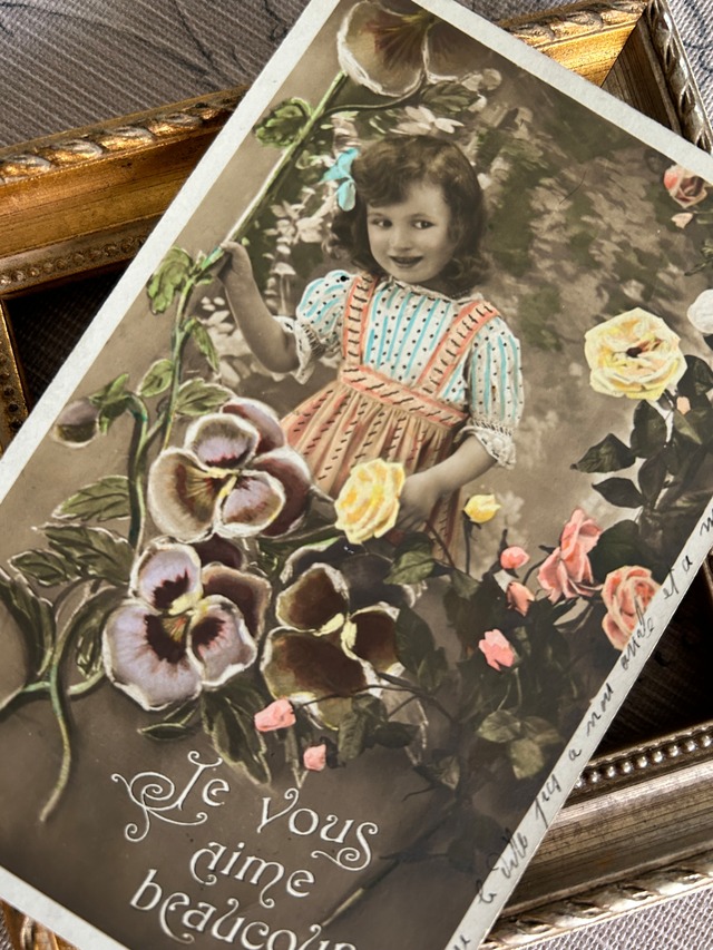 フランスアンティークカード 少女とパンジー Je vous aime beaucoup 額装 インテリア 薔薇 Rose