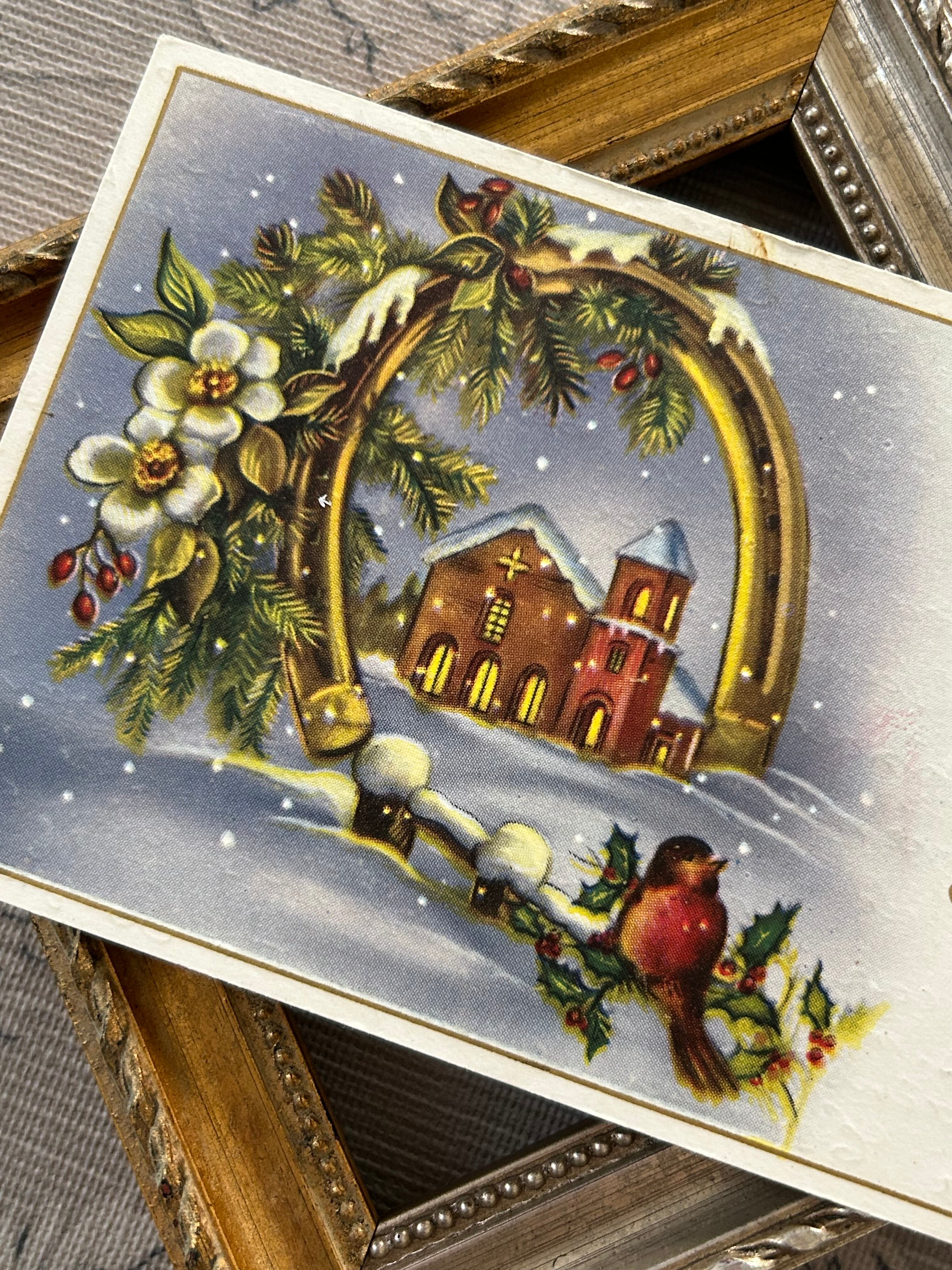 アンティークポストカード Bonne Anee 馬蹄 柊 雪景色 小鳥 1960年 フランス 額装 インテリア コレクション