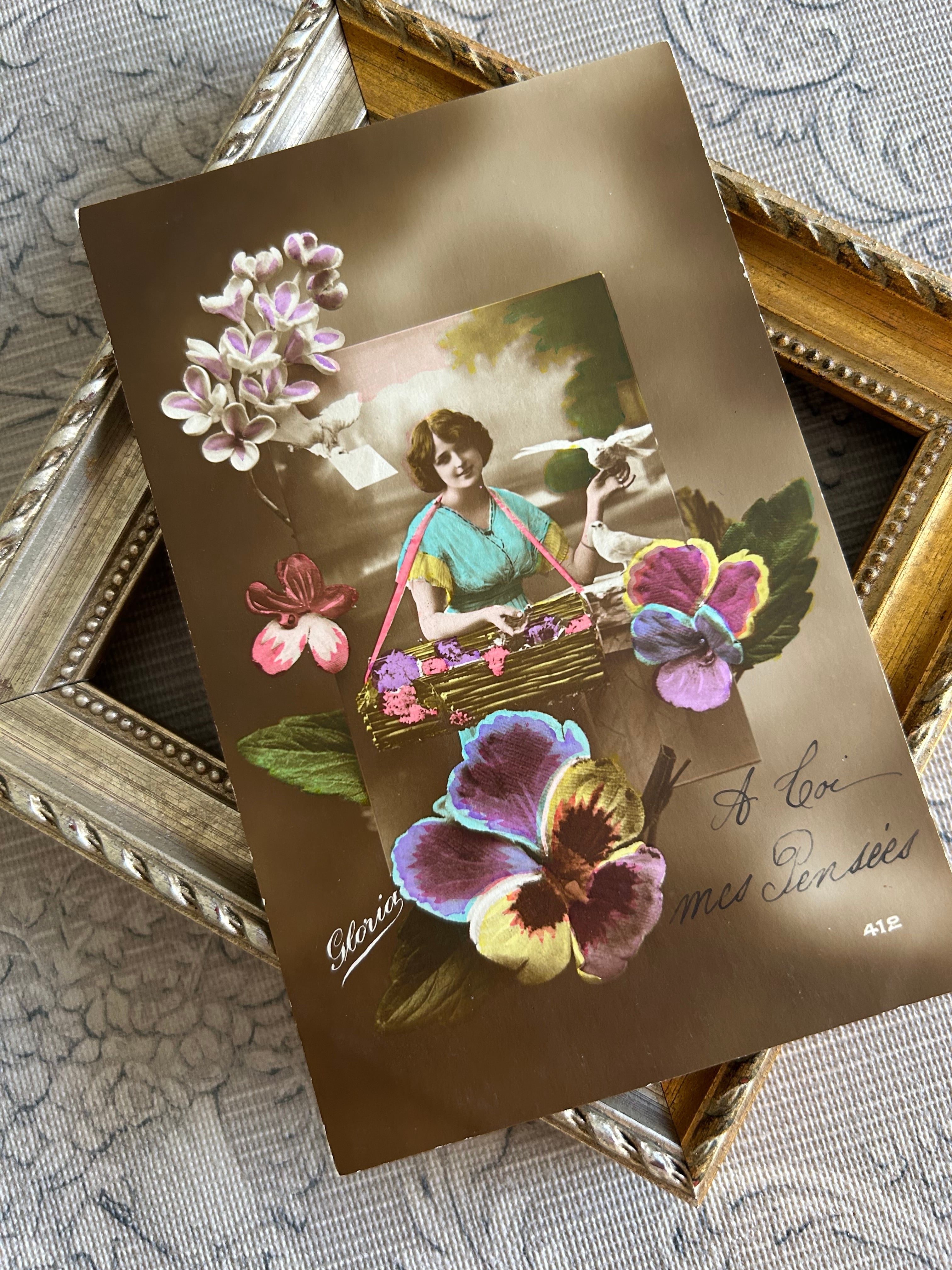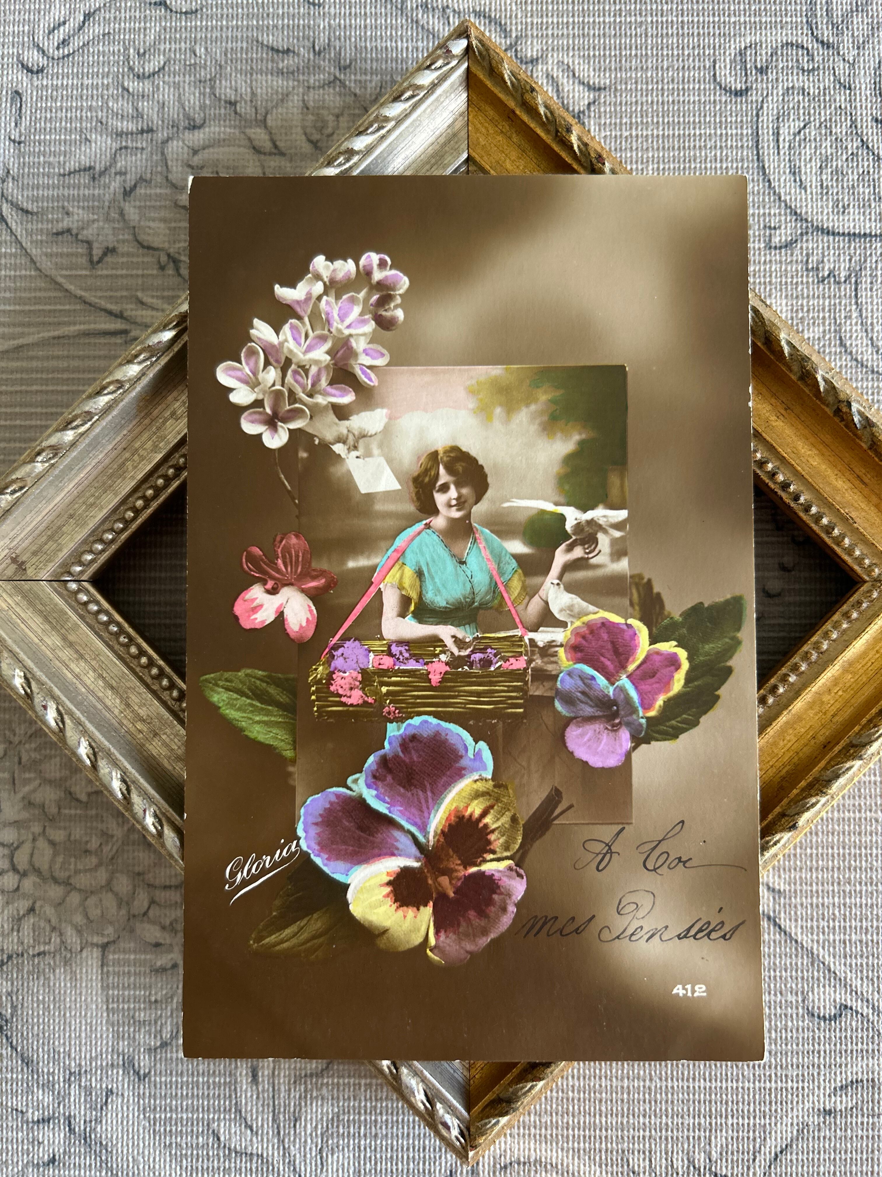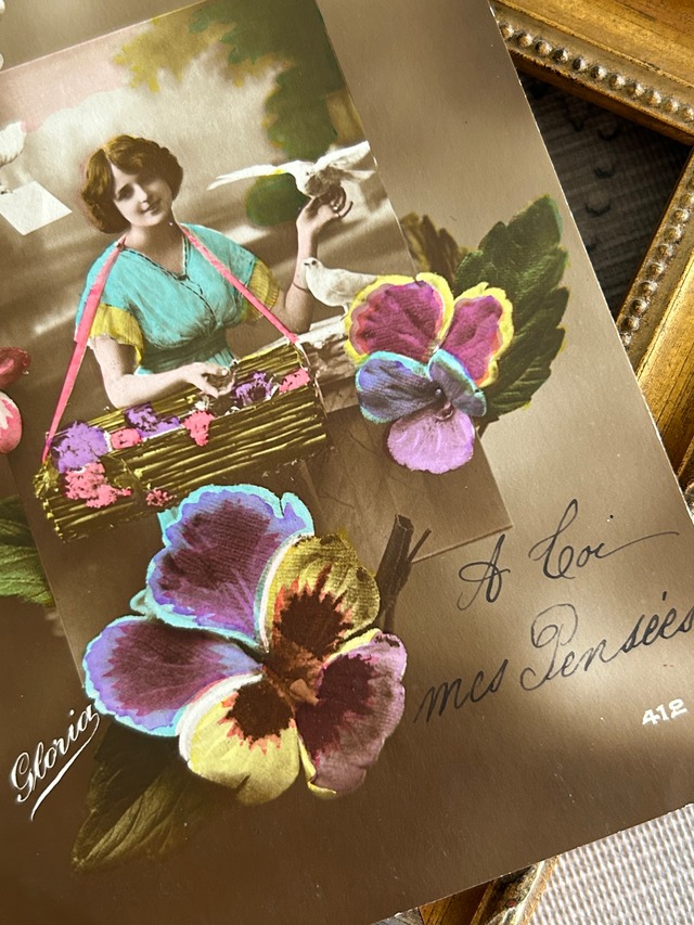 アンティークポストカード パンジーとマダム 白鳩 1917年 ライラック Pansy 額装 インテリア フランス