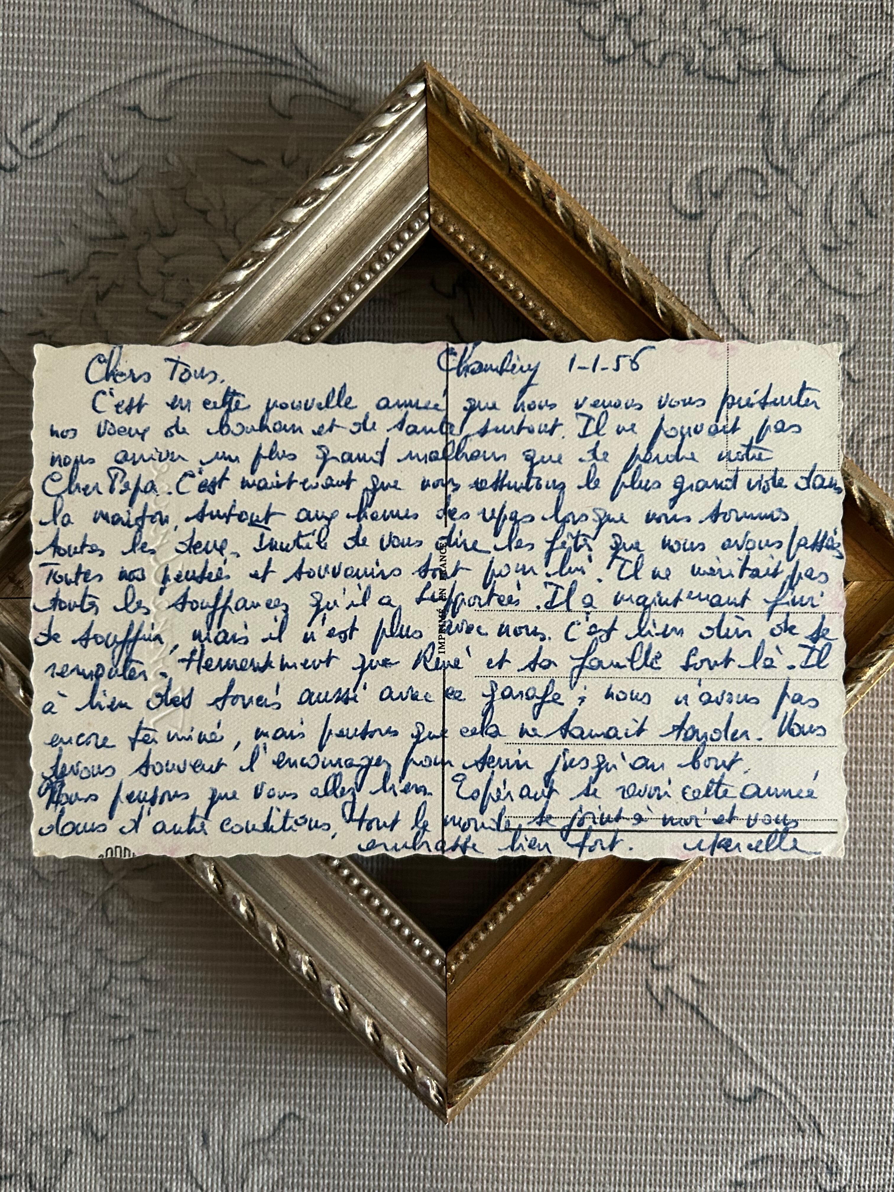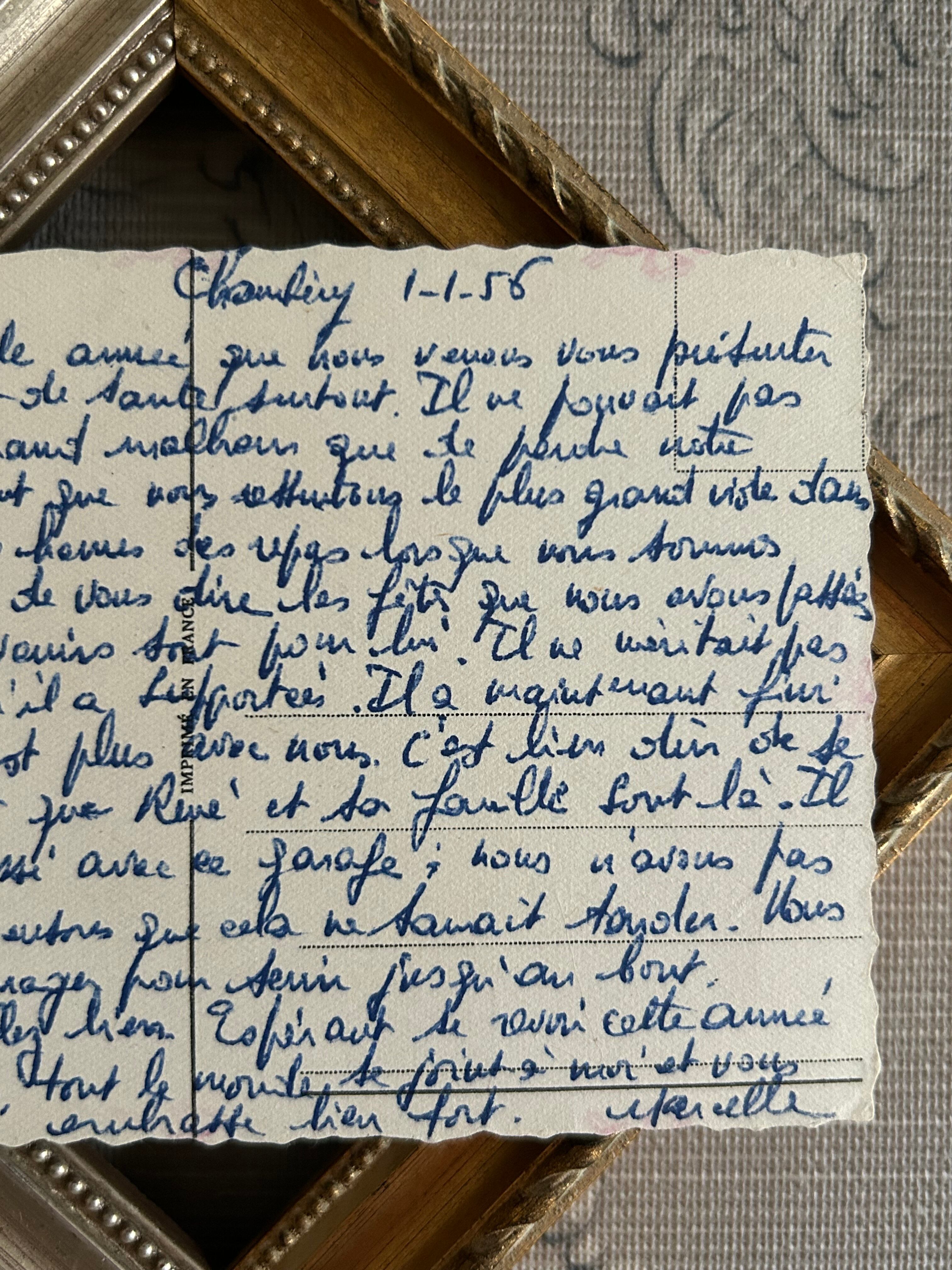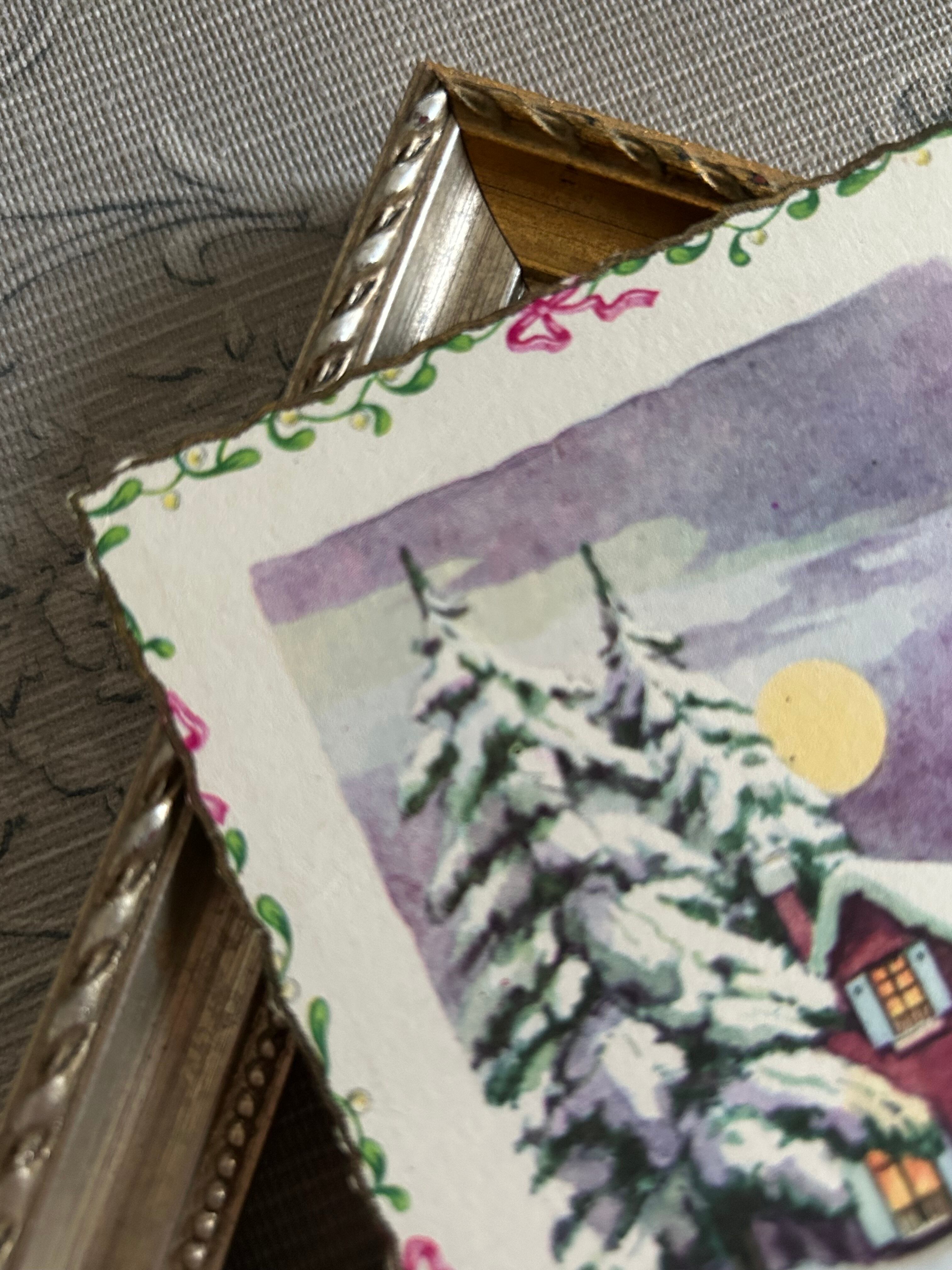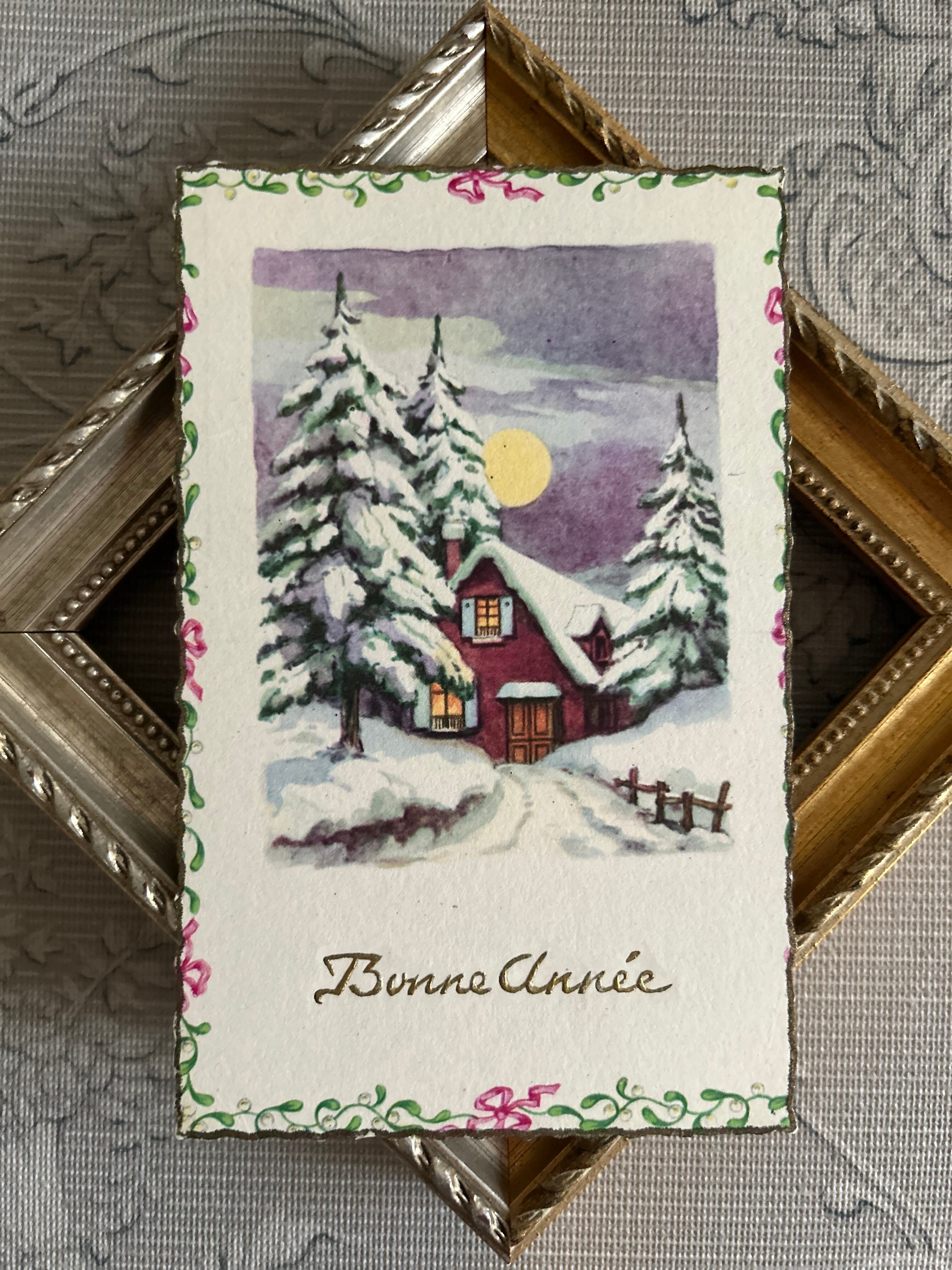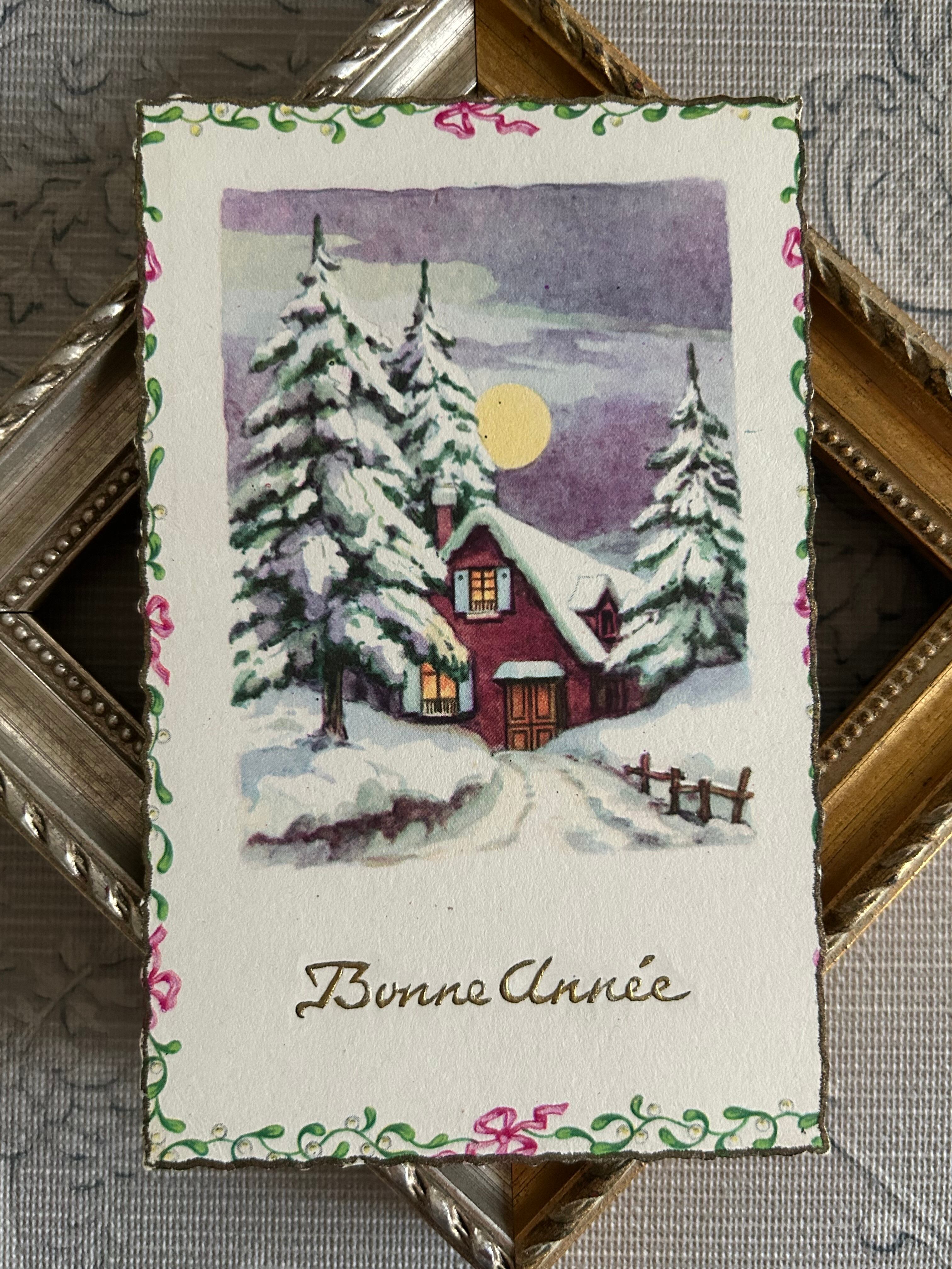 アンティークポストカード Bonne Anee 雪景色 月夜 ヤドリギ Ruban リボン 1956年 フランス 額装 インテリア コレクション