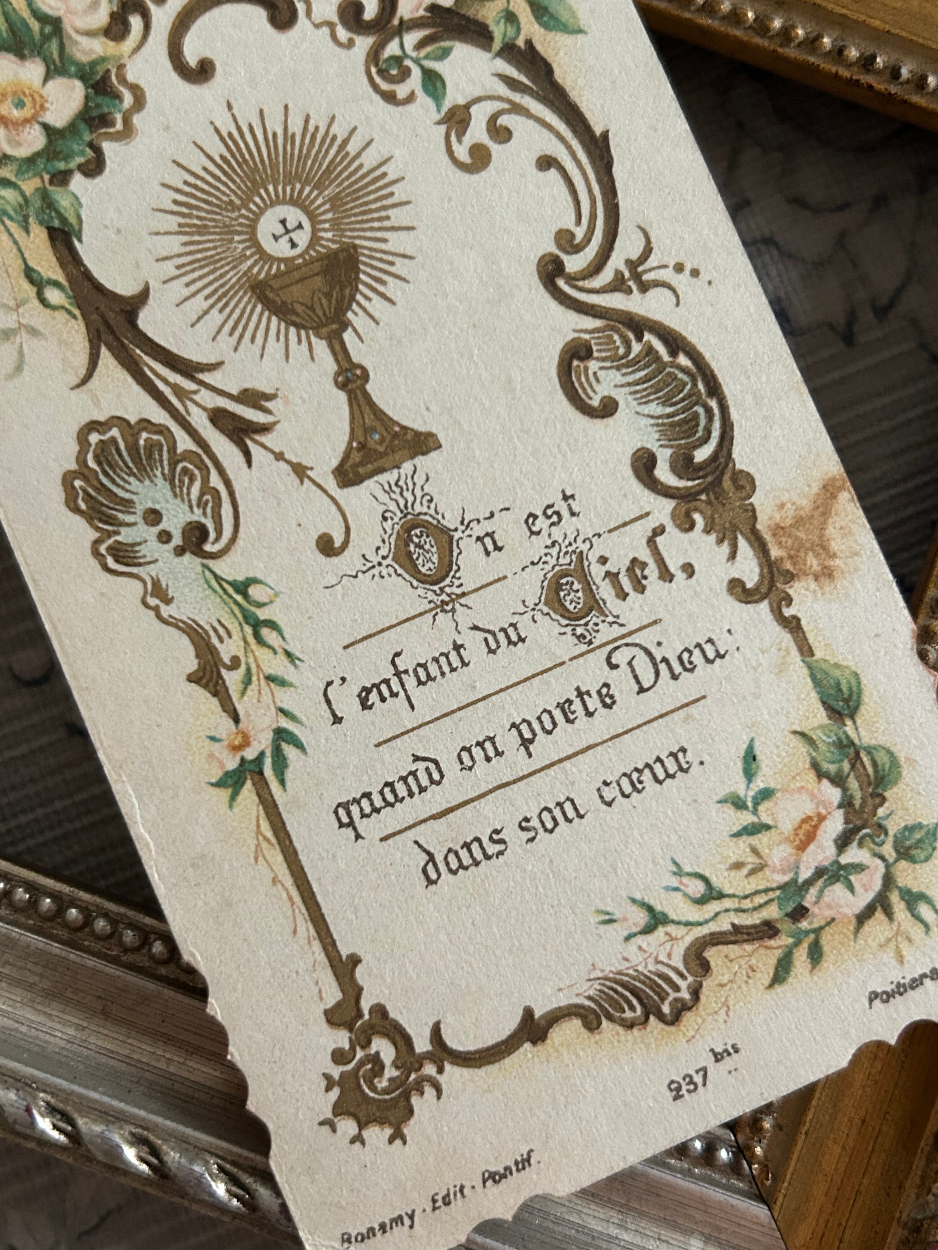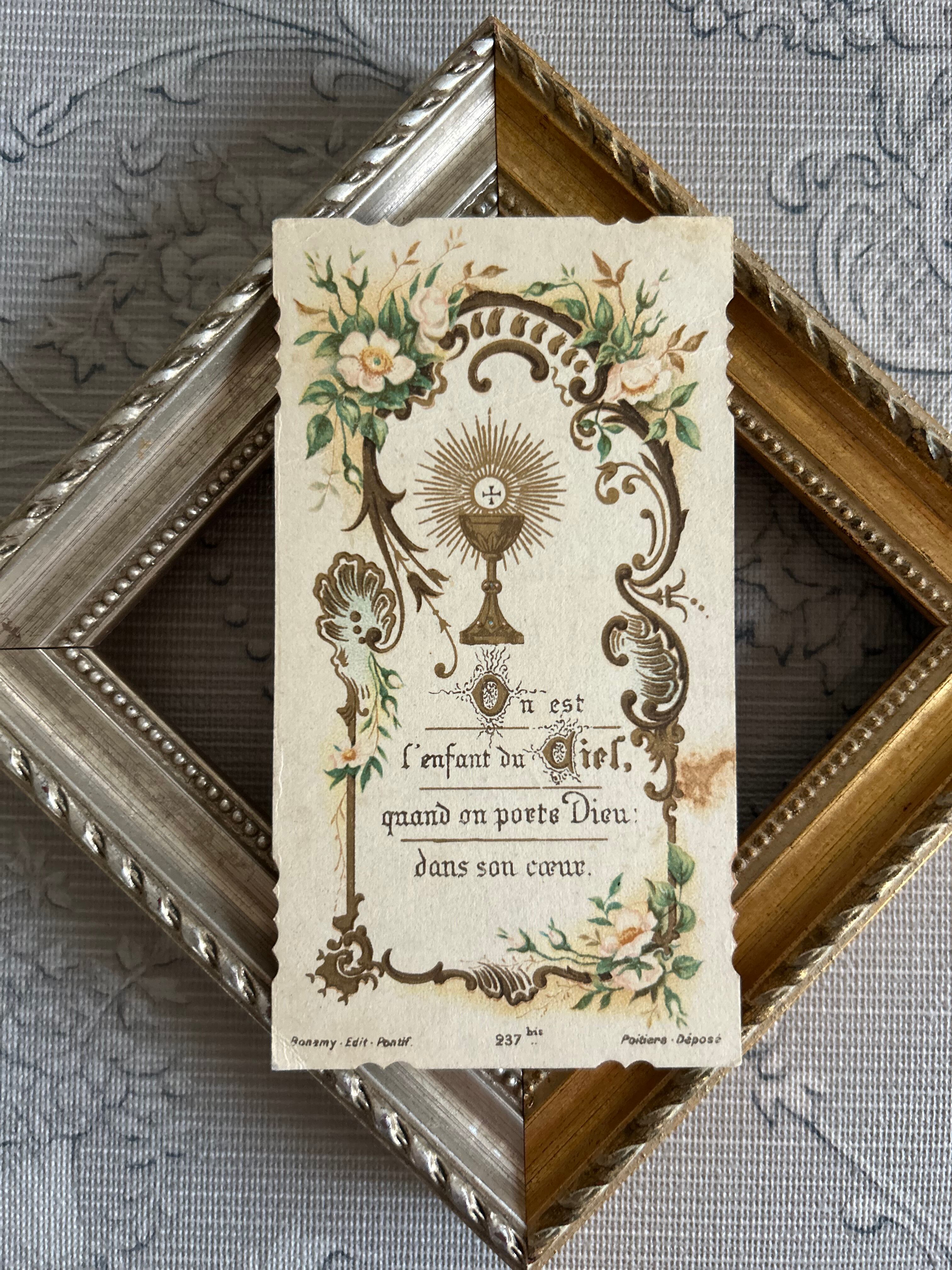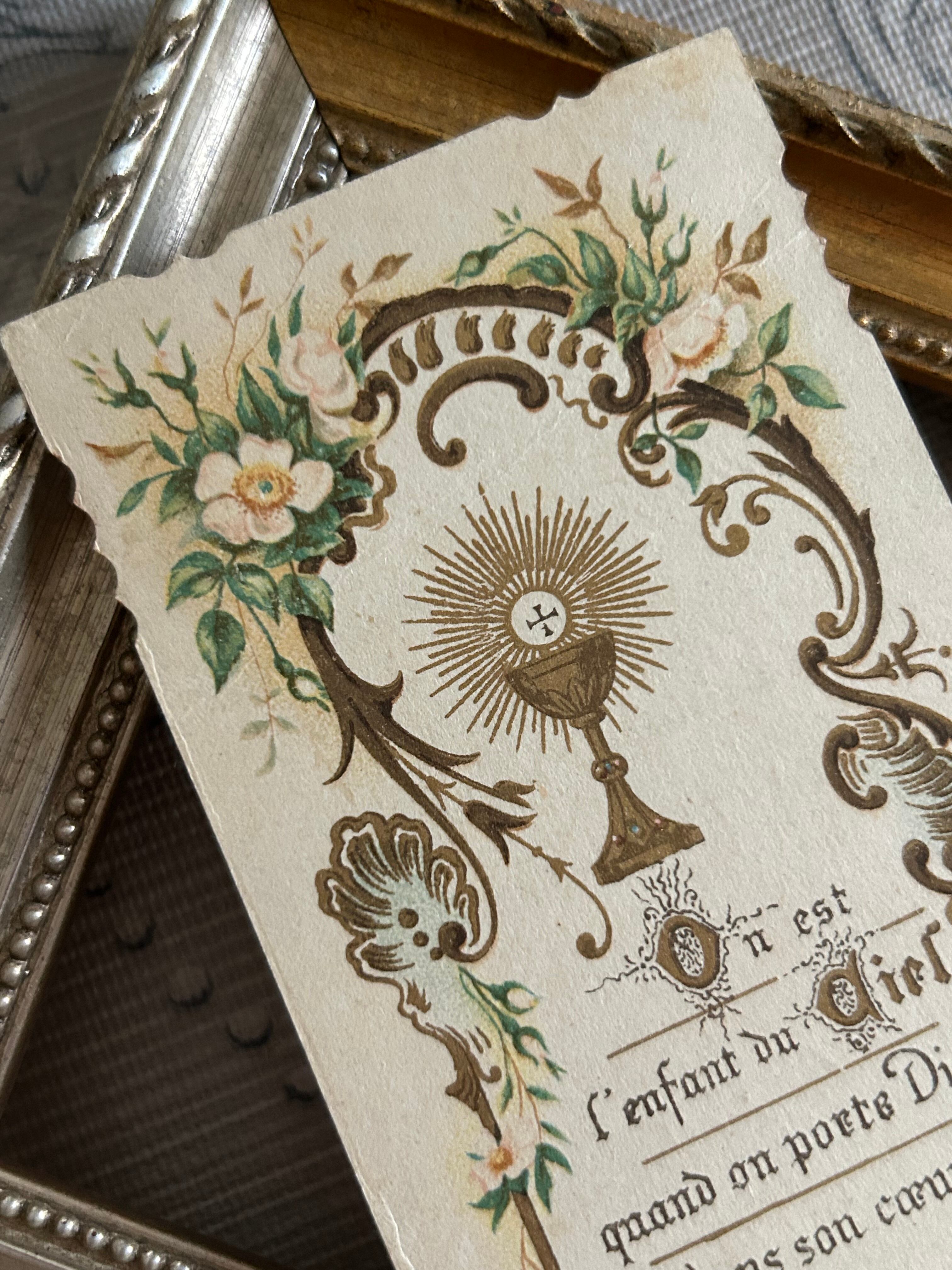 フランスアンティーク Holy Card ホーリーカード フラワー 聖杯 1905年 額装 撮影小物 インテリア コレクション