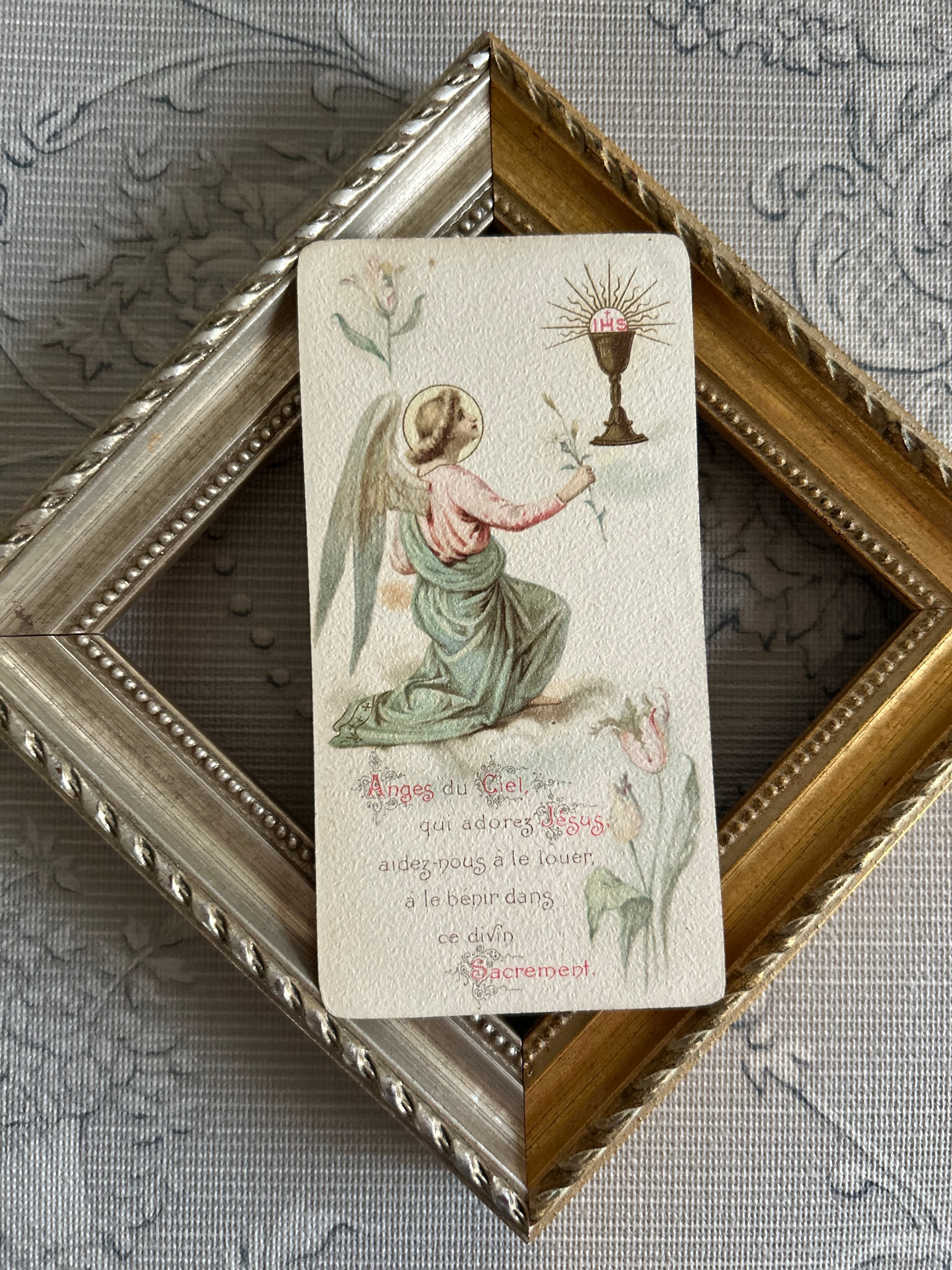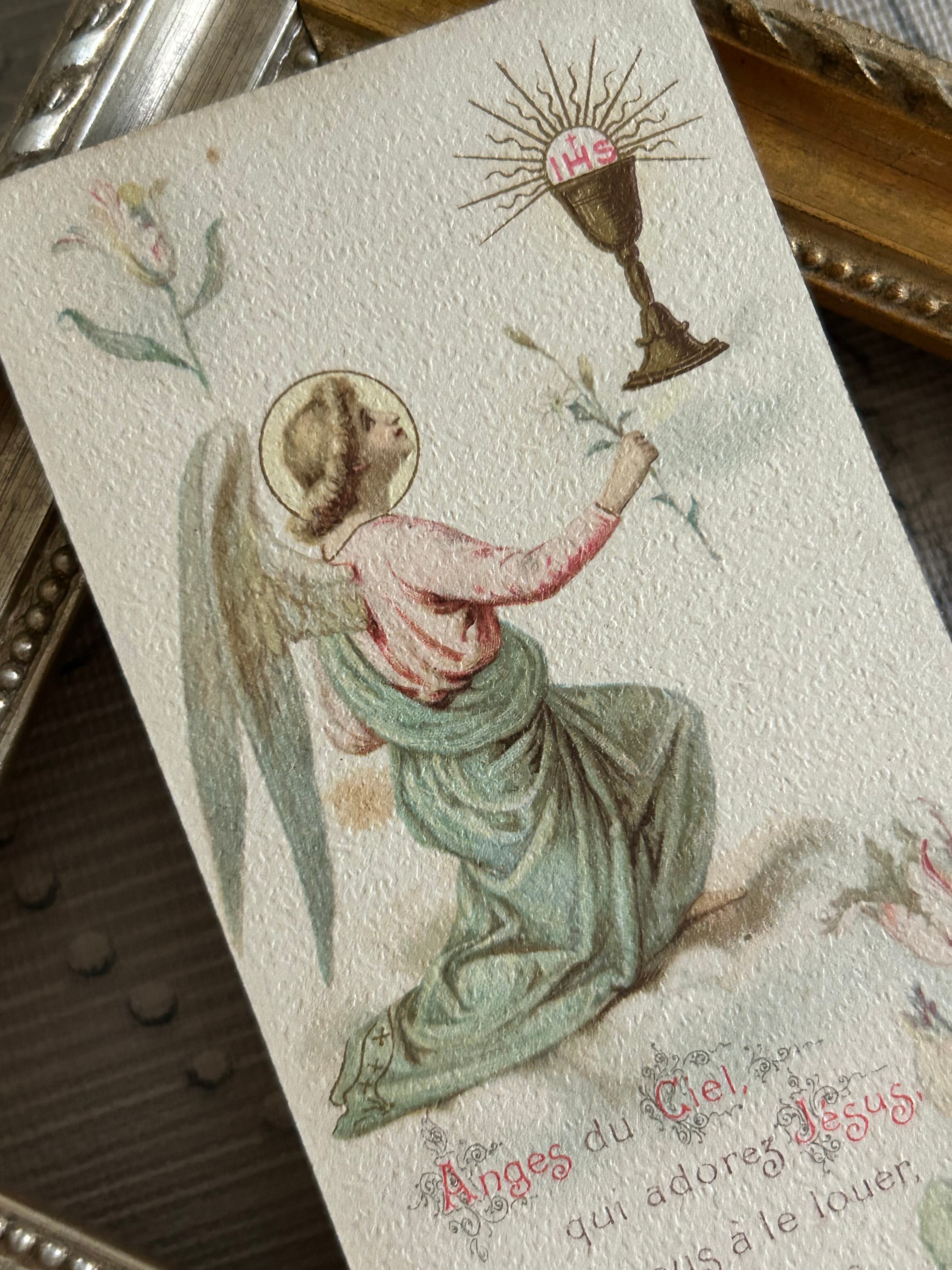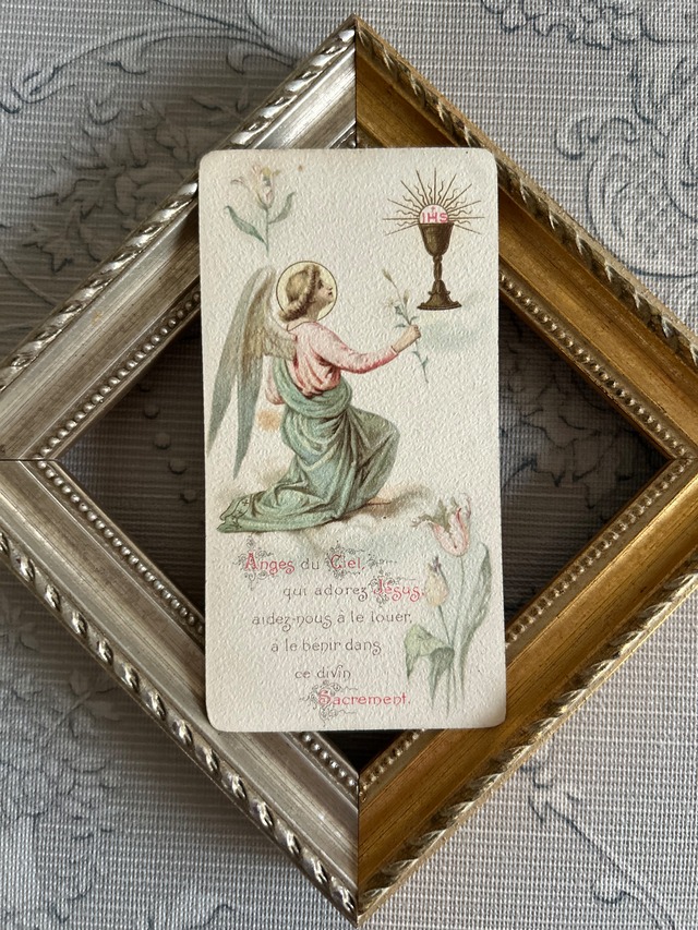 フランスアンティーク Holy Card ホーリーカード フラワー 聖杯 天使 1904年 額装 撮影小物 インテリア コレクション M