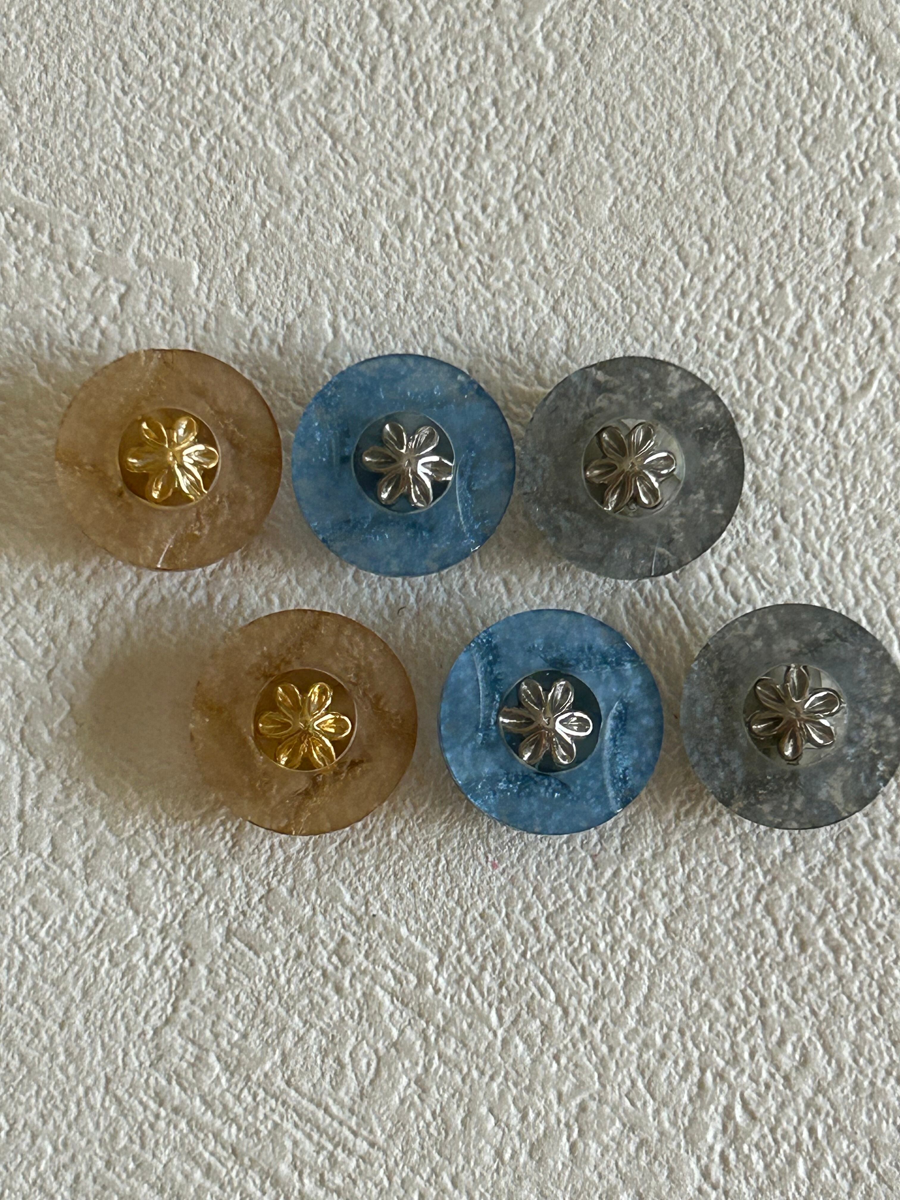 3色のプラスチックボタンの中央に画像の様な小さなお花のパーツが埋め込まれています。