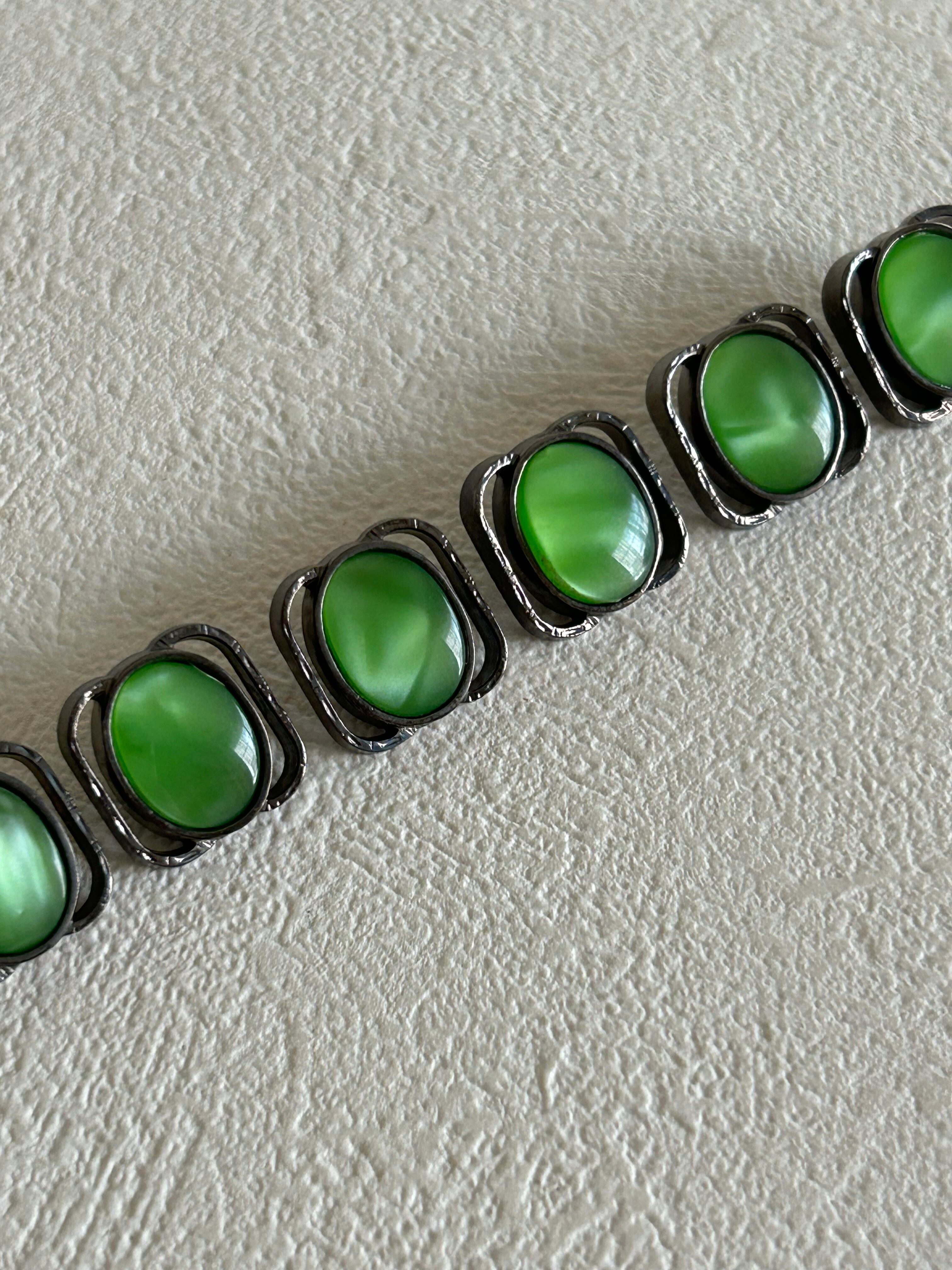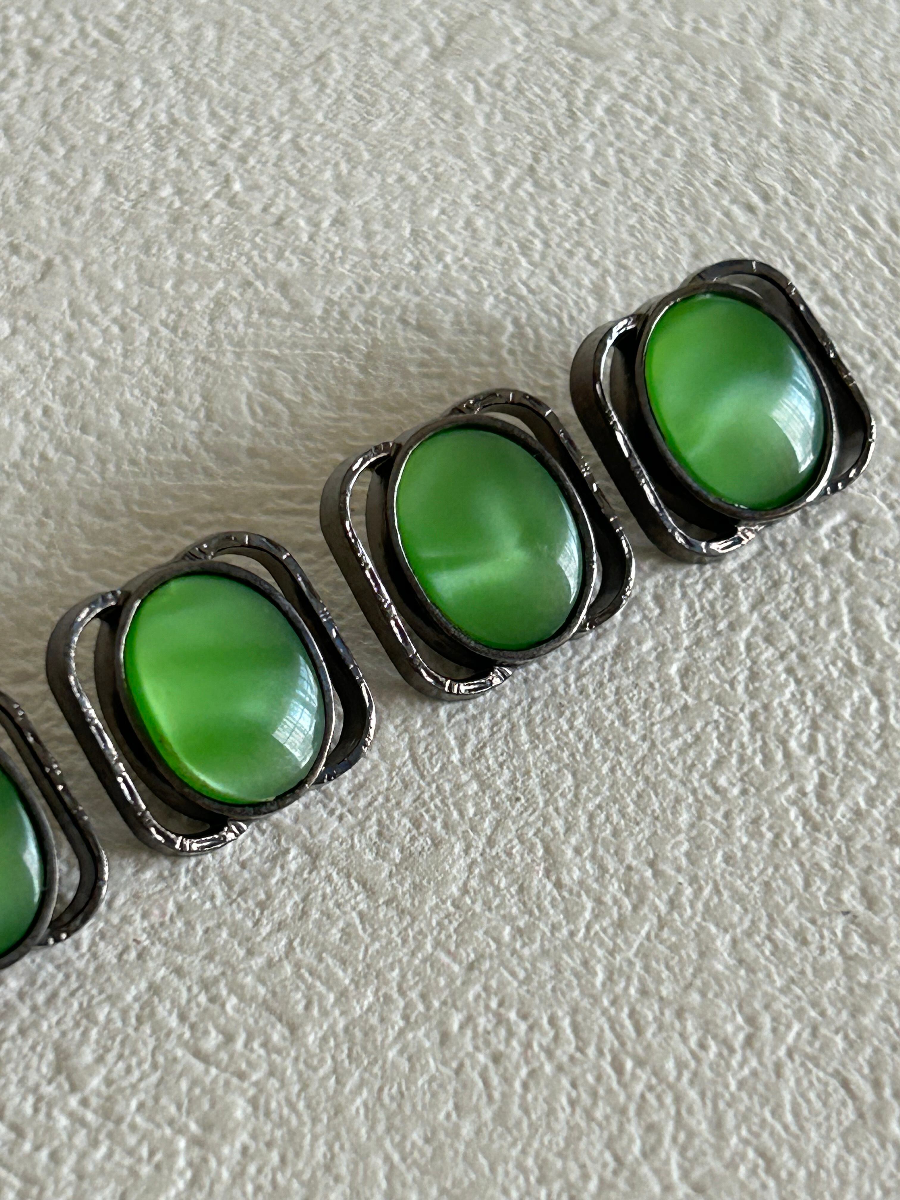 ダークシルバーカラーの台座の中央に艶やかで発色の良いグリーンのカボションが設置されています。