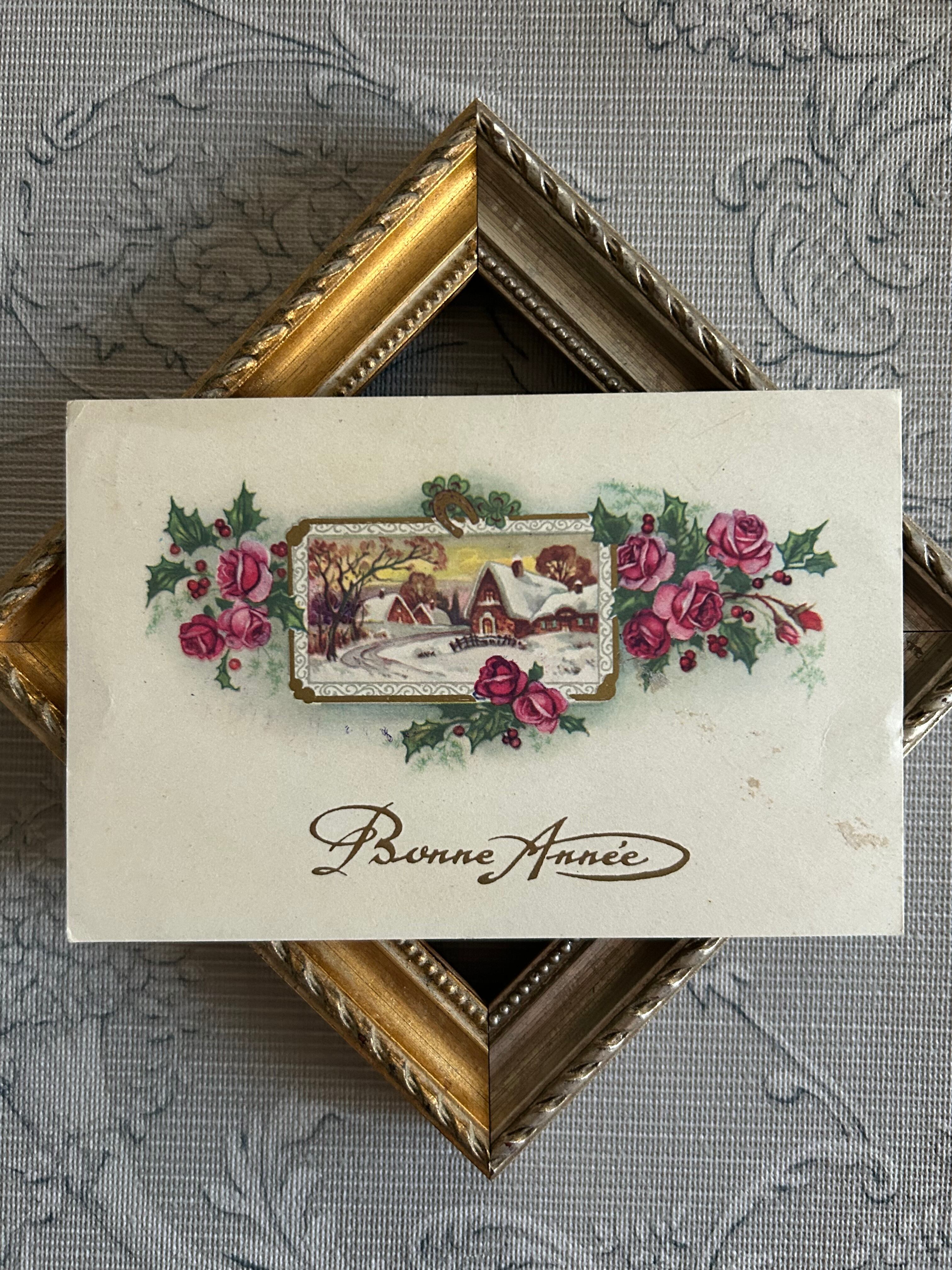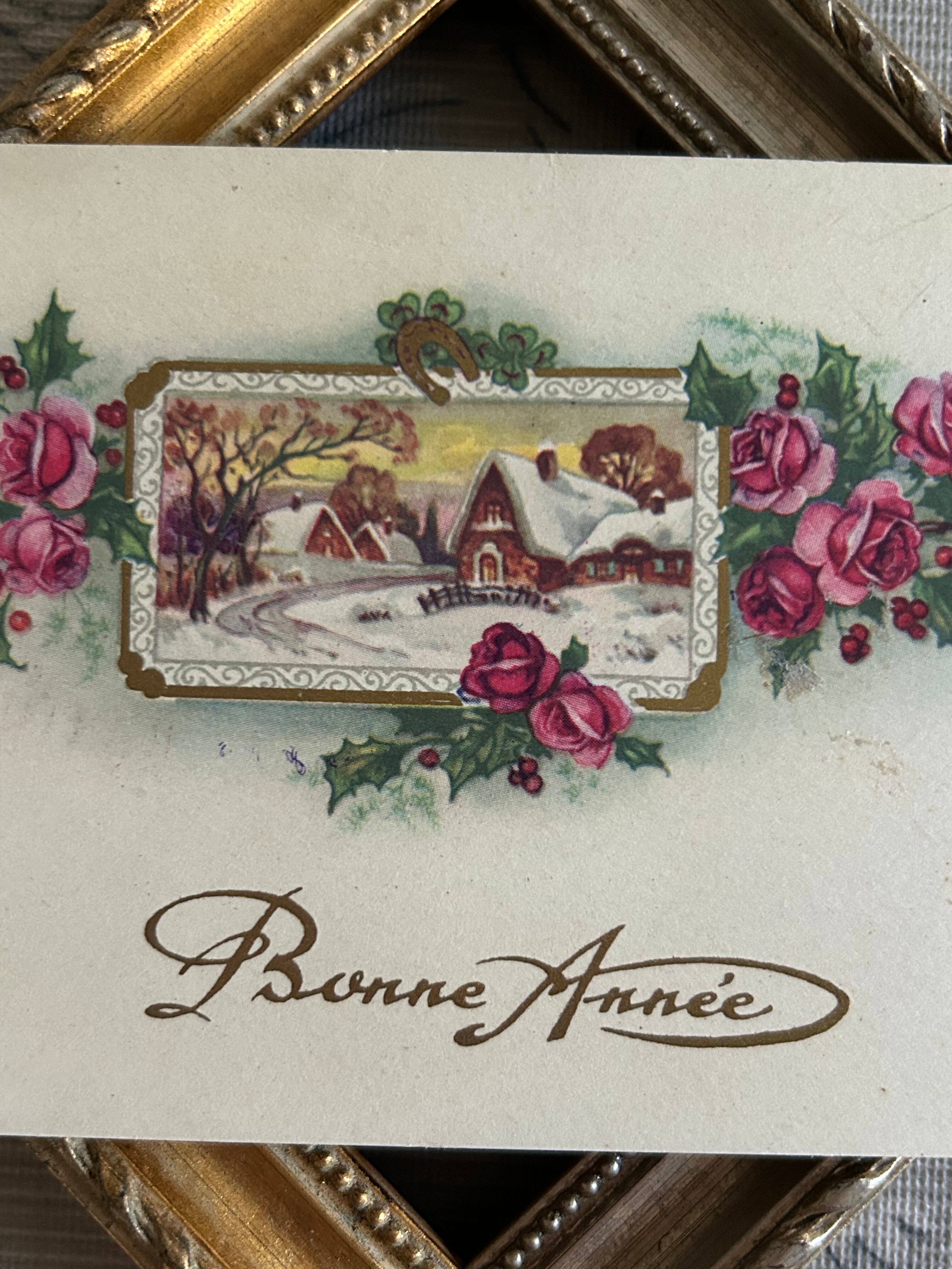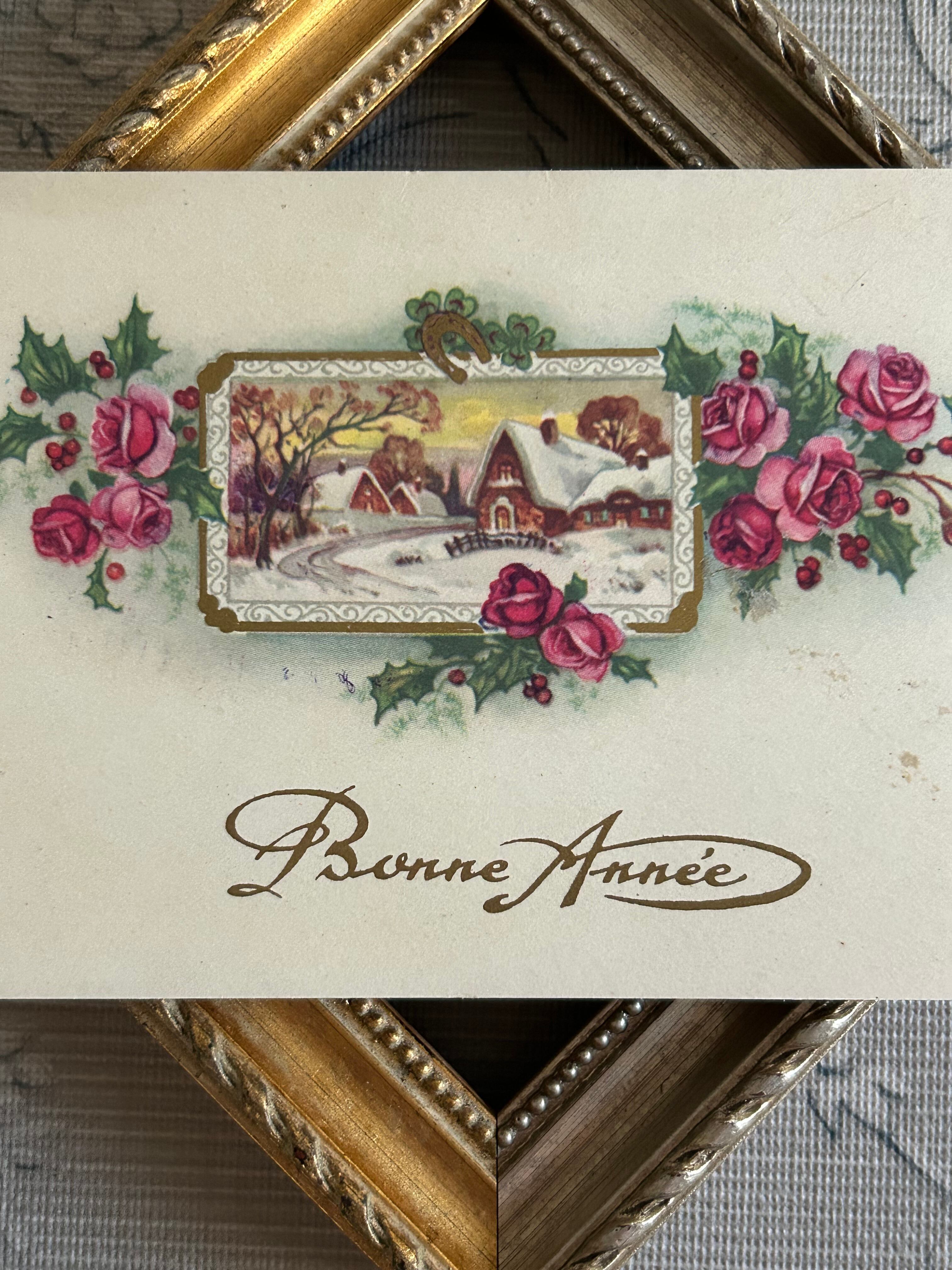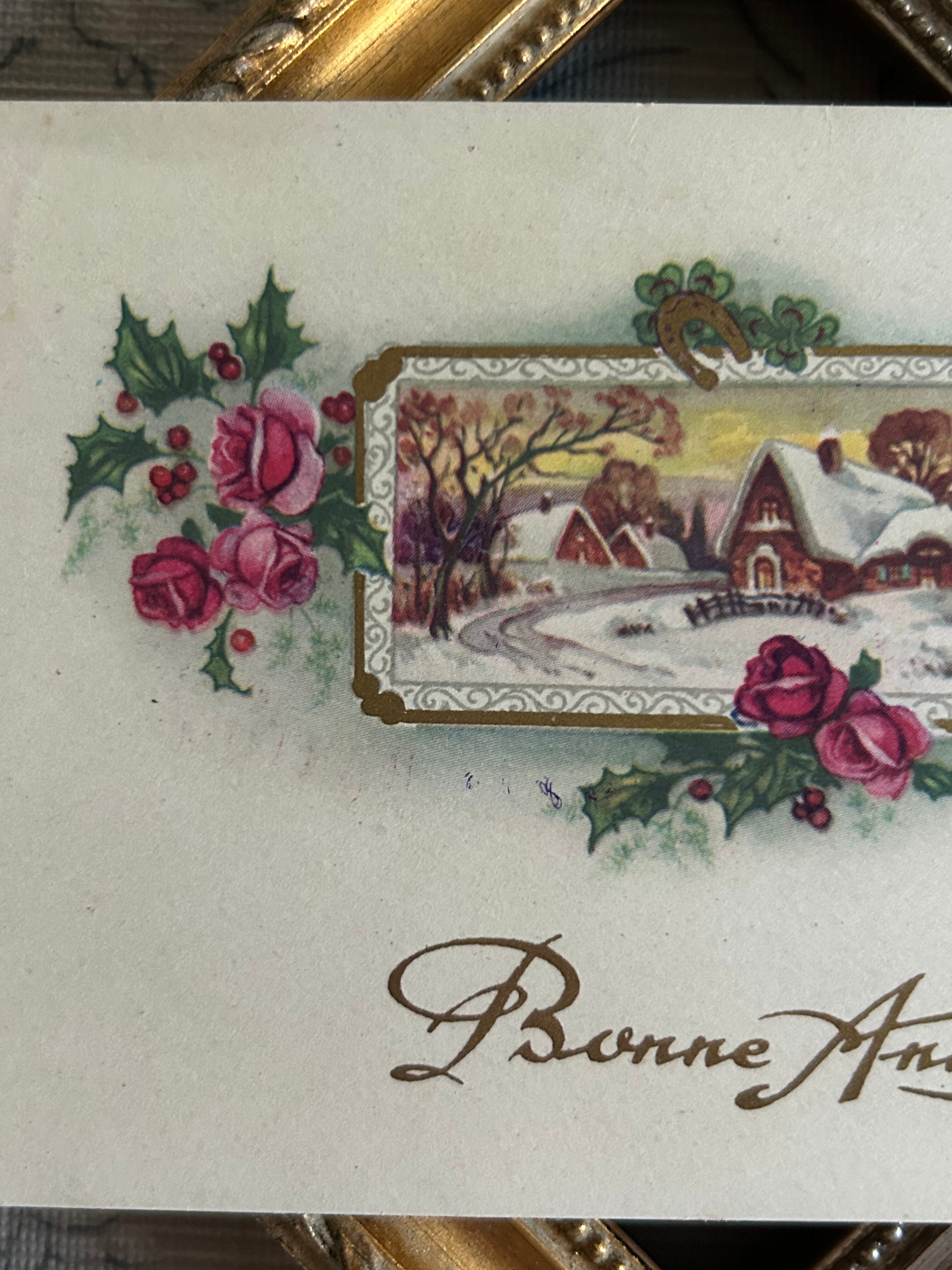 アンティークポストカード Bonne Anee 馬蹄 柊 雪景色 薔薇 1954年 フランス 額装 インテリア コレクション Noel