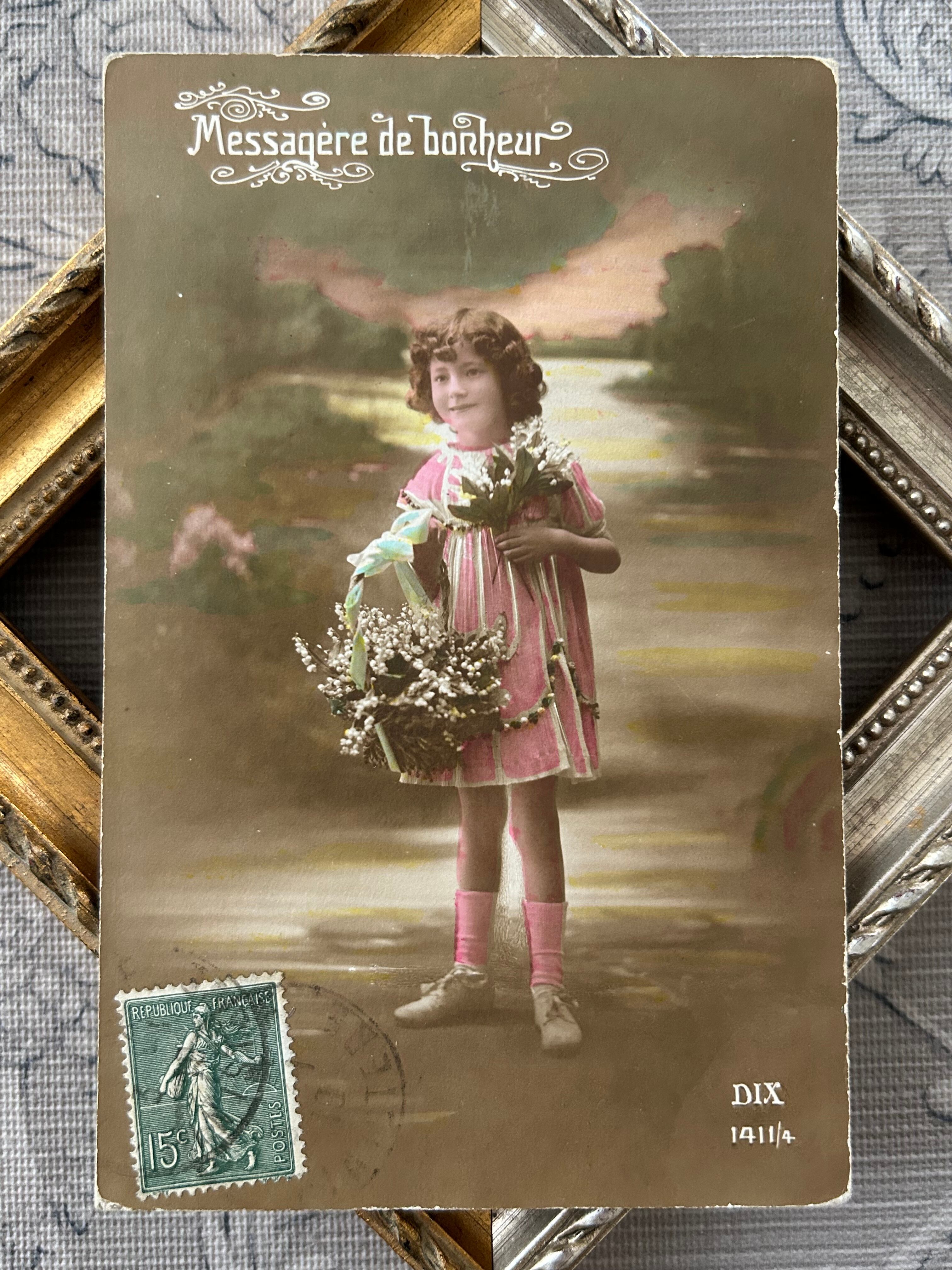 フランスアンティークカード すずらんのブーケとパニエを持った少女 Muget すずらん Messagere de bonheur 額装 インテリア