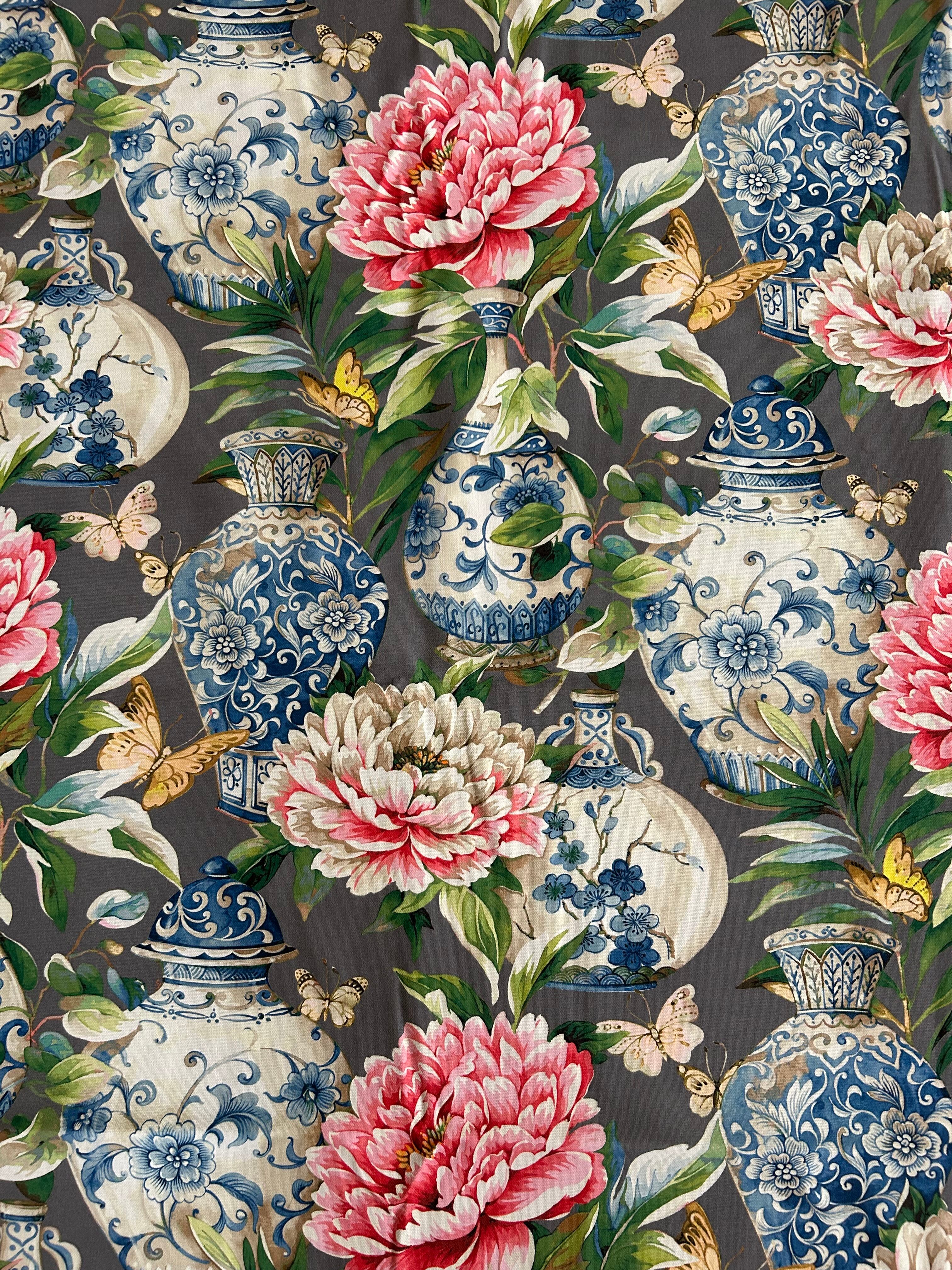 グレーの地にジンジャーポット、花鳥柄、芍薬がプリントされています。