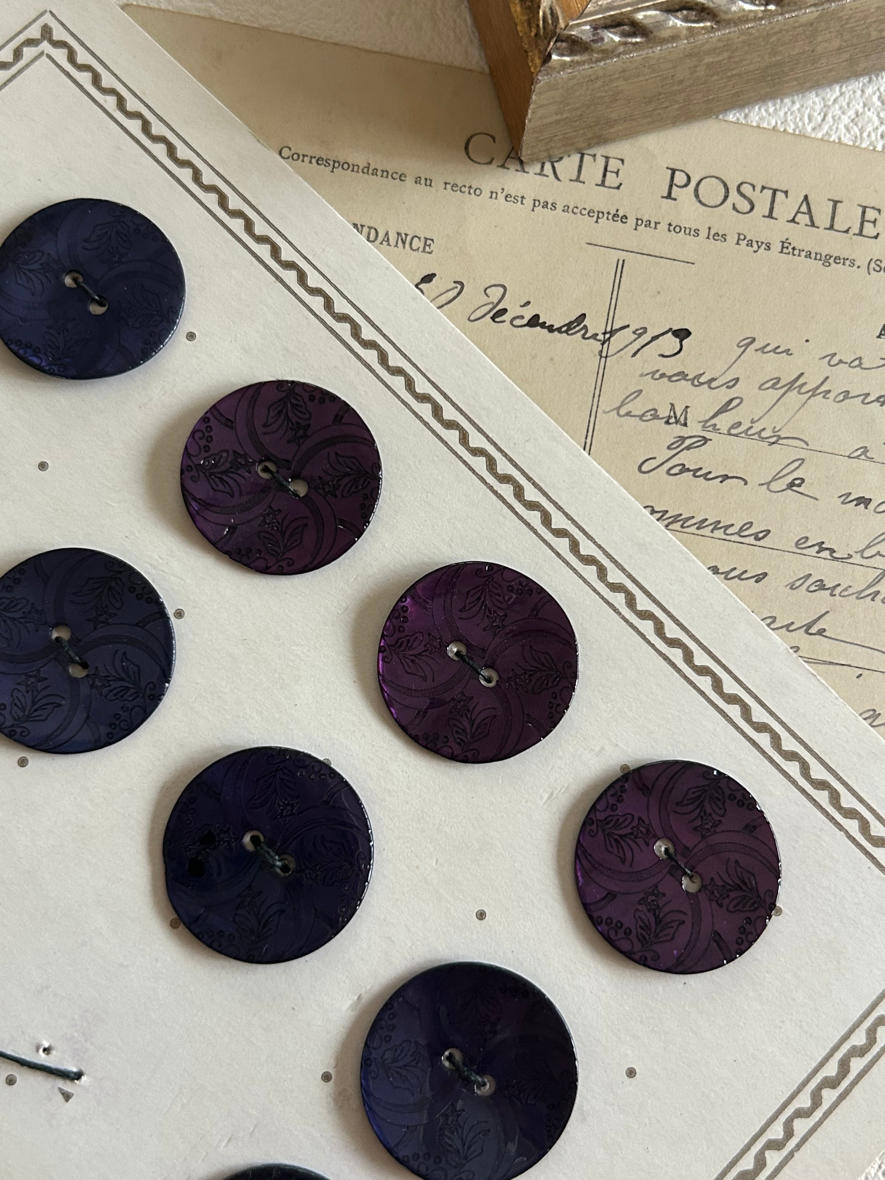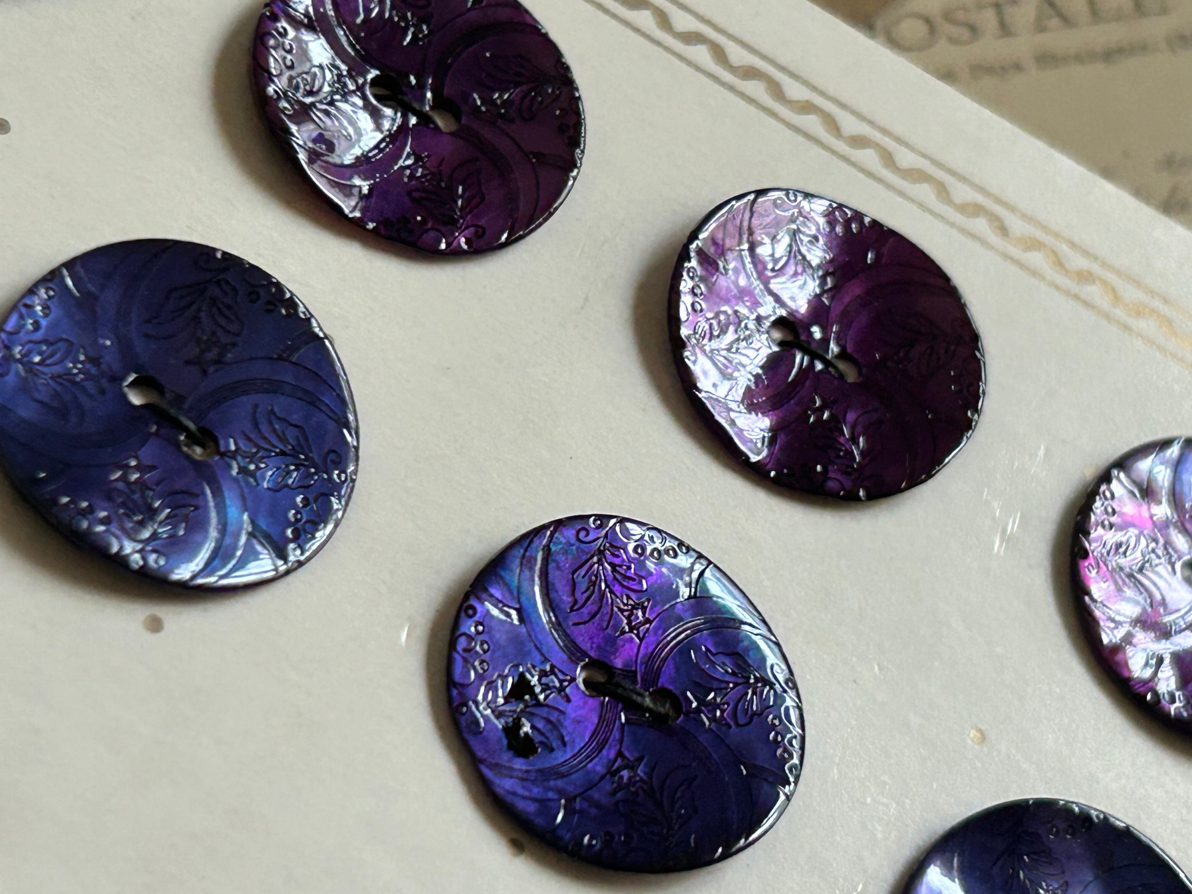 フランスVintageボタン シェルボタン 赤紫/青紫 二つ穴 22mm 彫り模様 アクセサリーパーツ デコレーション材