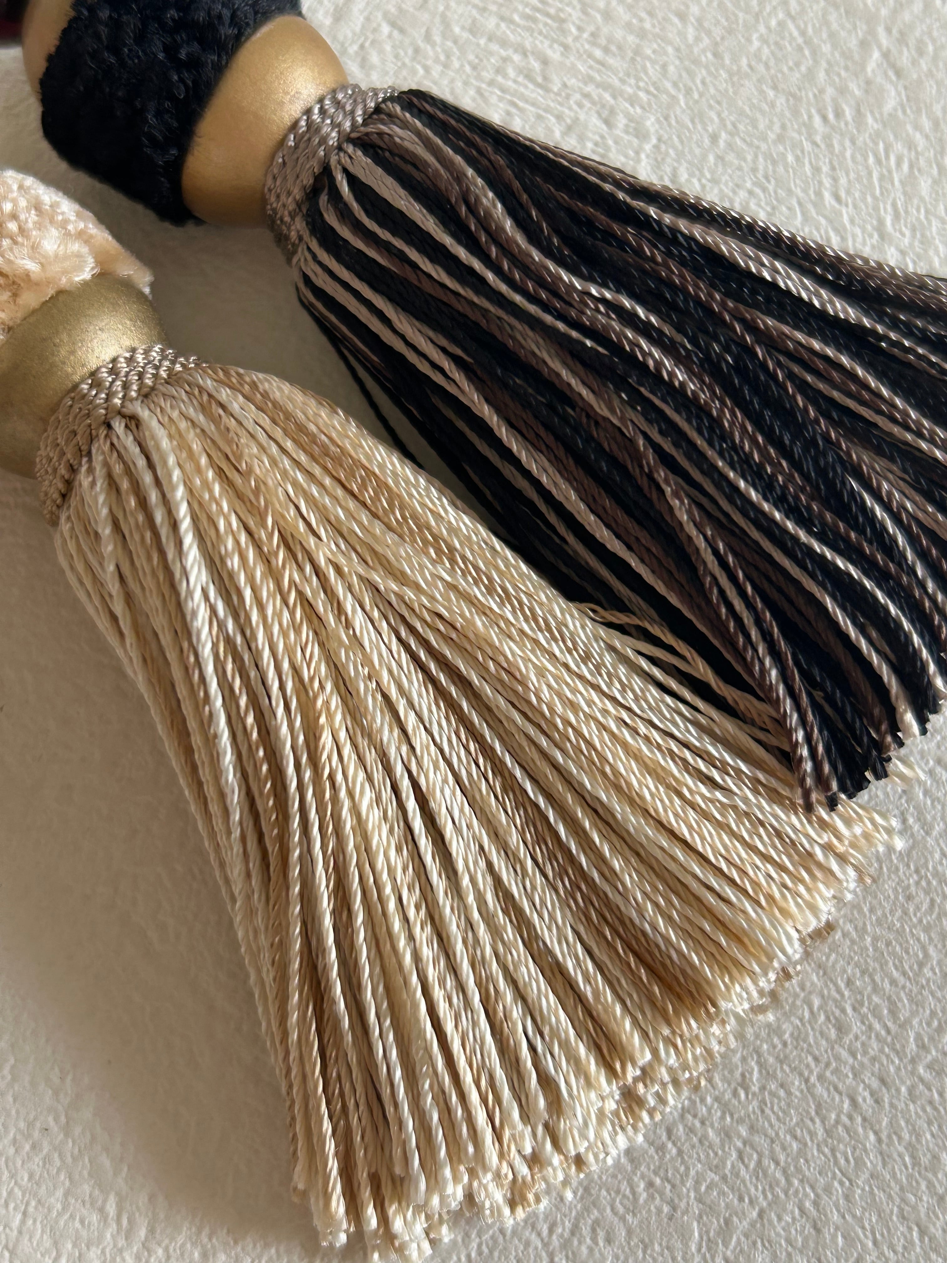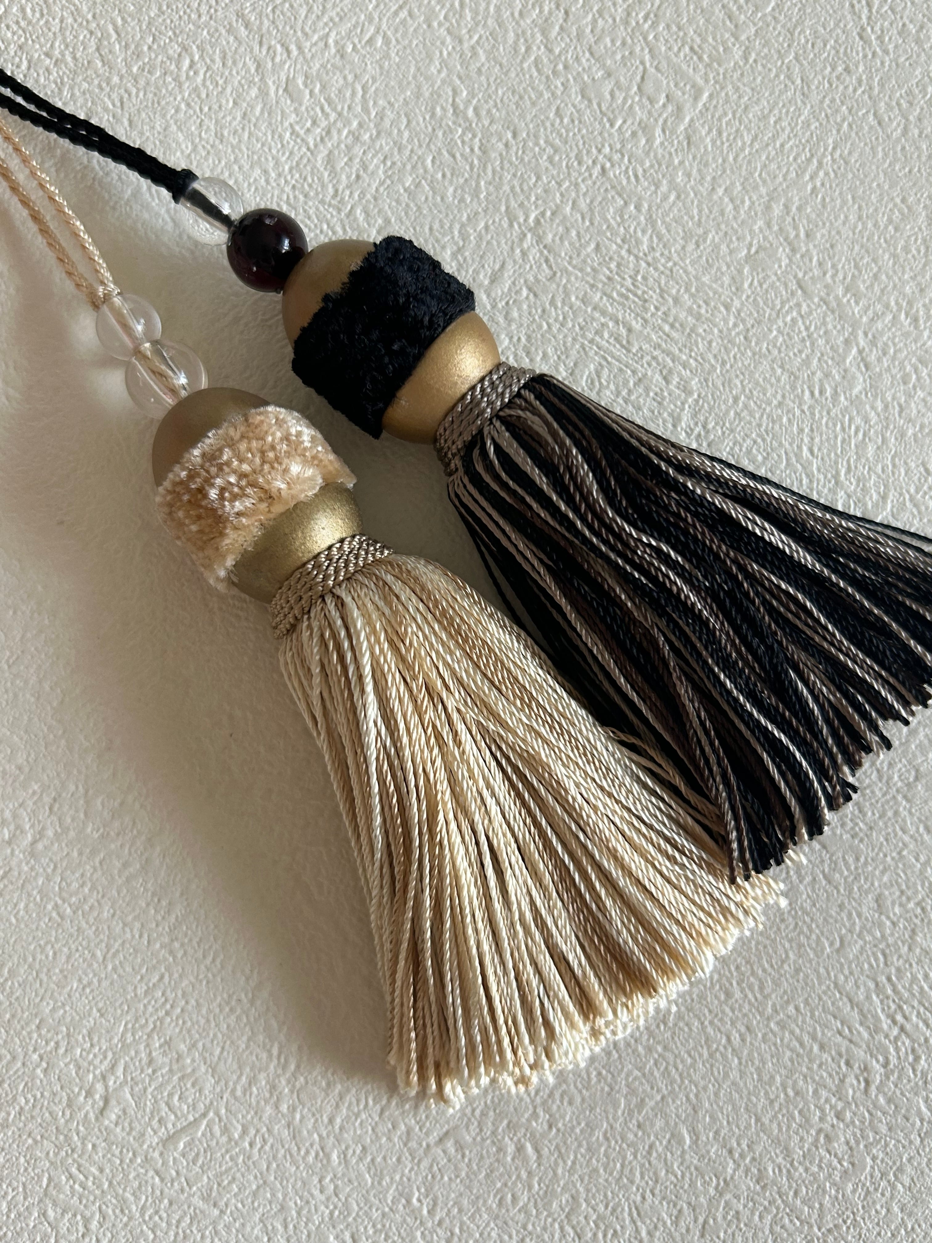 輸入デザインタッセル 10.5cm ブラックMIX/ベージュMIX カルトナージュ バッグチャーム お茶箱 インテリア