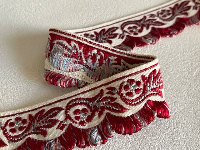 フランスVintage フリンジブレード レッド× エクリュ 50cm/カット 幅38mm カルトナージュ デコレーション材 ヴィンテージトリム