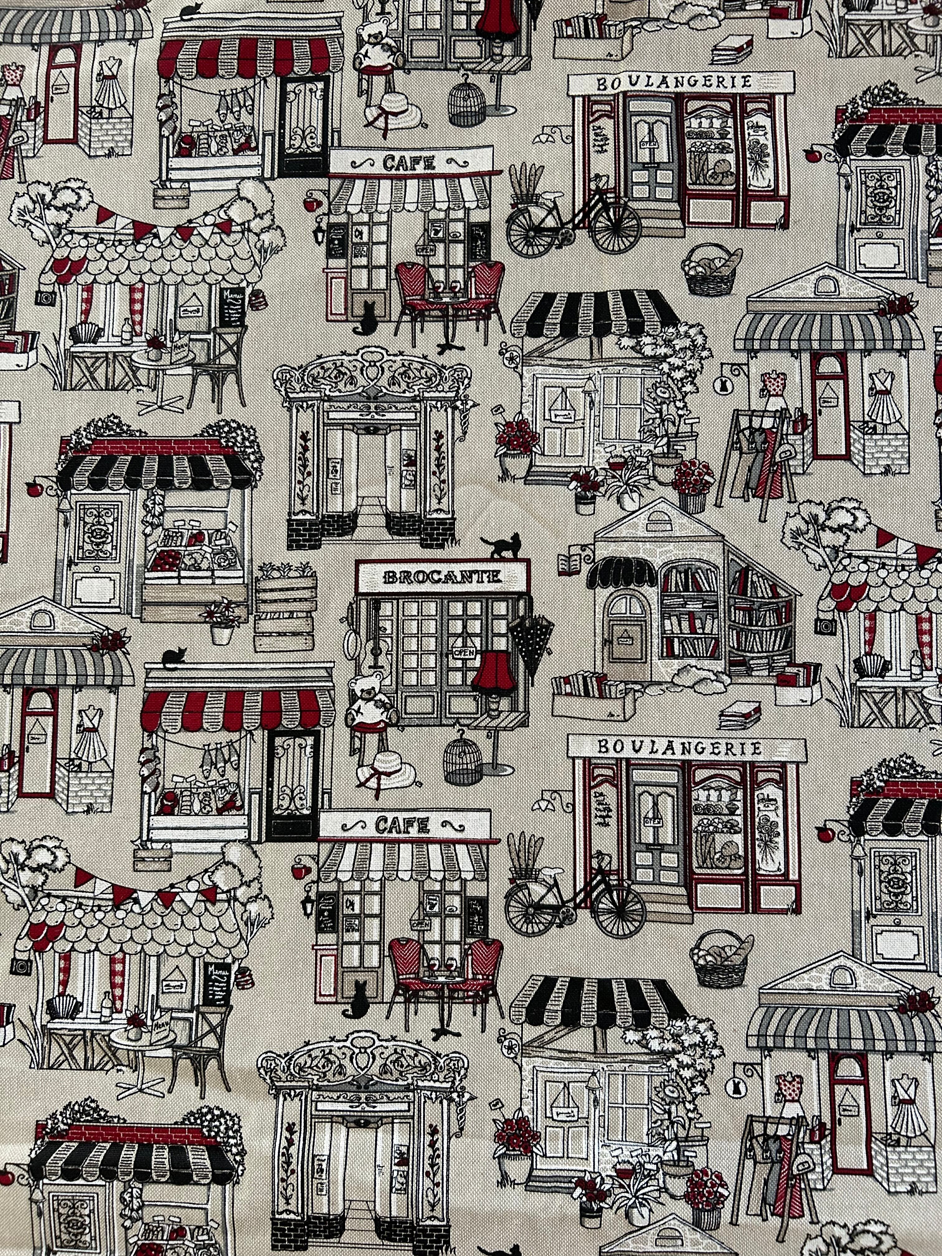一面にブーランジェリーやカフェ、ブロカントなどの可愛いフランスのお店のデザイン。