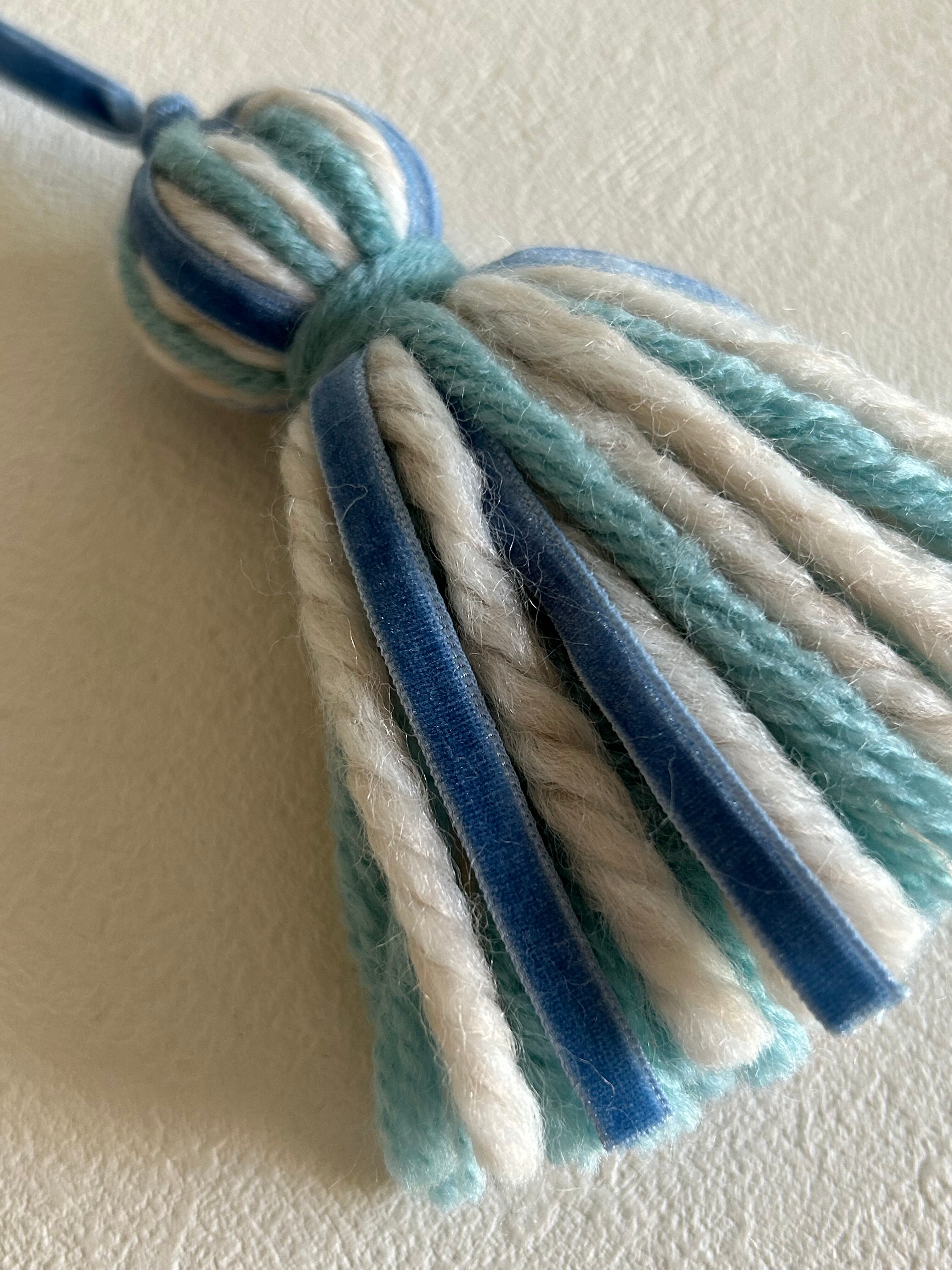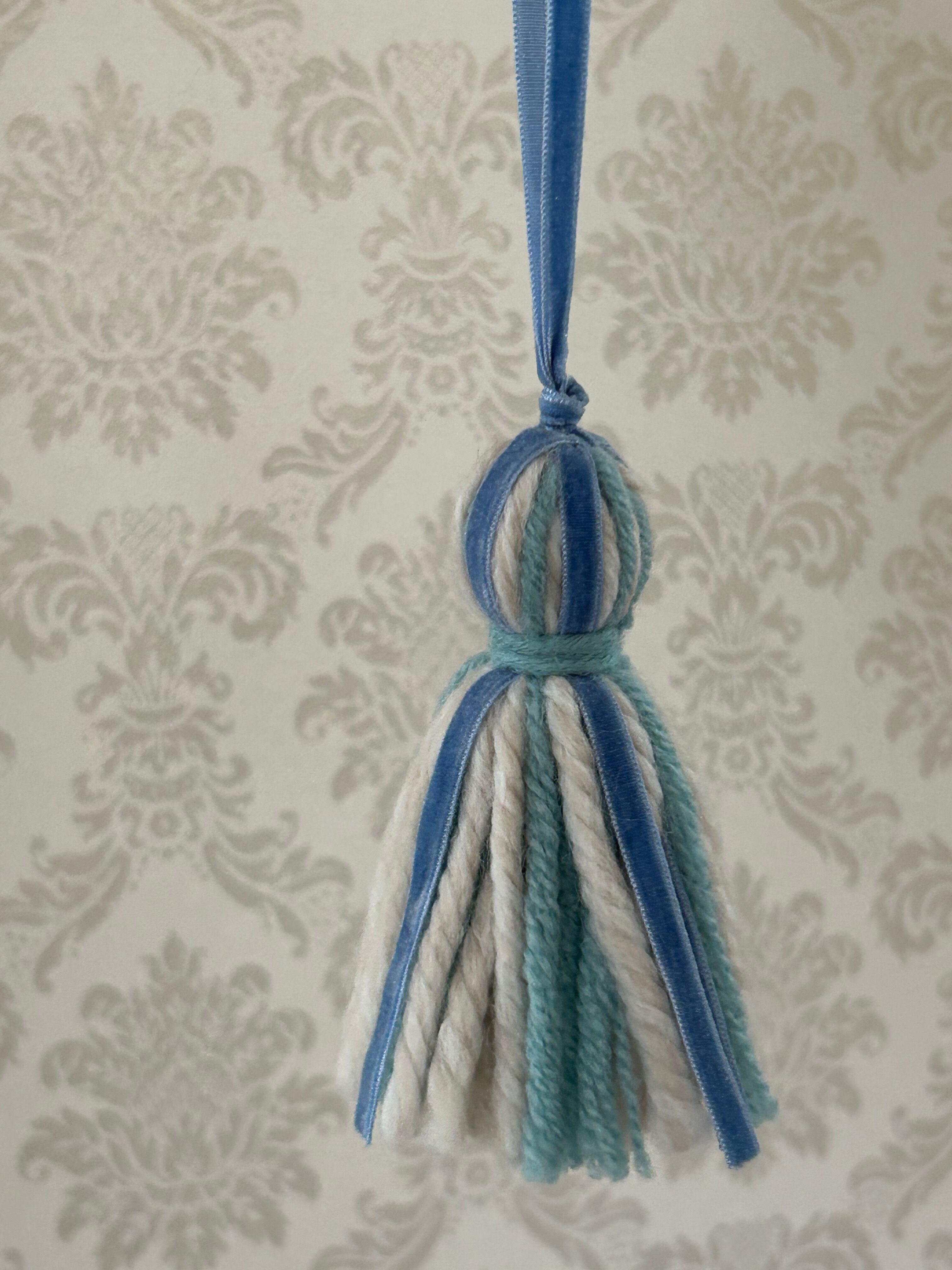 輸入デザインタッセル ブルー×アイボリー系 ウール×ヴェルベット10cm インテリアタッセル カルトナージュ スツール 茶箱