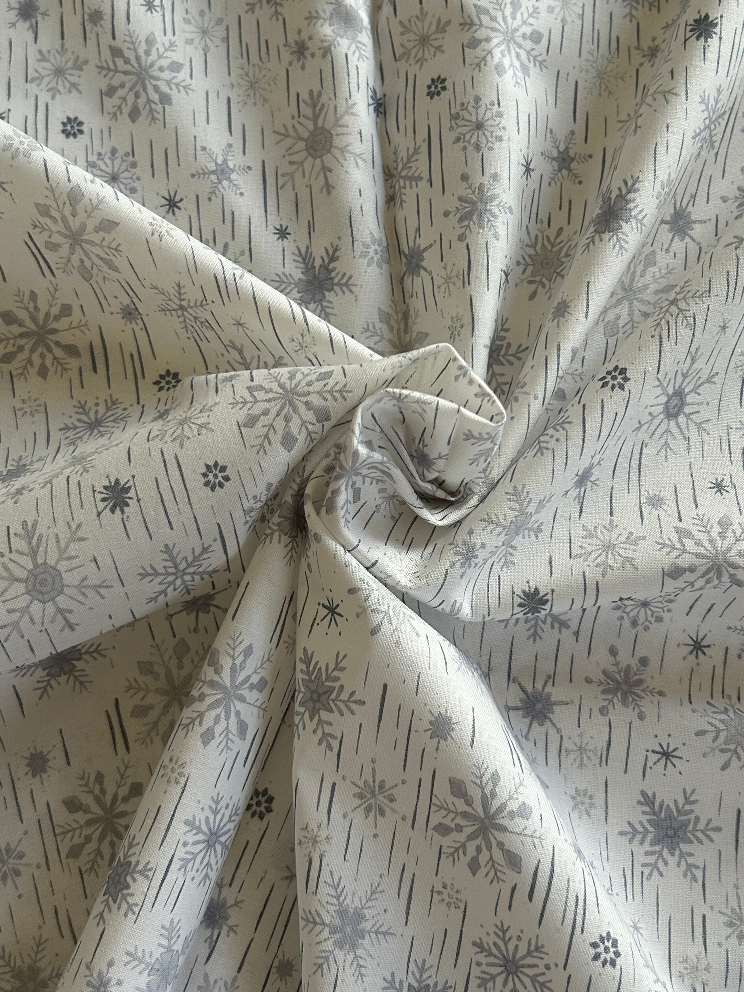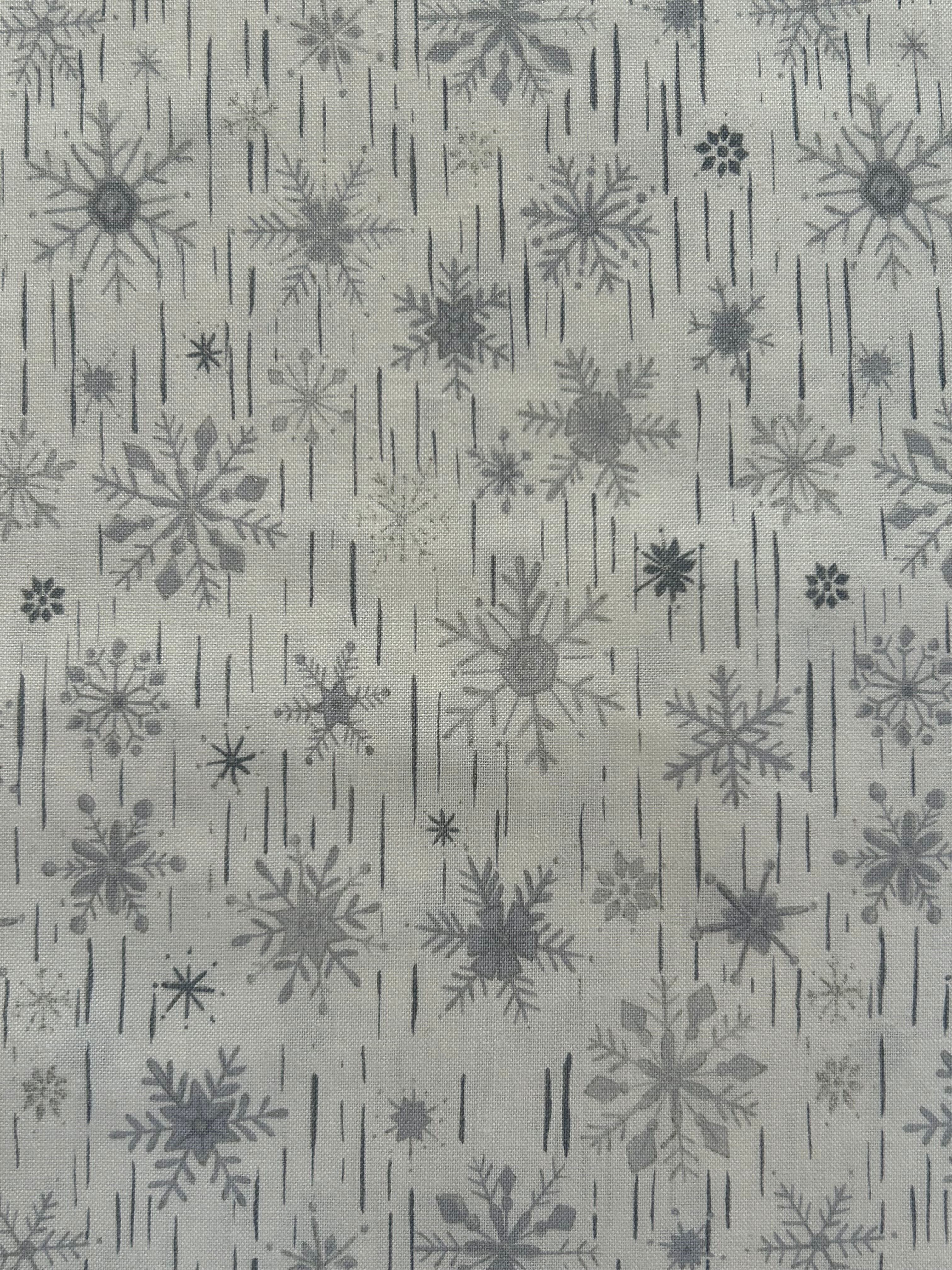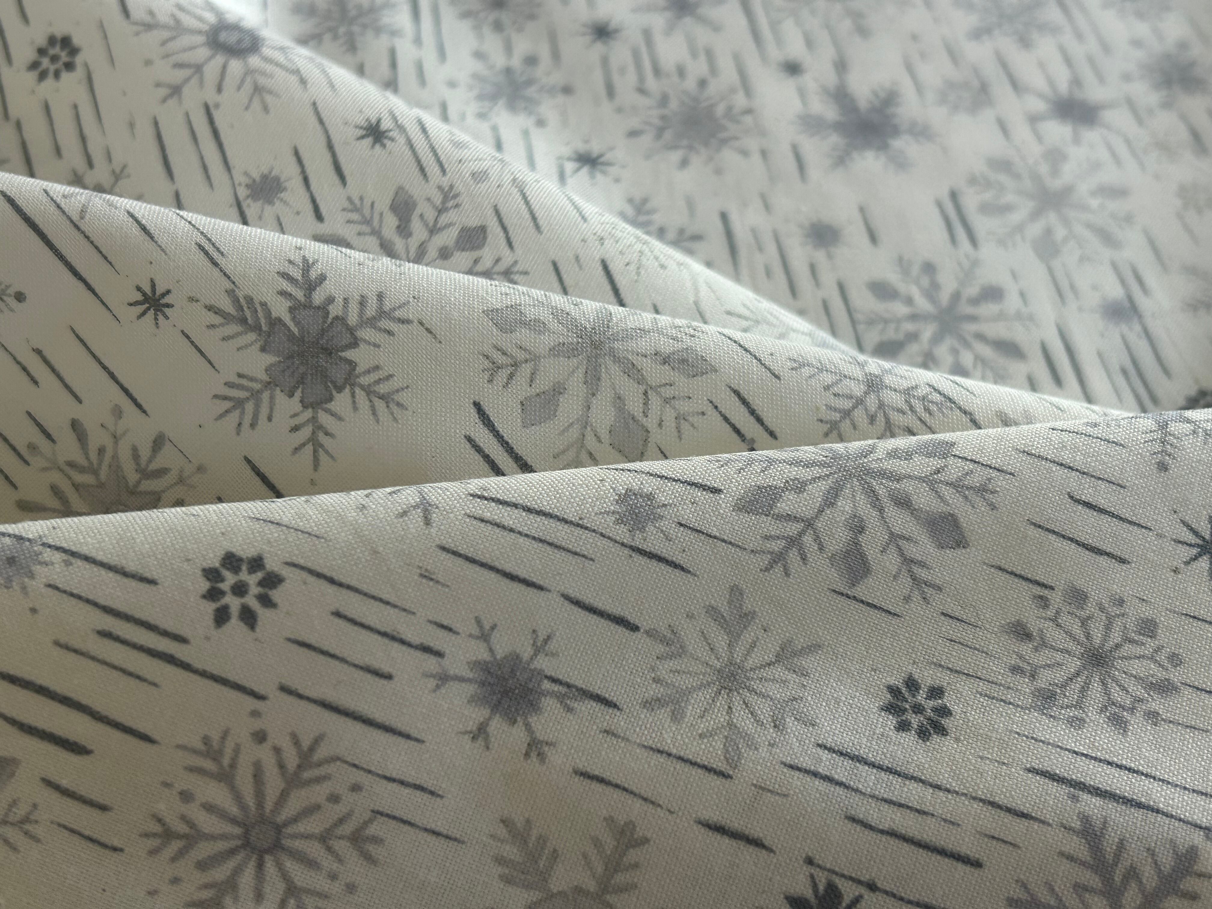 白地に一面シルバーグレーのスノーフレイクのデザインがプリントされています。