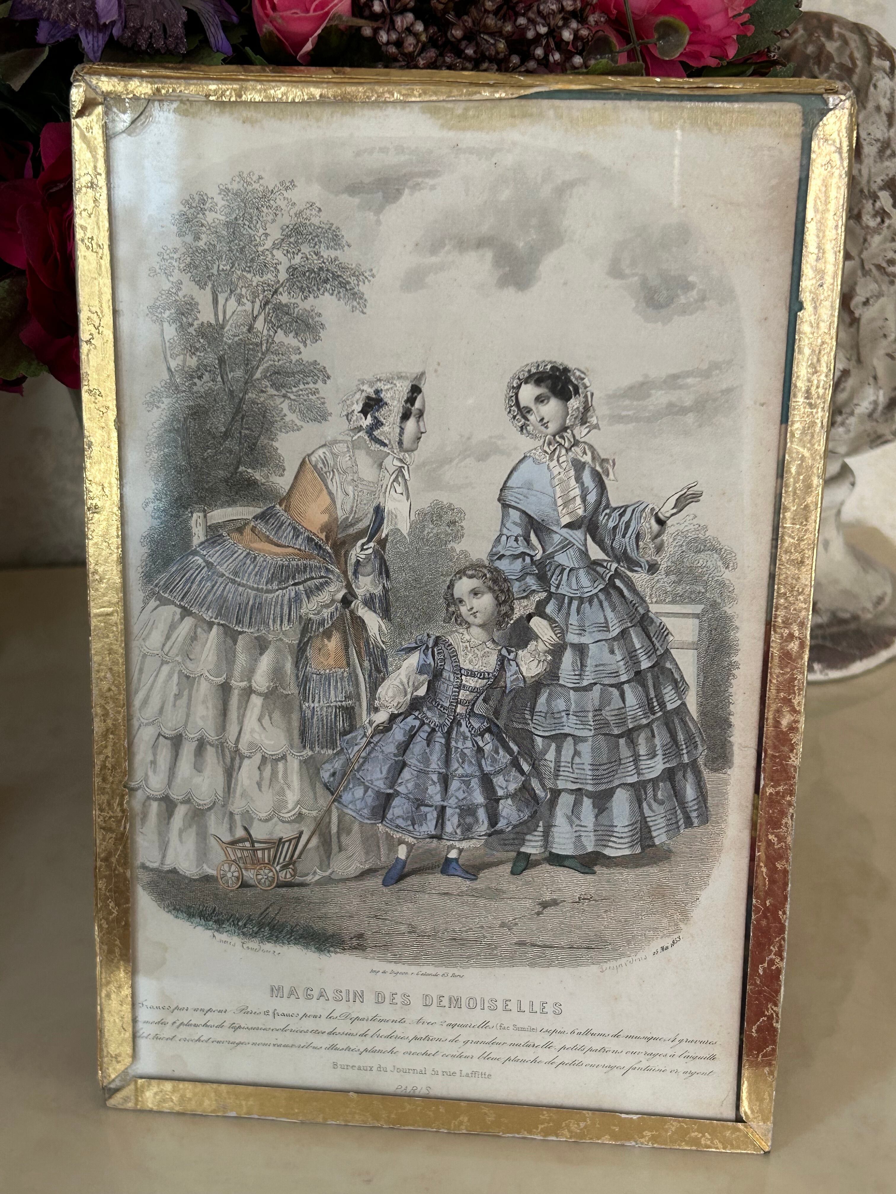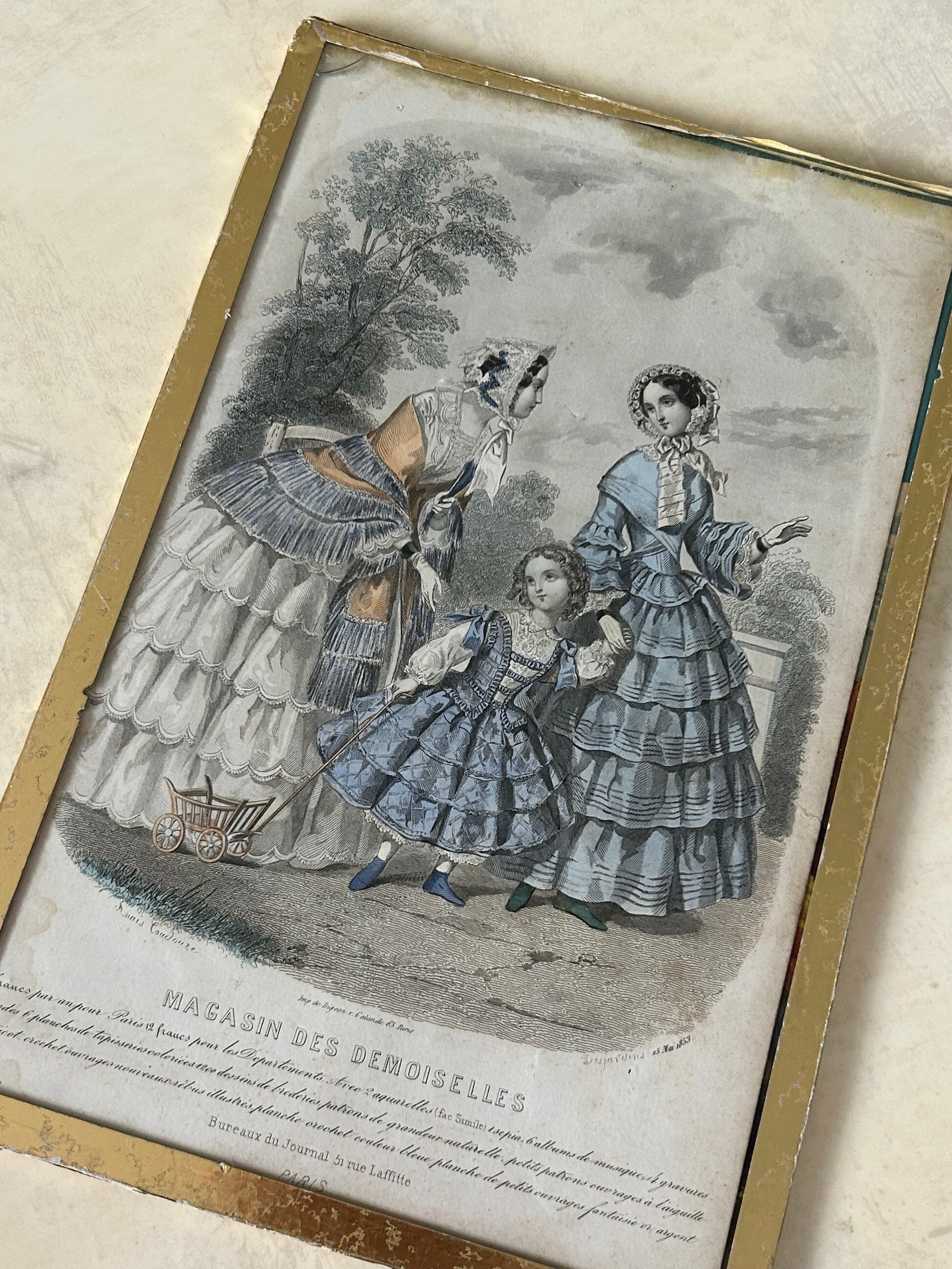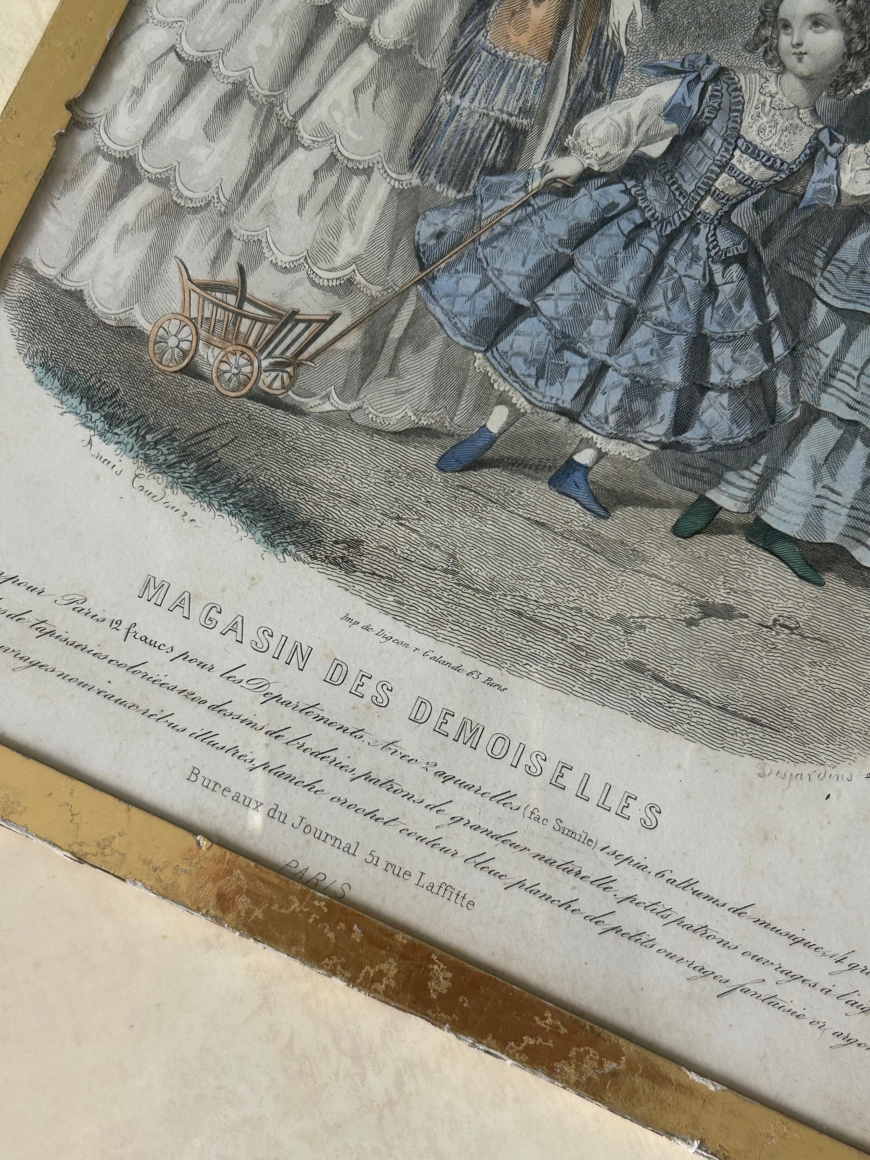 フランスアンティーク MAGASIN DES DEMOISELLES リトグラフ モード画 1853年 版画 ファッションプレート 額装 インテリア