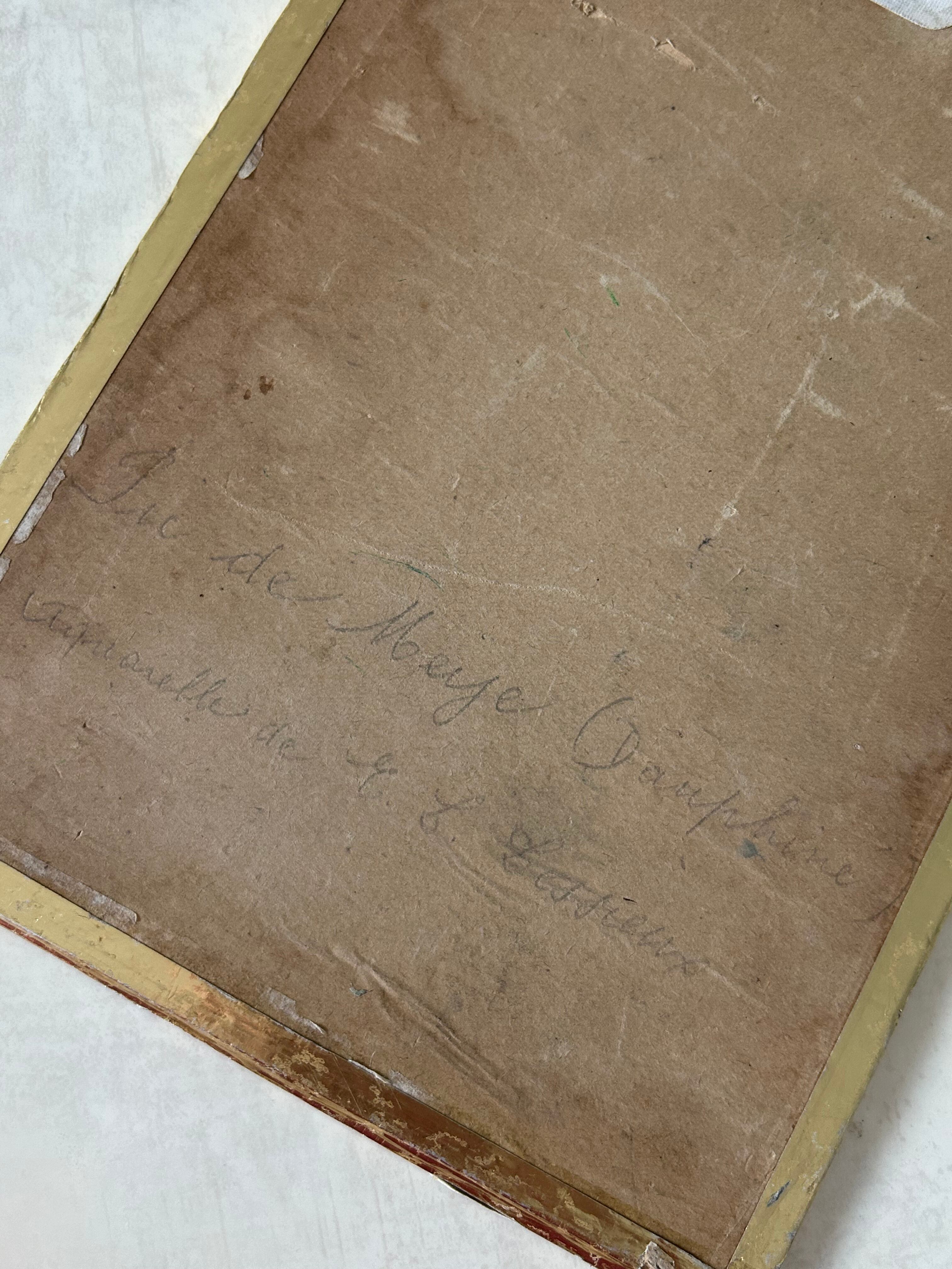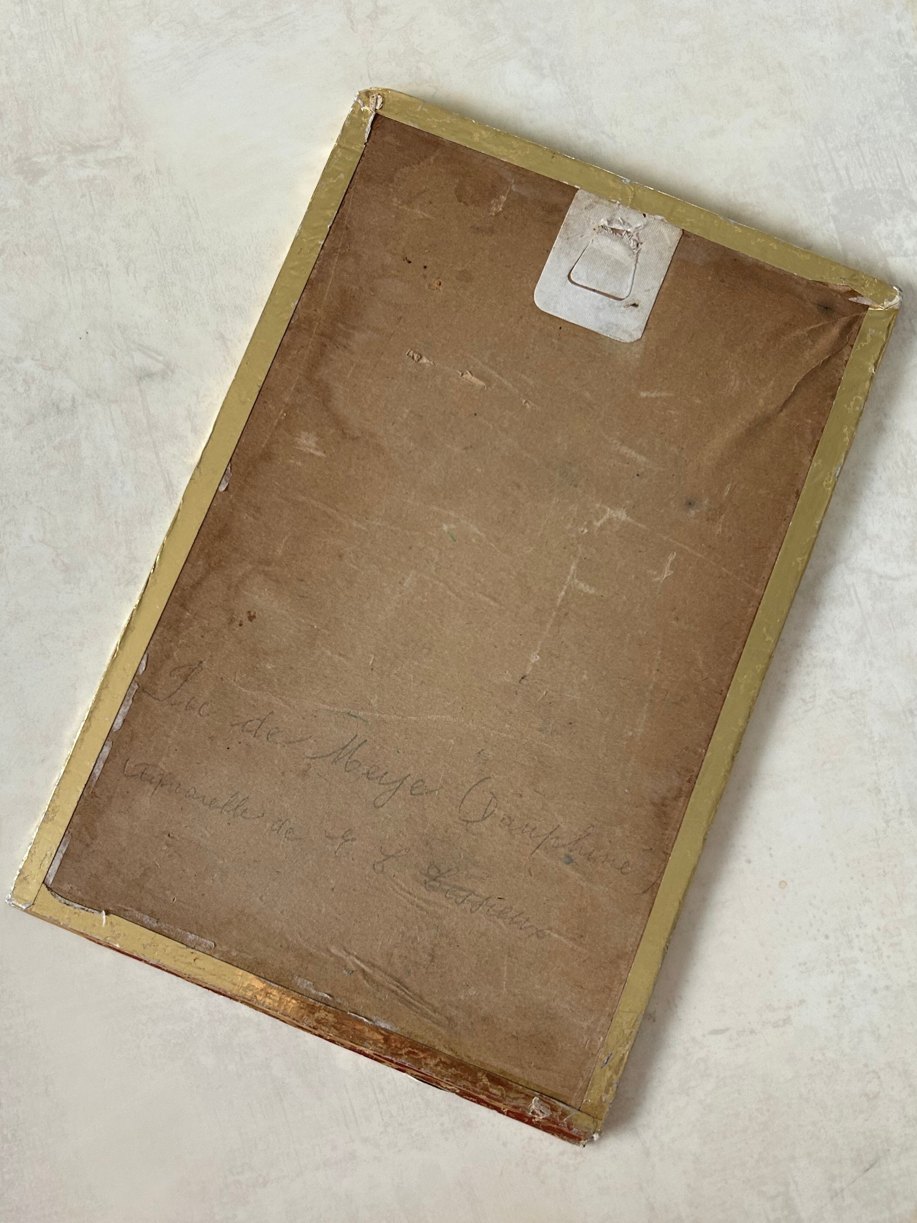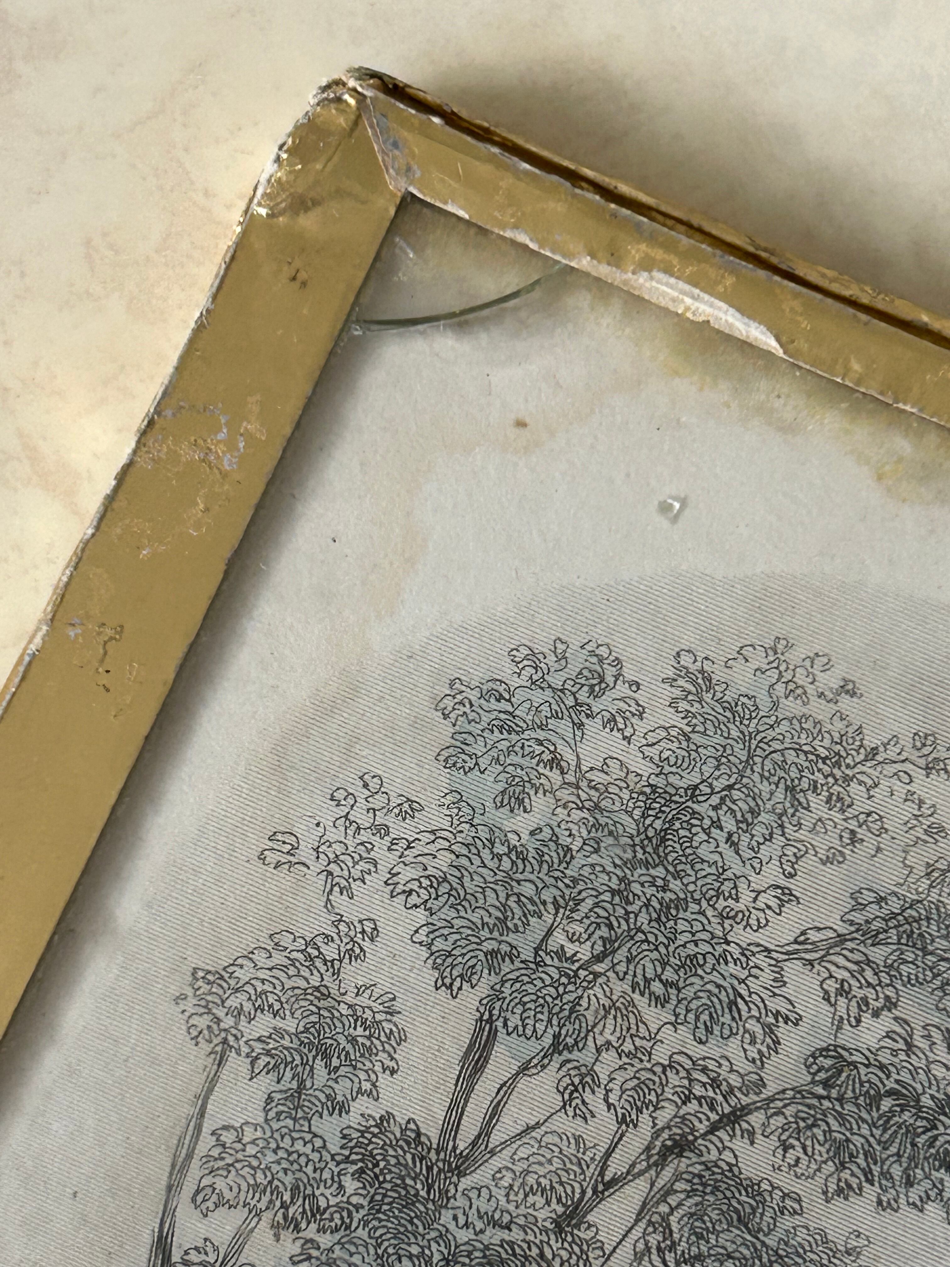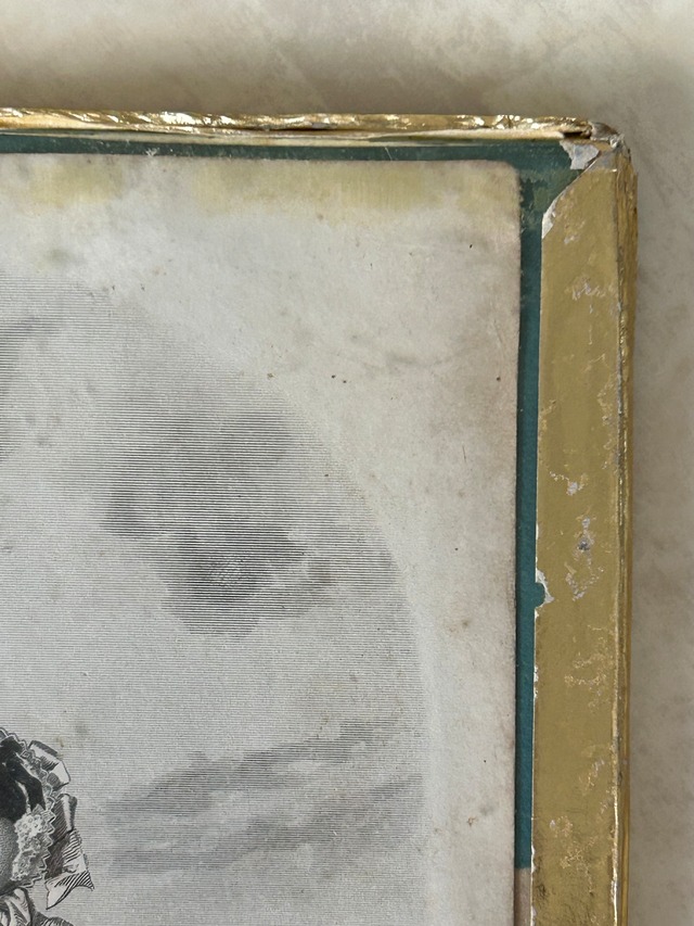 こちらはリトグラフのモード画がガラスと厚紙に挟んで縁周りをゴールドカラーのテープで留められています。