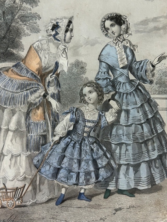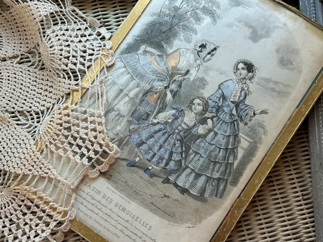 写真が普及していなかった頃に、上流階級の女性達はこの様なファッションプレートを見て、服飾商人に仕立てさせるオートクチュールの参考にしていたようです。