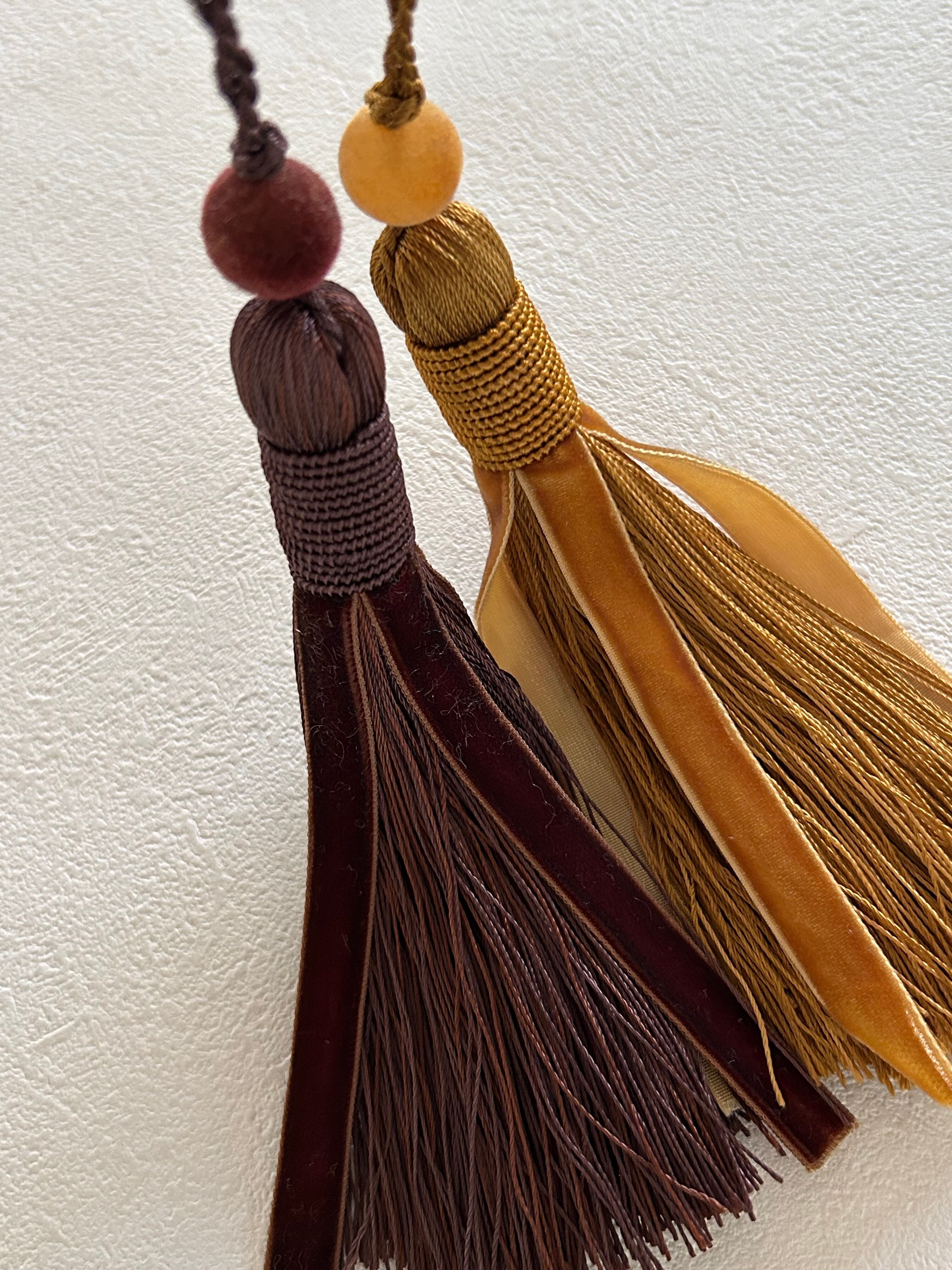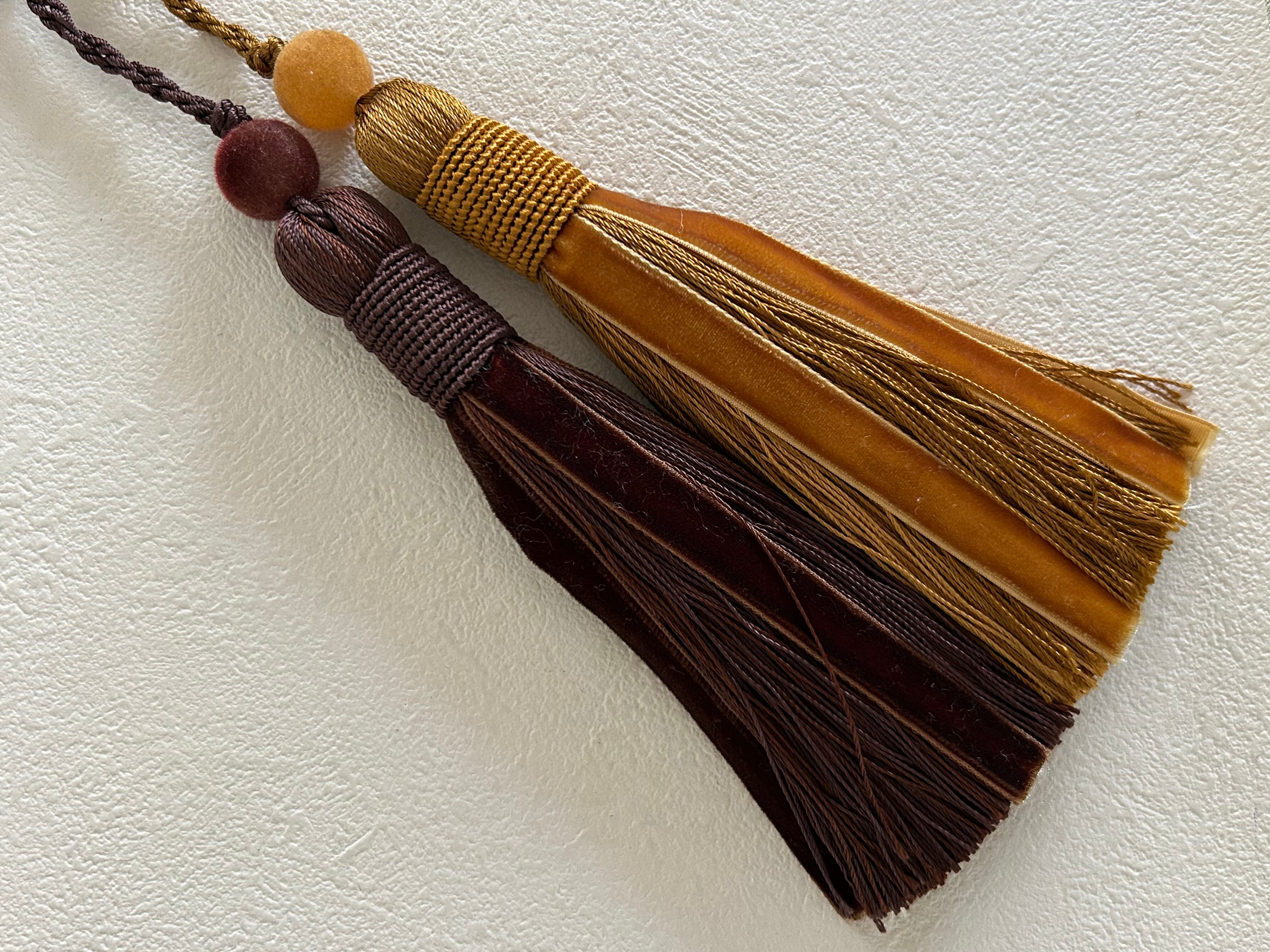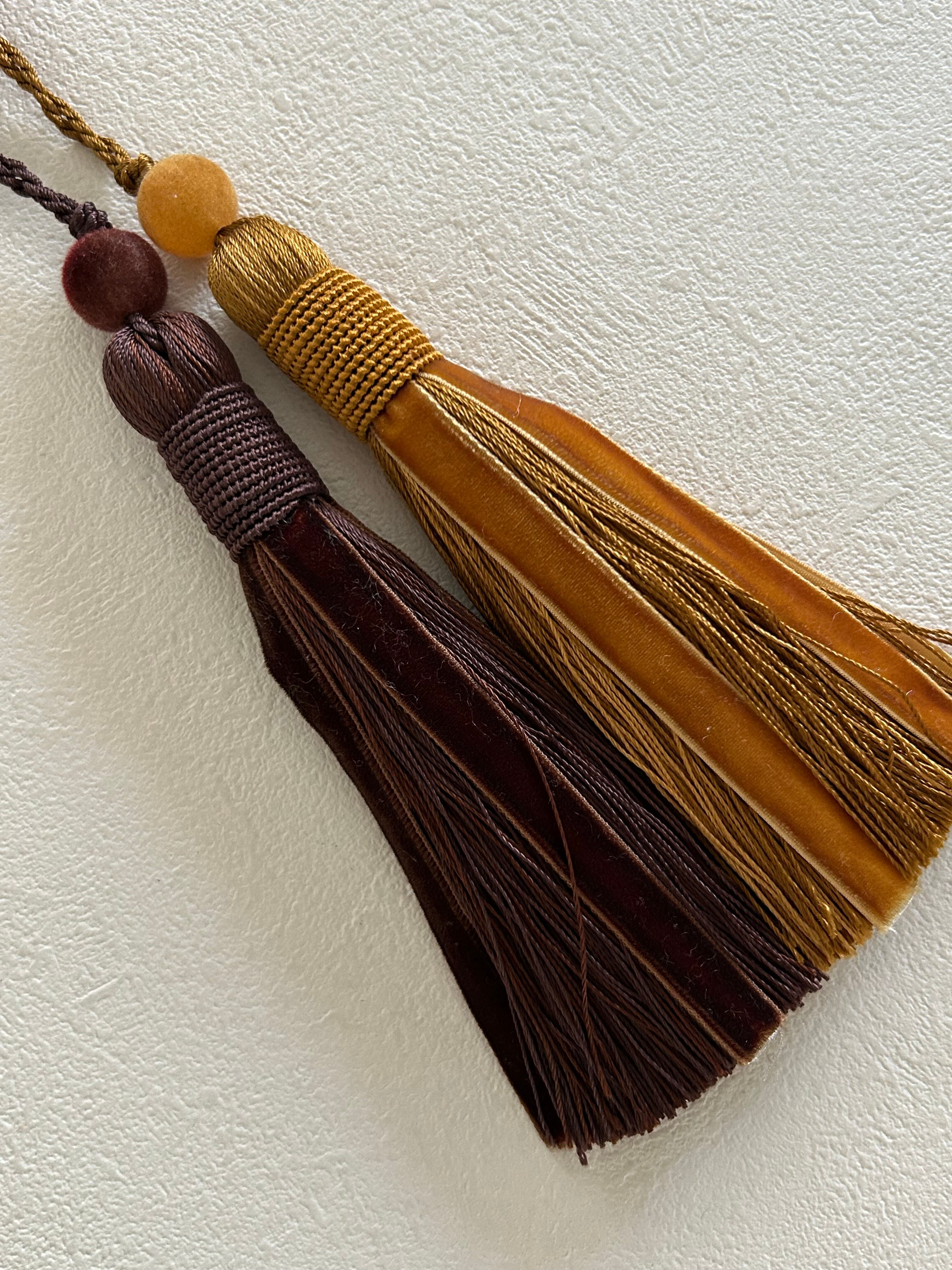 輸入デザインタッセル ベルベット ブラウン/イエローゴールド 15cm カルトナージュ チャーム インテリアタッセル 撮影小物