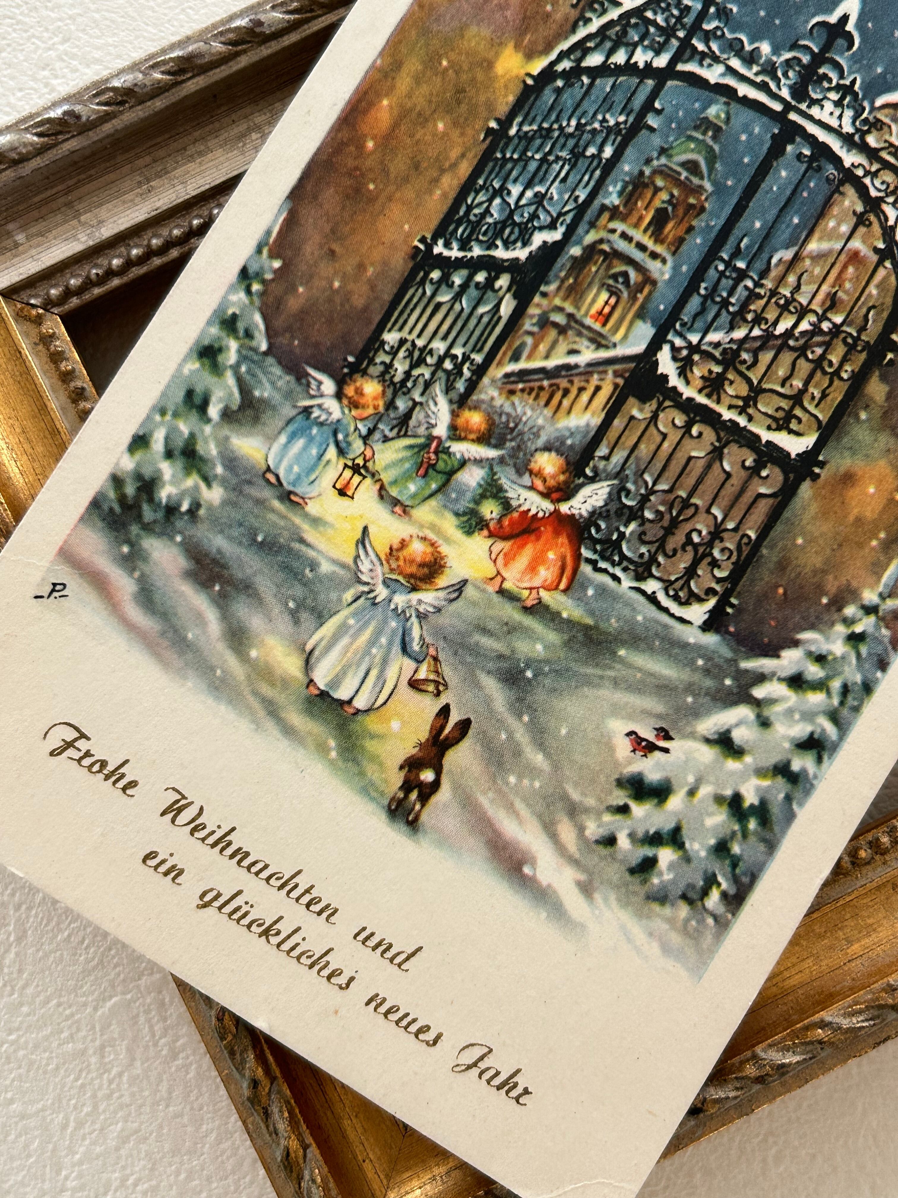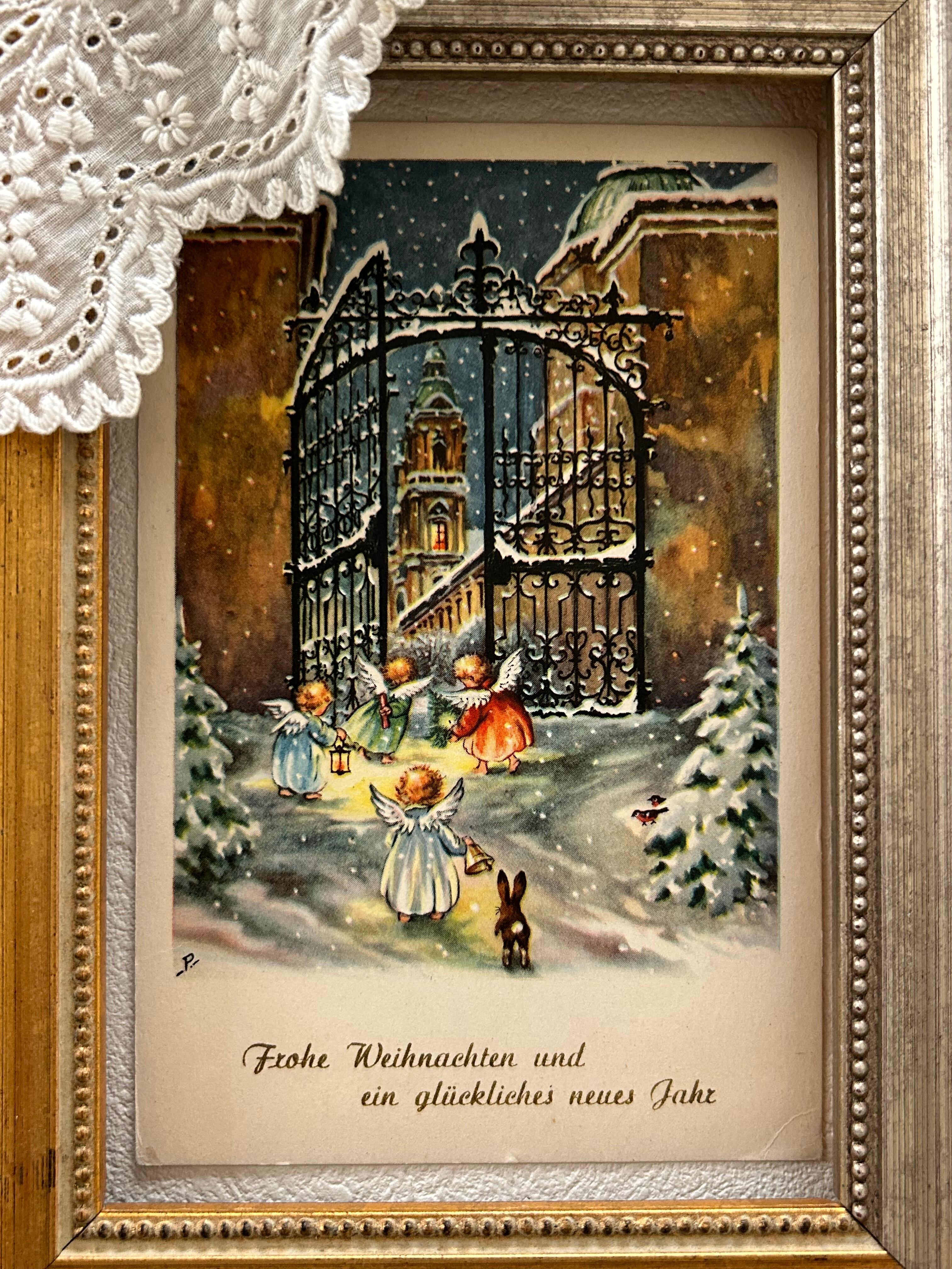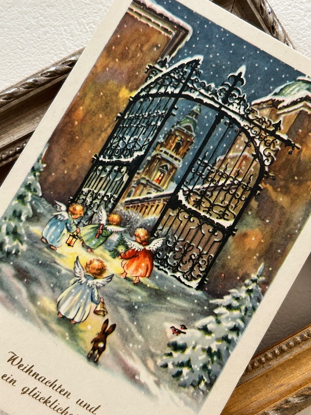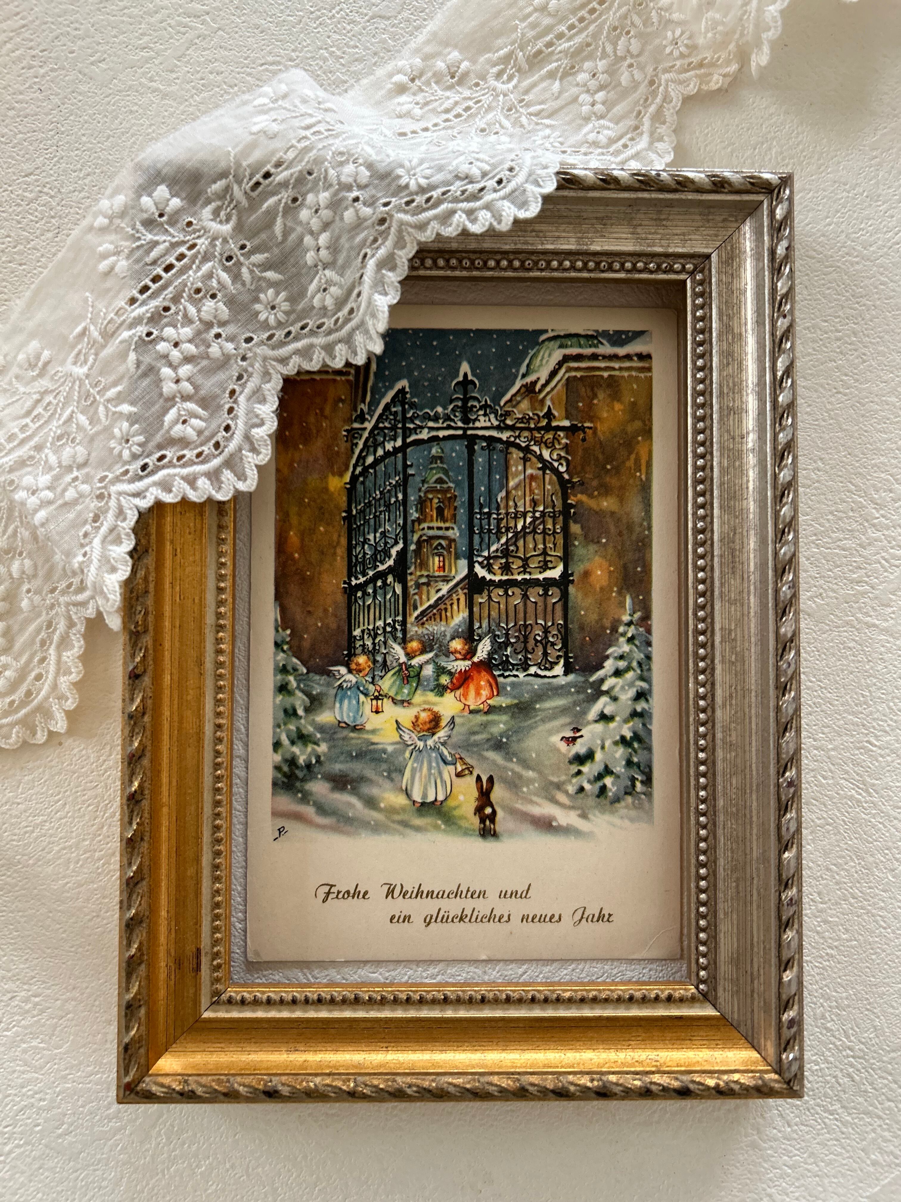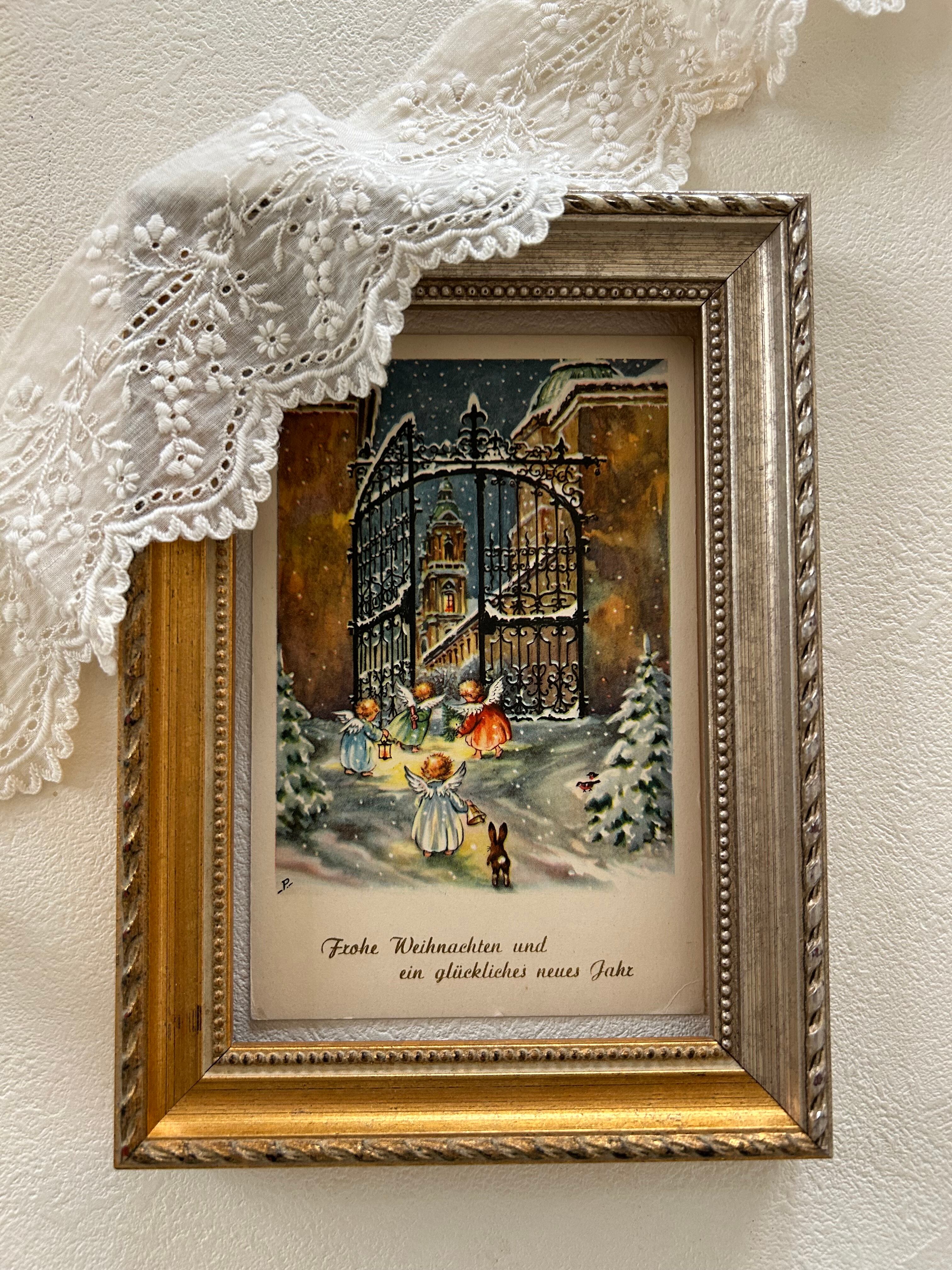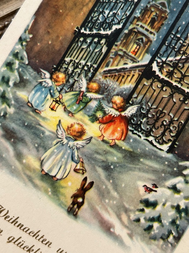 アンティークポストカード Noel クリスマス・新年 雪景色 天使 Ange ウサギ ドイツ語 フランス 額装 インテリア コレクション
