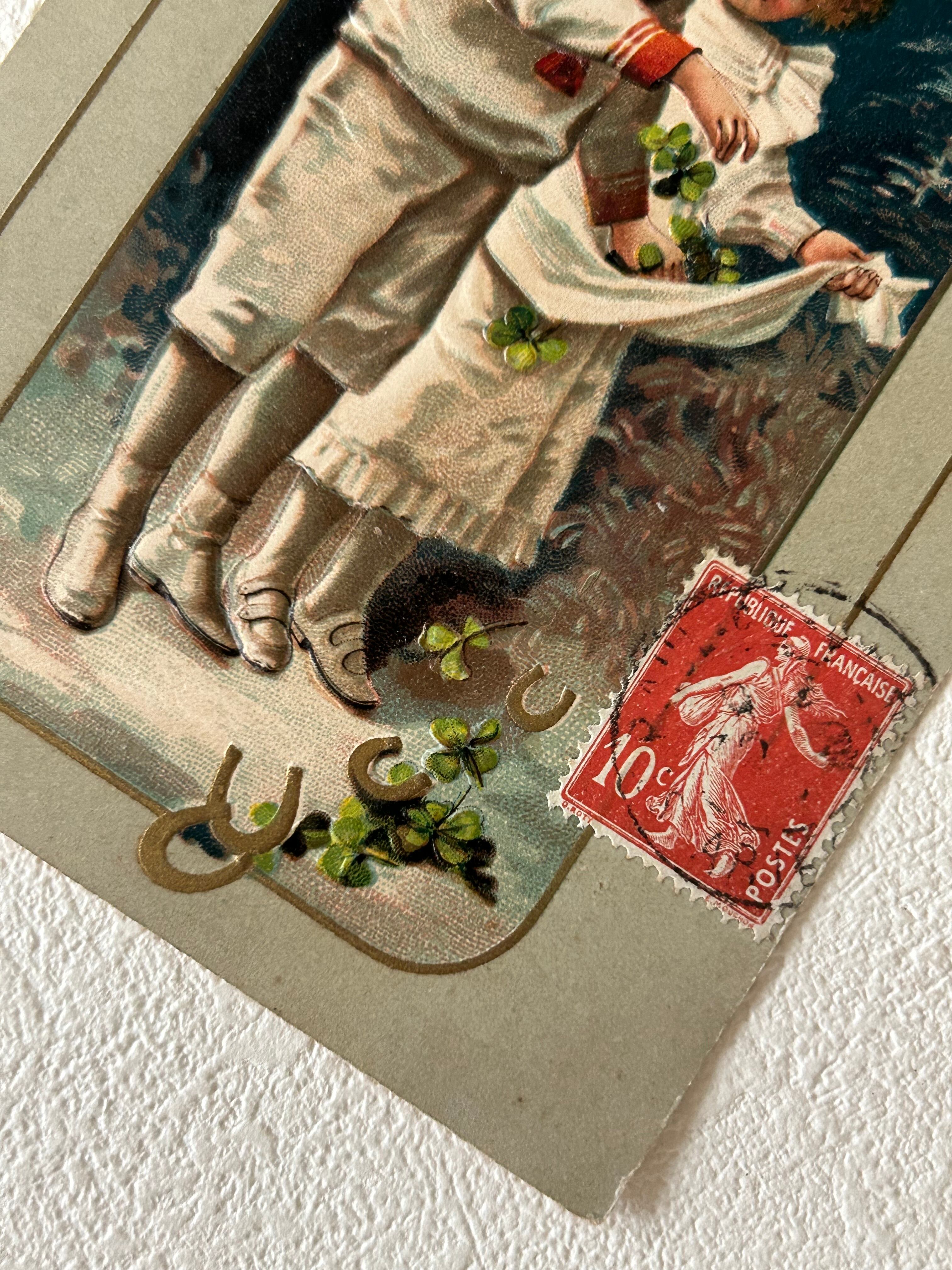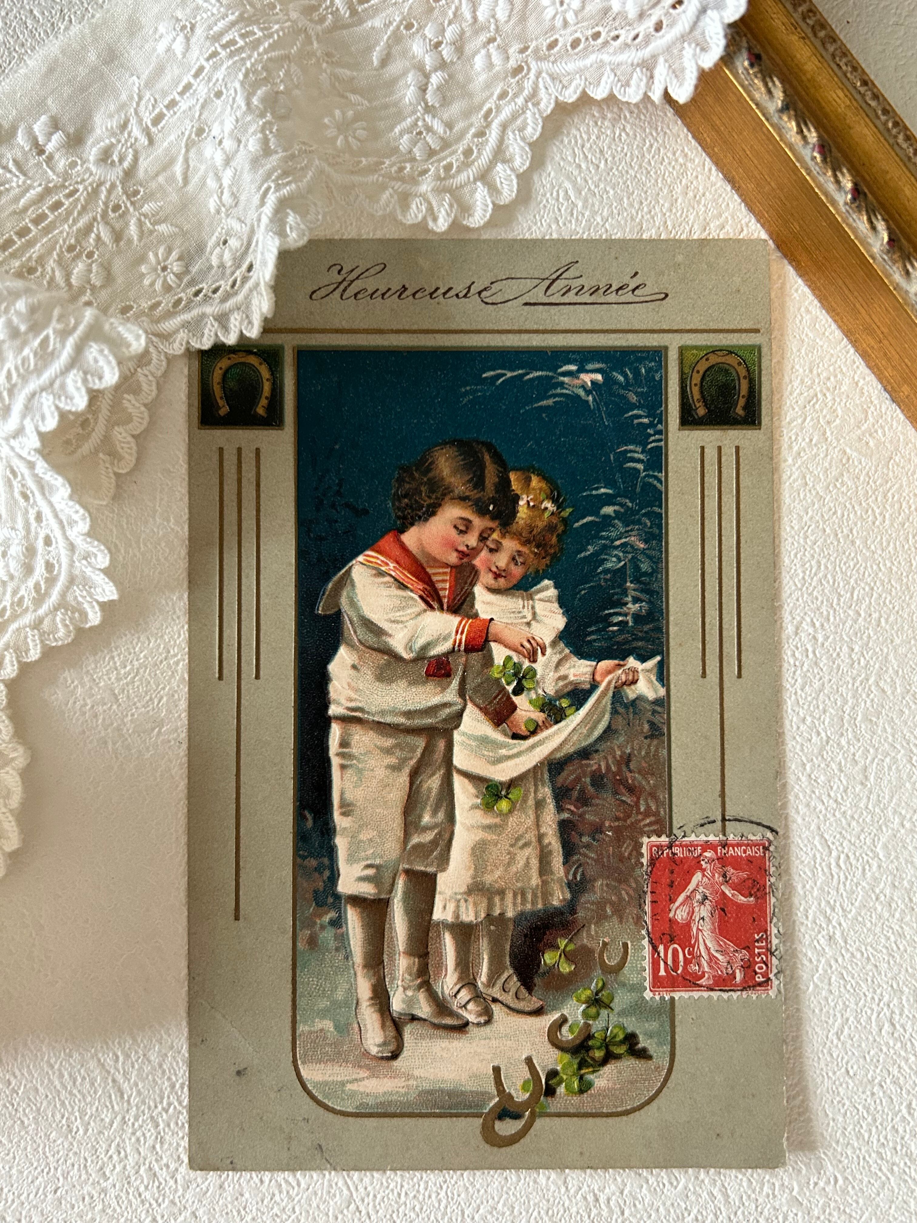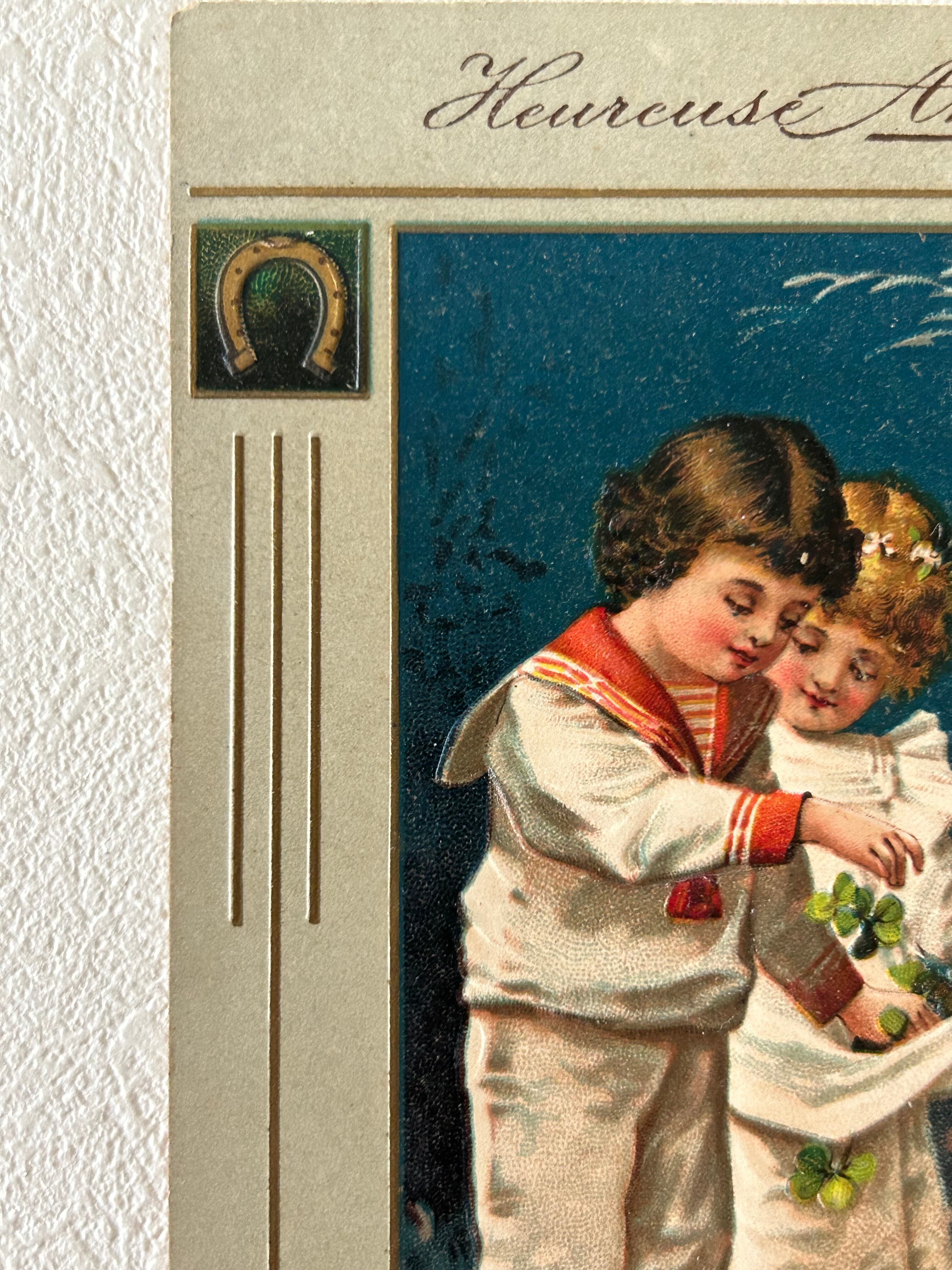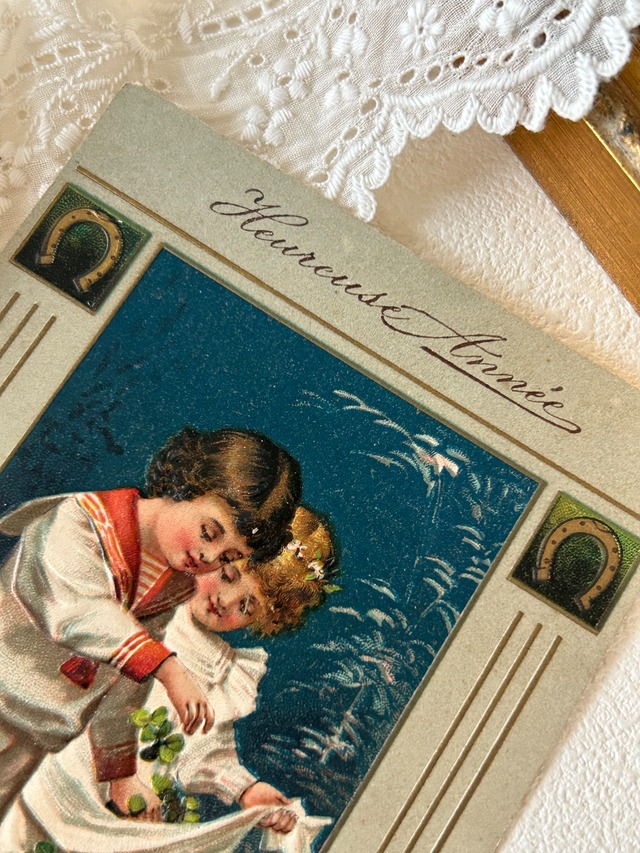 アンティークポストカード Heureuse Année ウール―ザネ ヴィクトリアン 馬蹄 四葉 子供 エンボス 額装 コレクション 新年 クリスマス