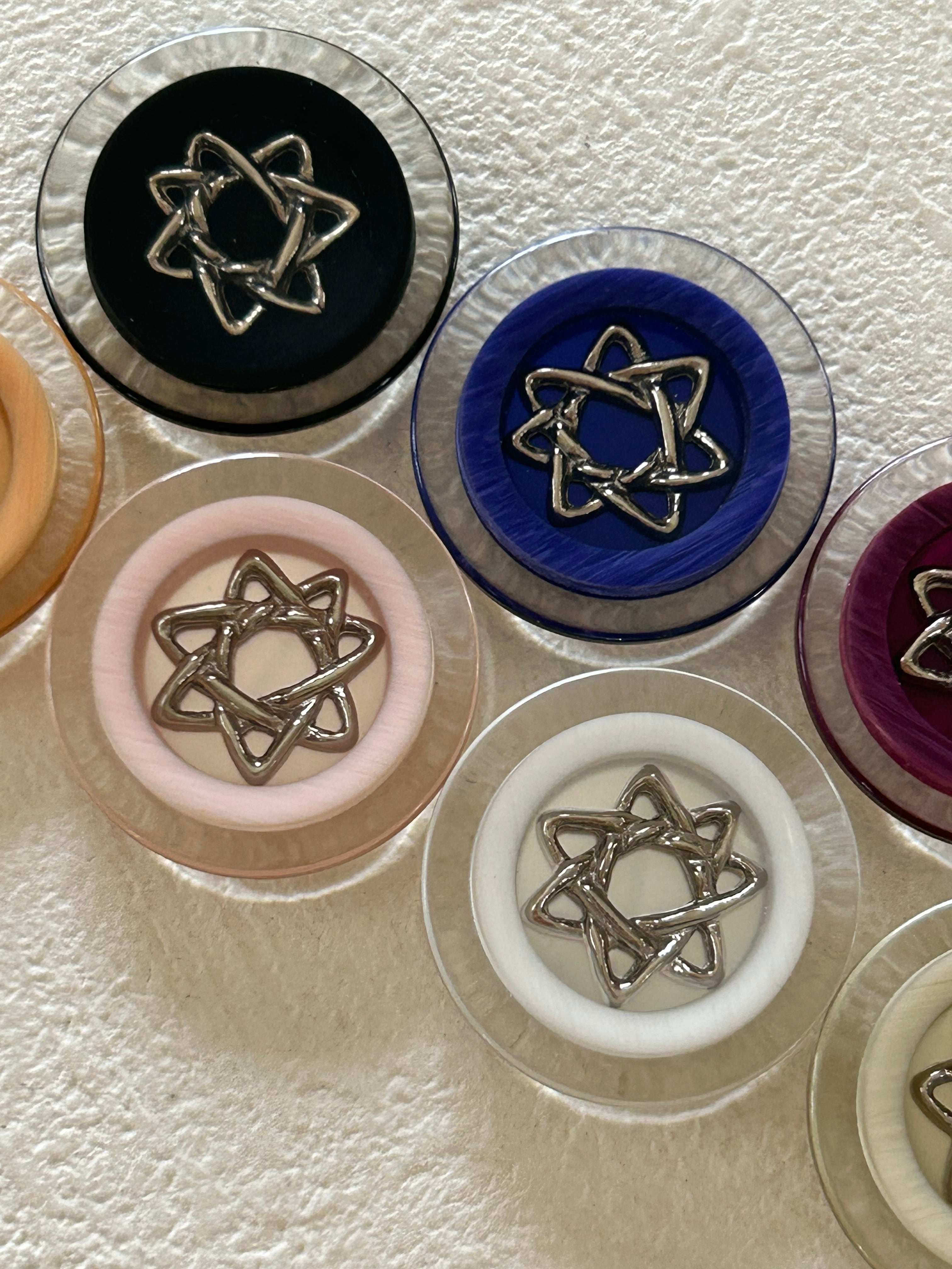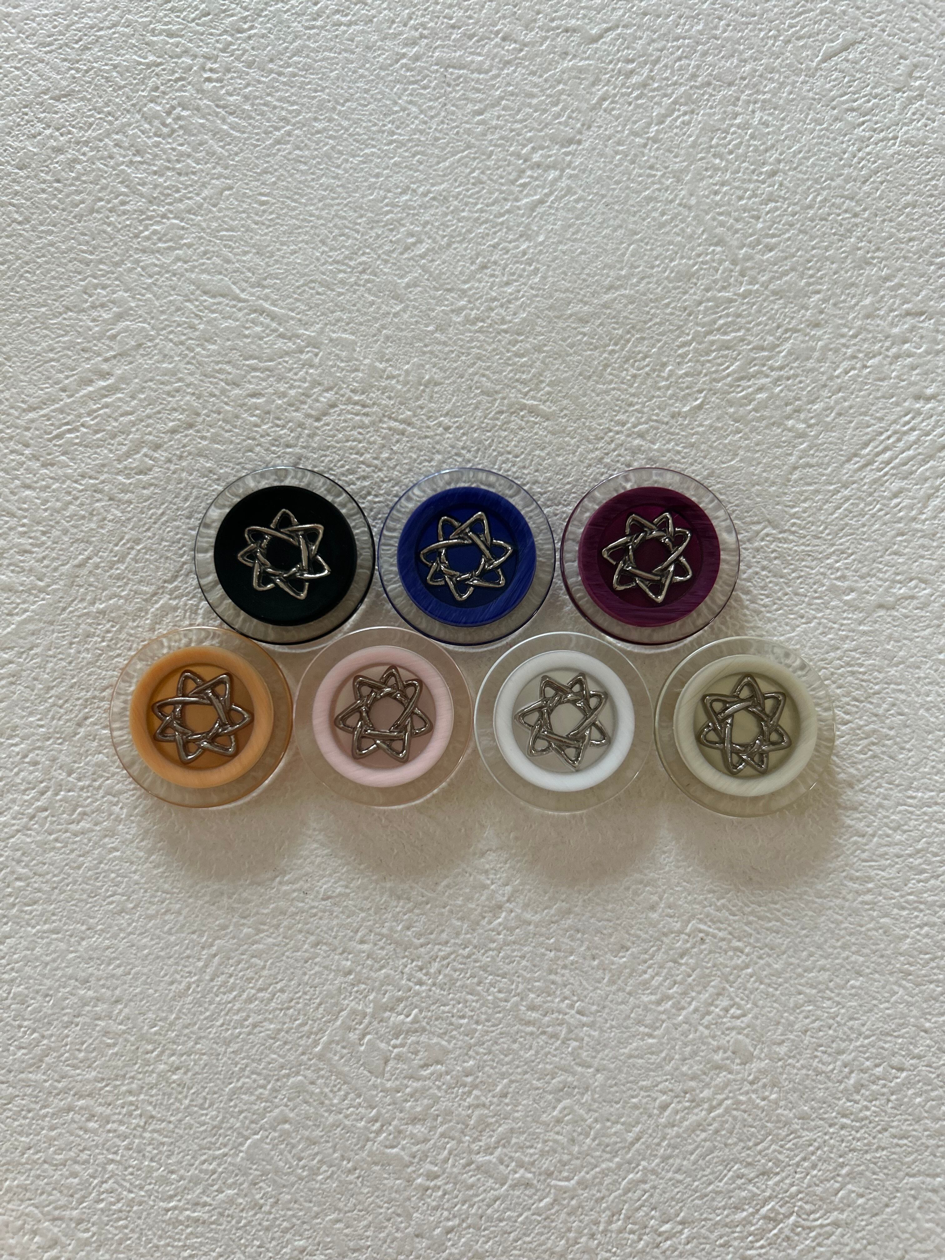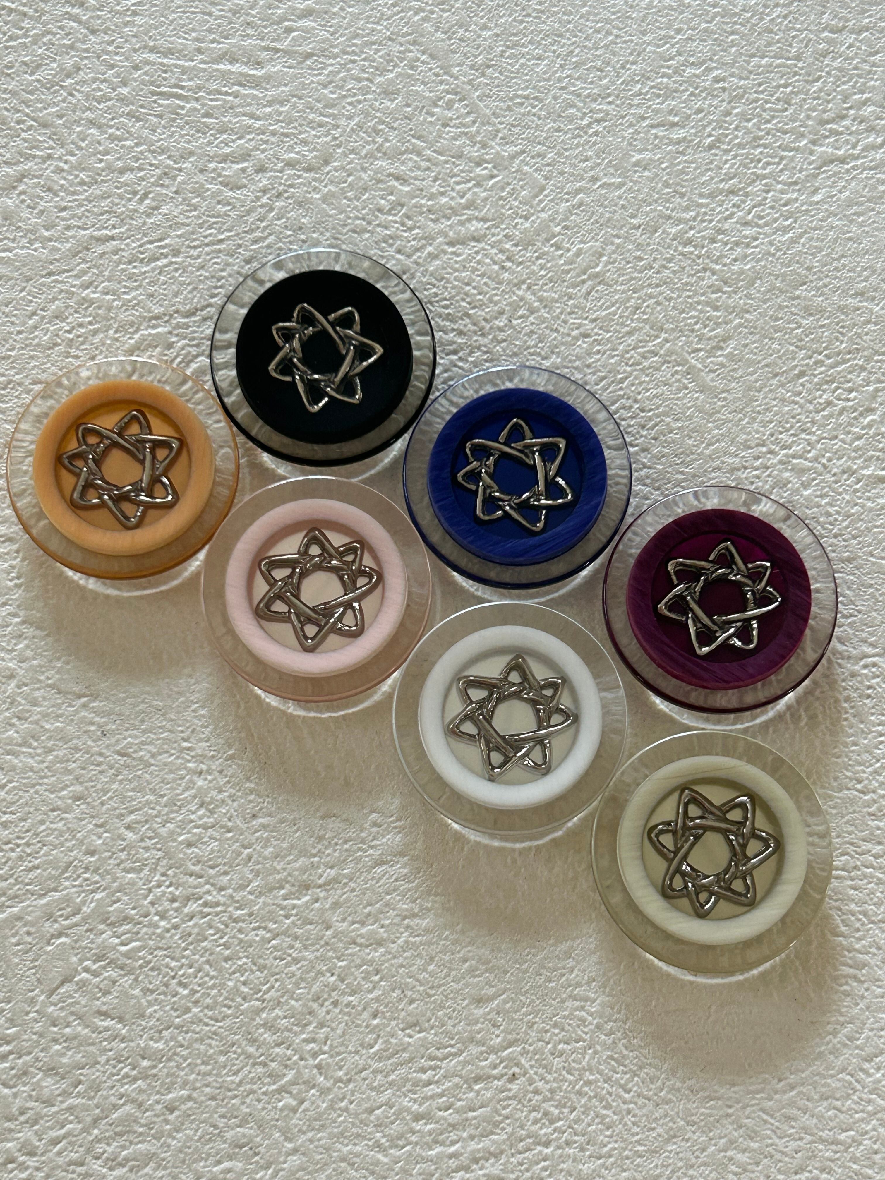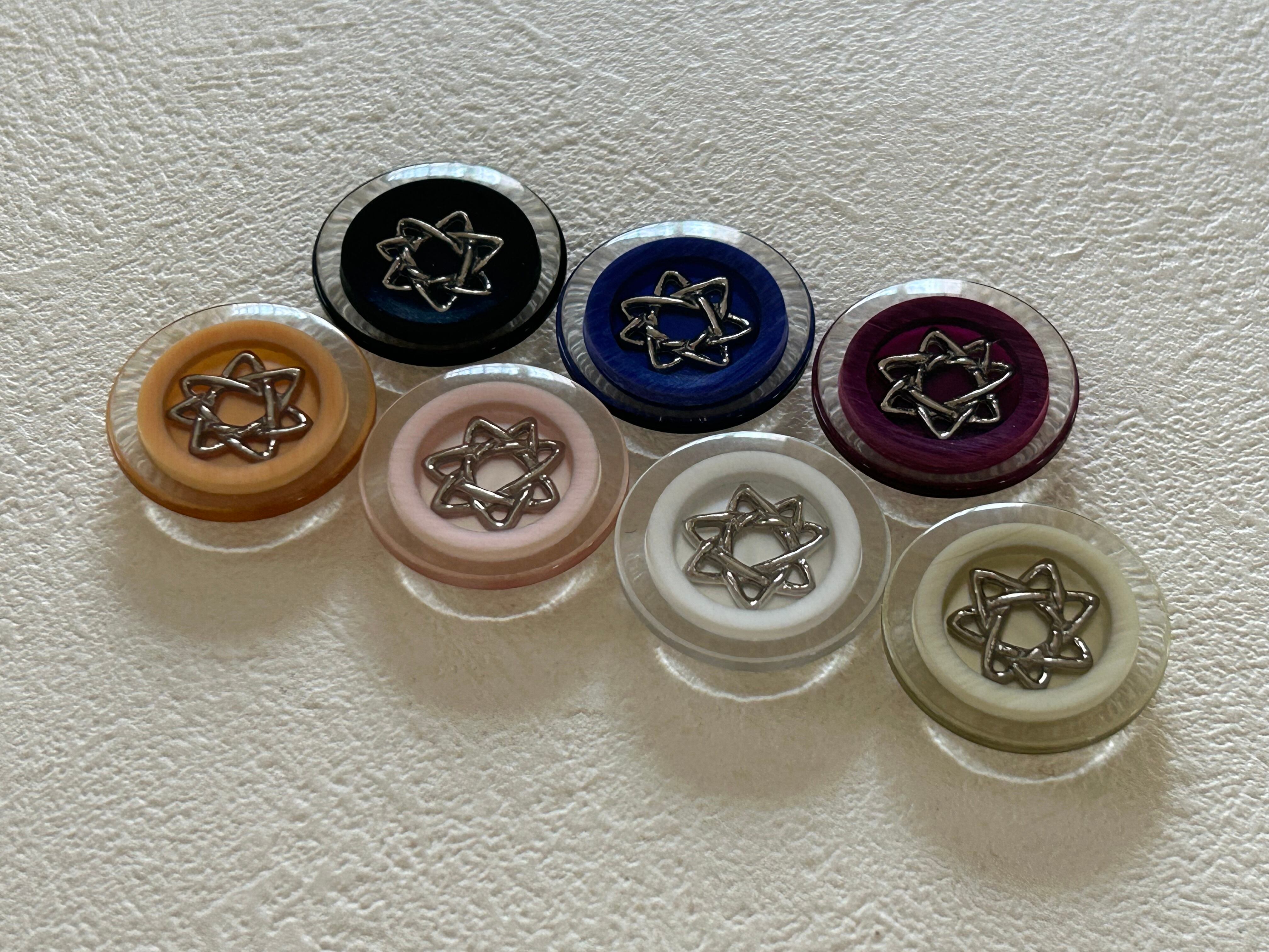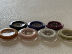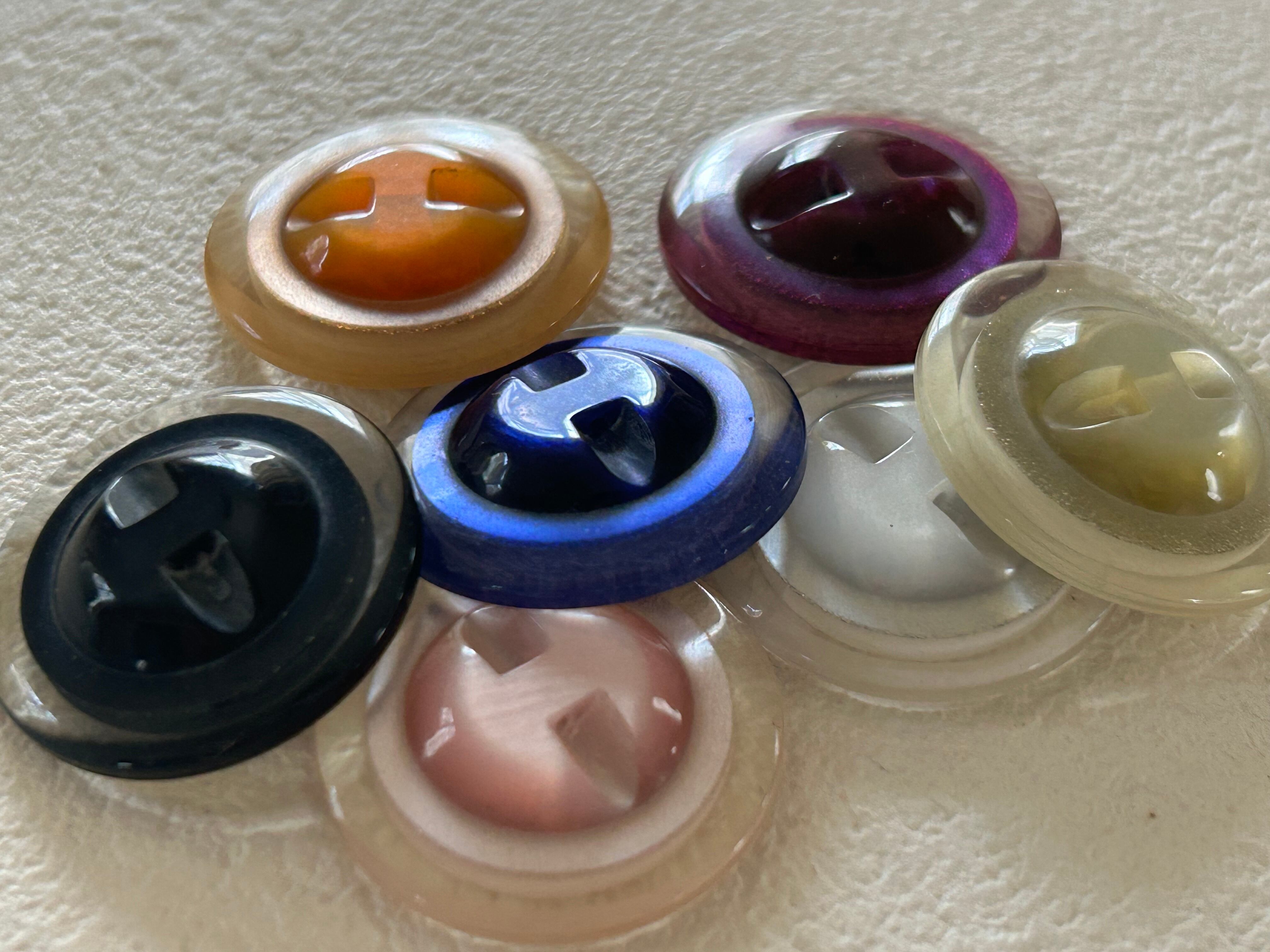 クリア×ホワイト/アイボリー/ブラック/ブルー/赤紫/オレンジベージュ/ピンク カラーのプラスチックボタンです。