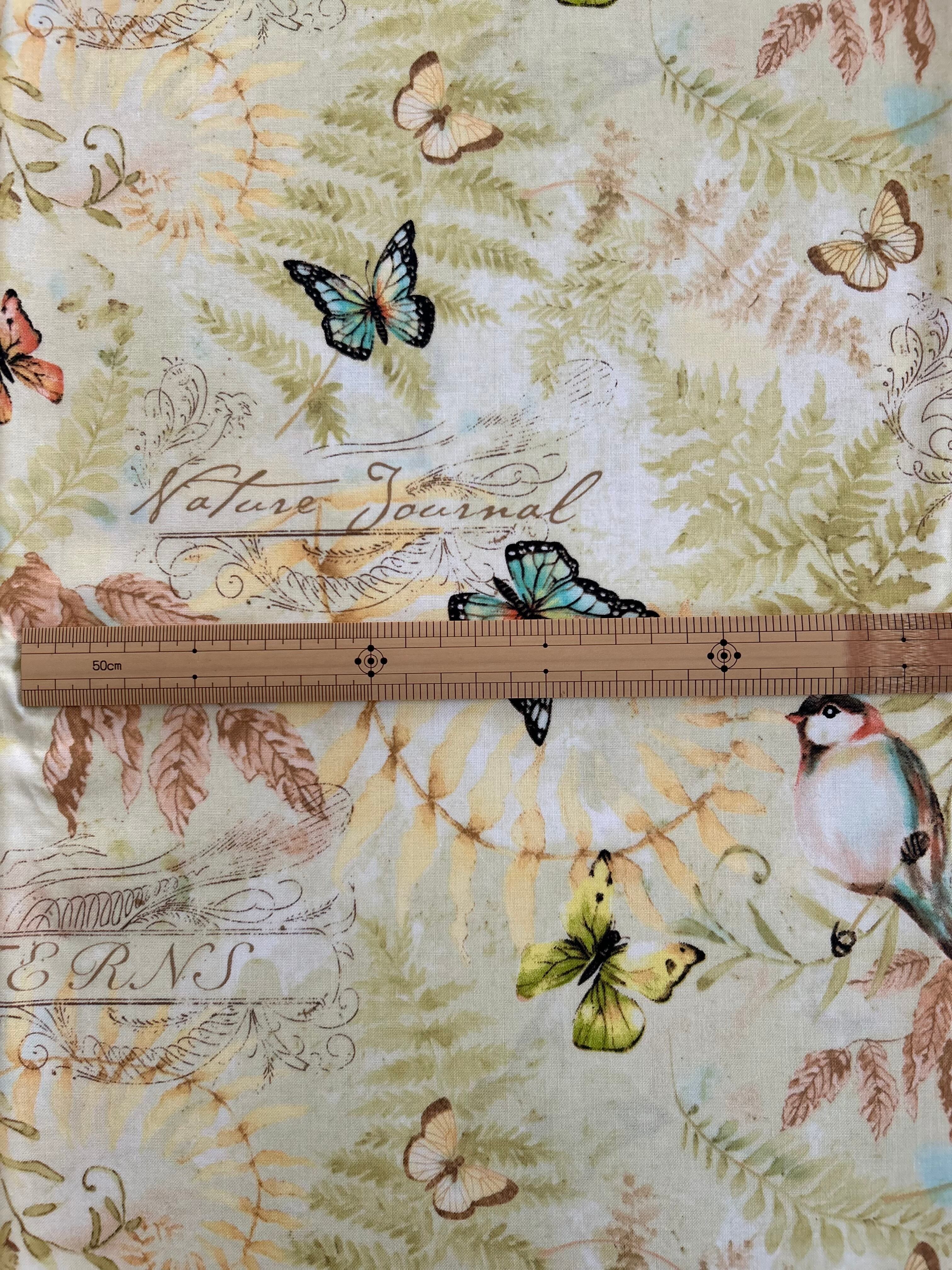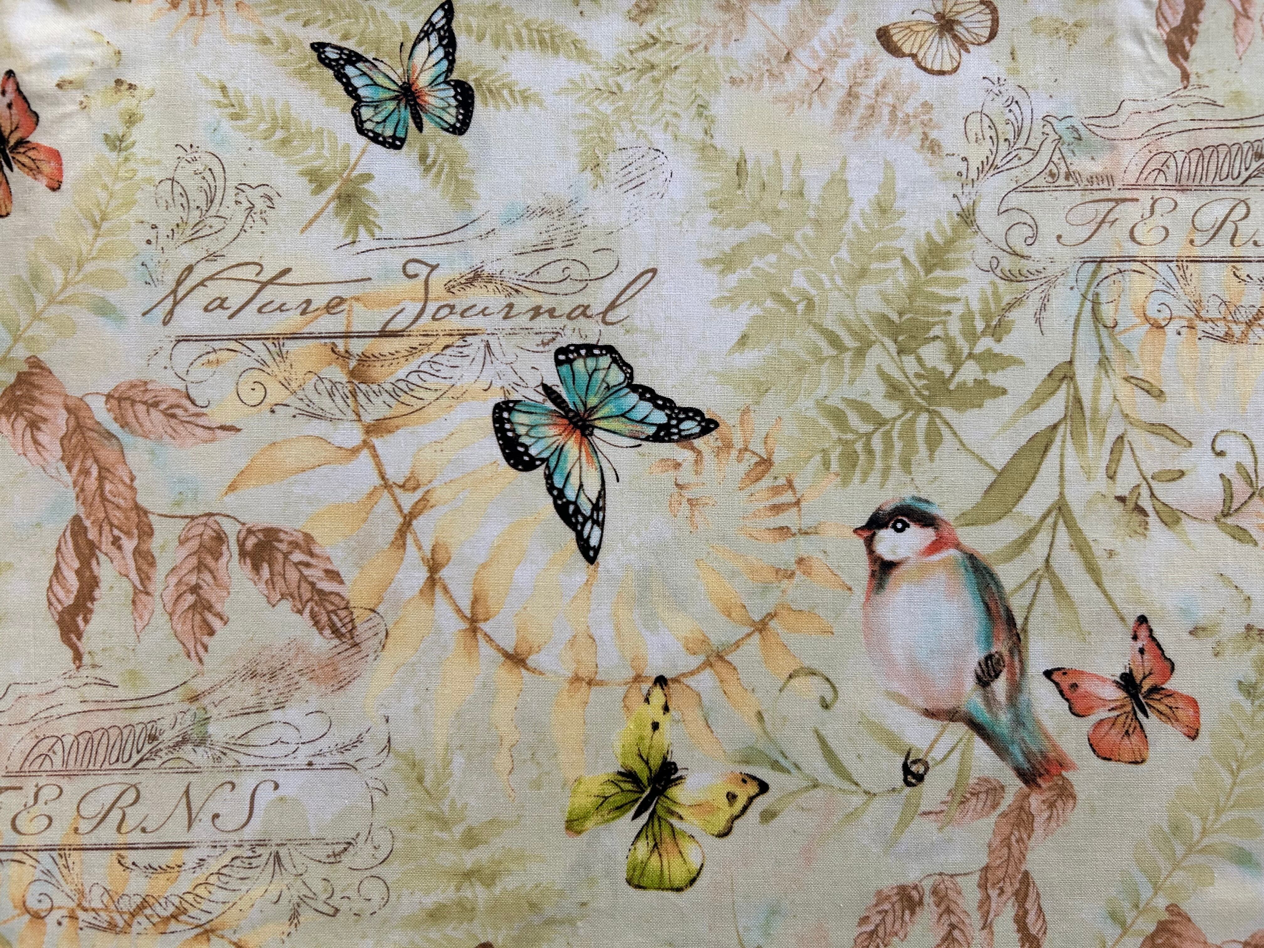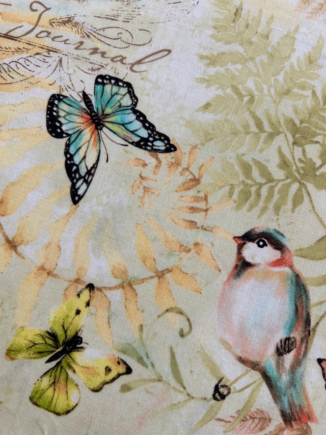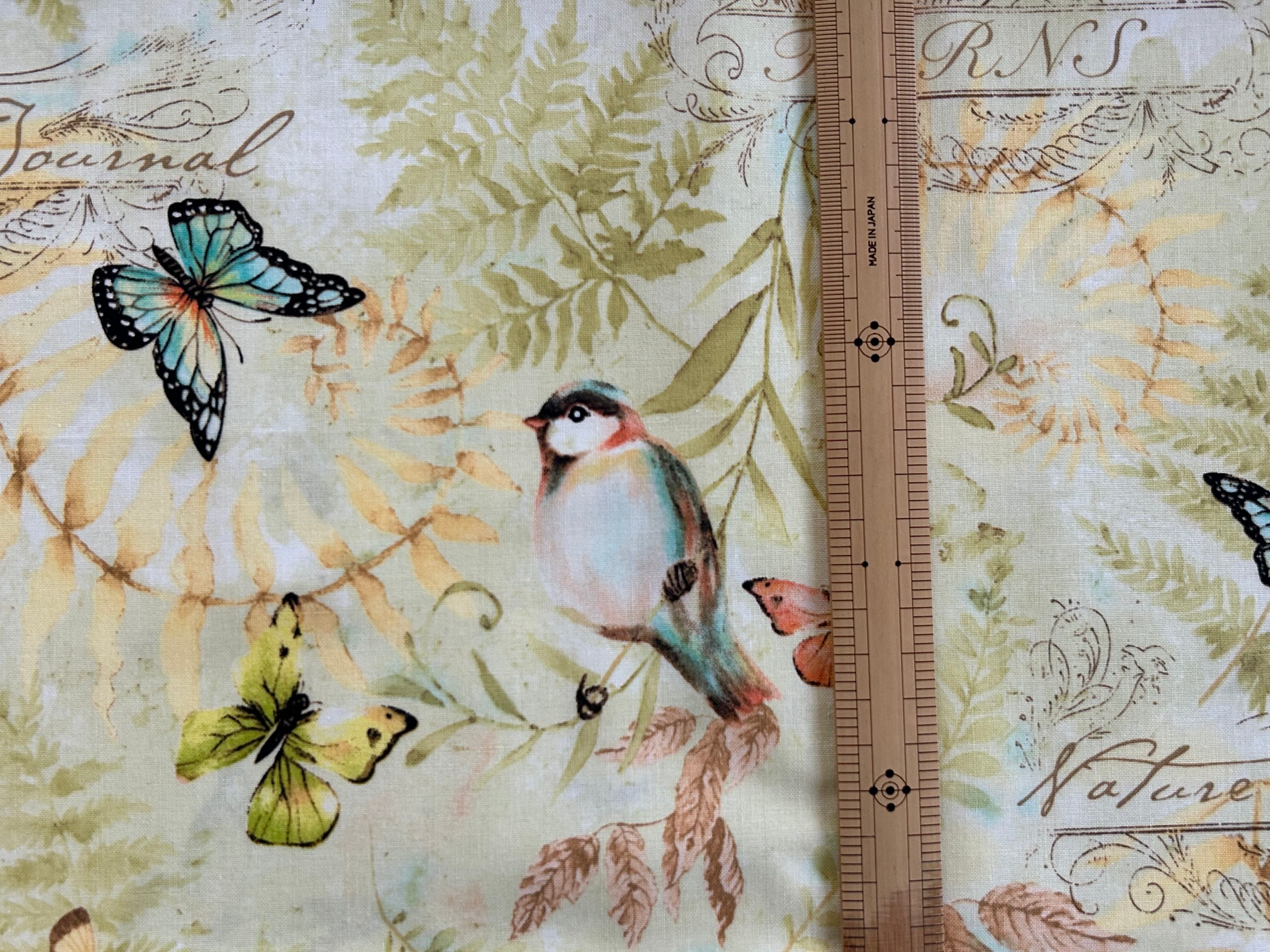 輸入コットンファブリック USA Fems And Butterflies Sanctuary パピヨン 蝶々 リーフ 小鳥柄 カルトナージュ