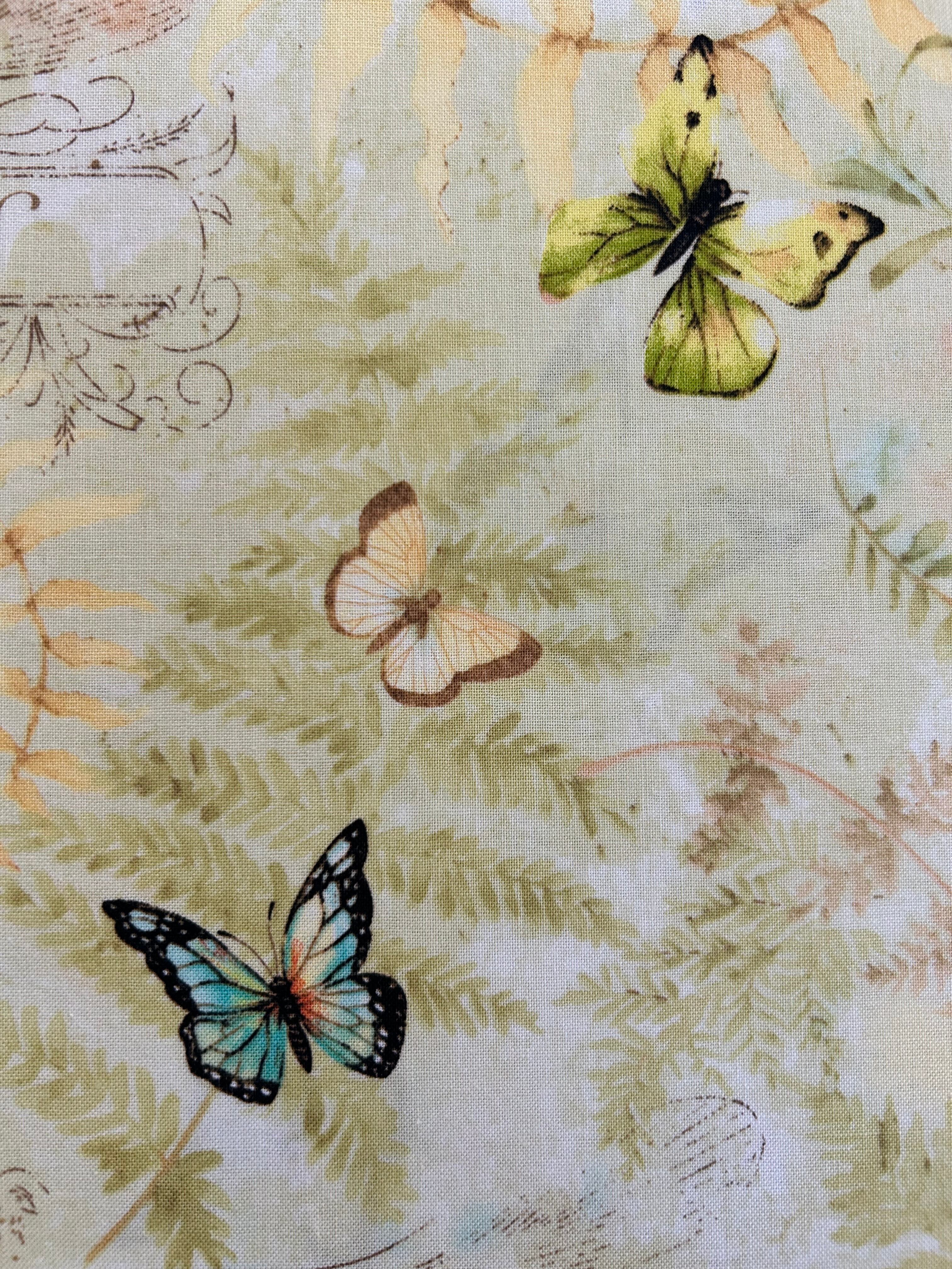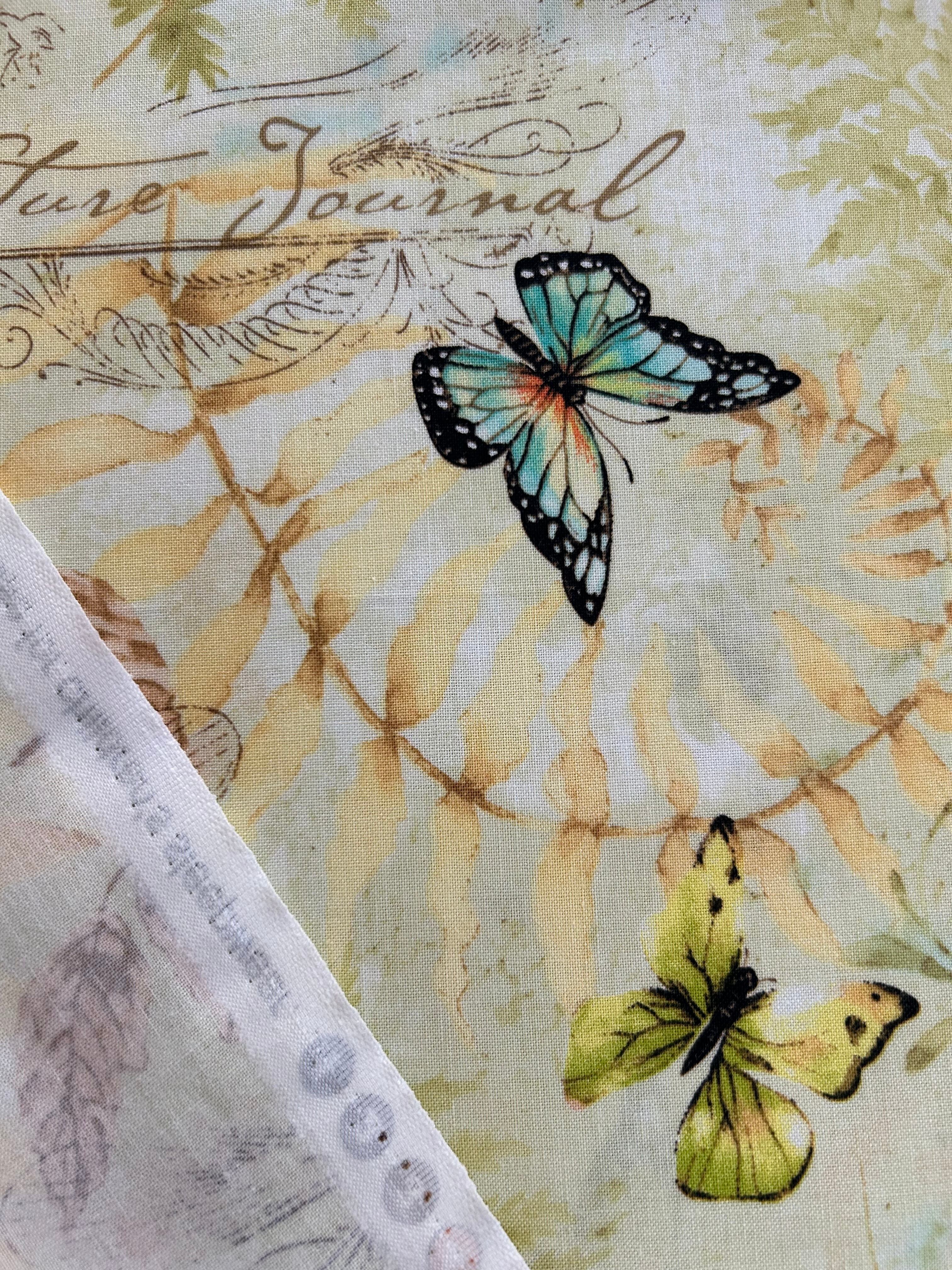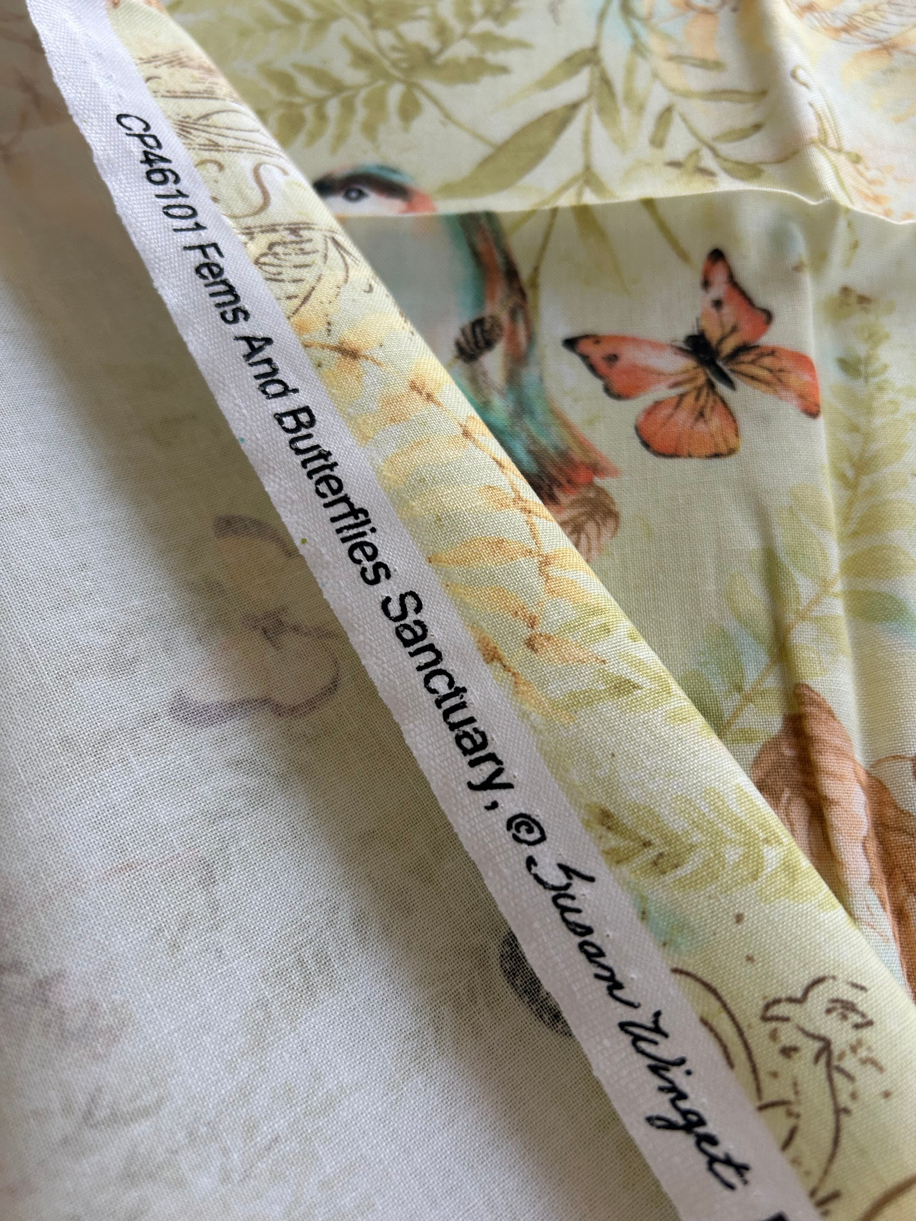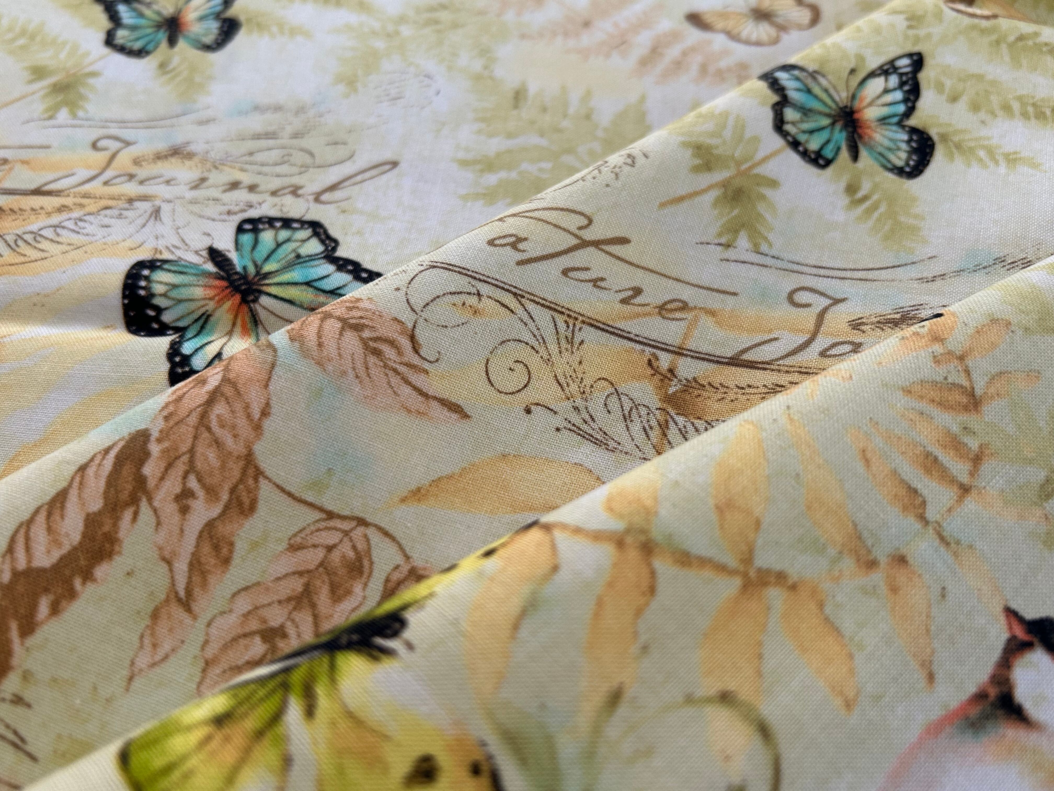 輸入コットンファブリック USA Fems And Butterflies Sanctuary パピヨン 蝶々 リーフ 小鳥柄 カルトナージュ
